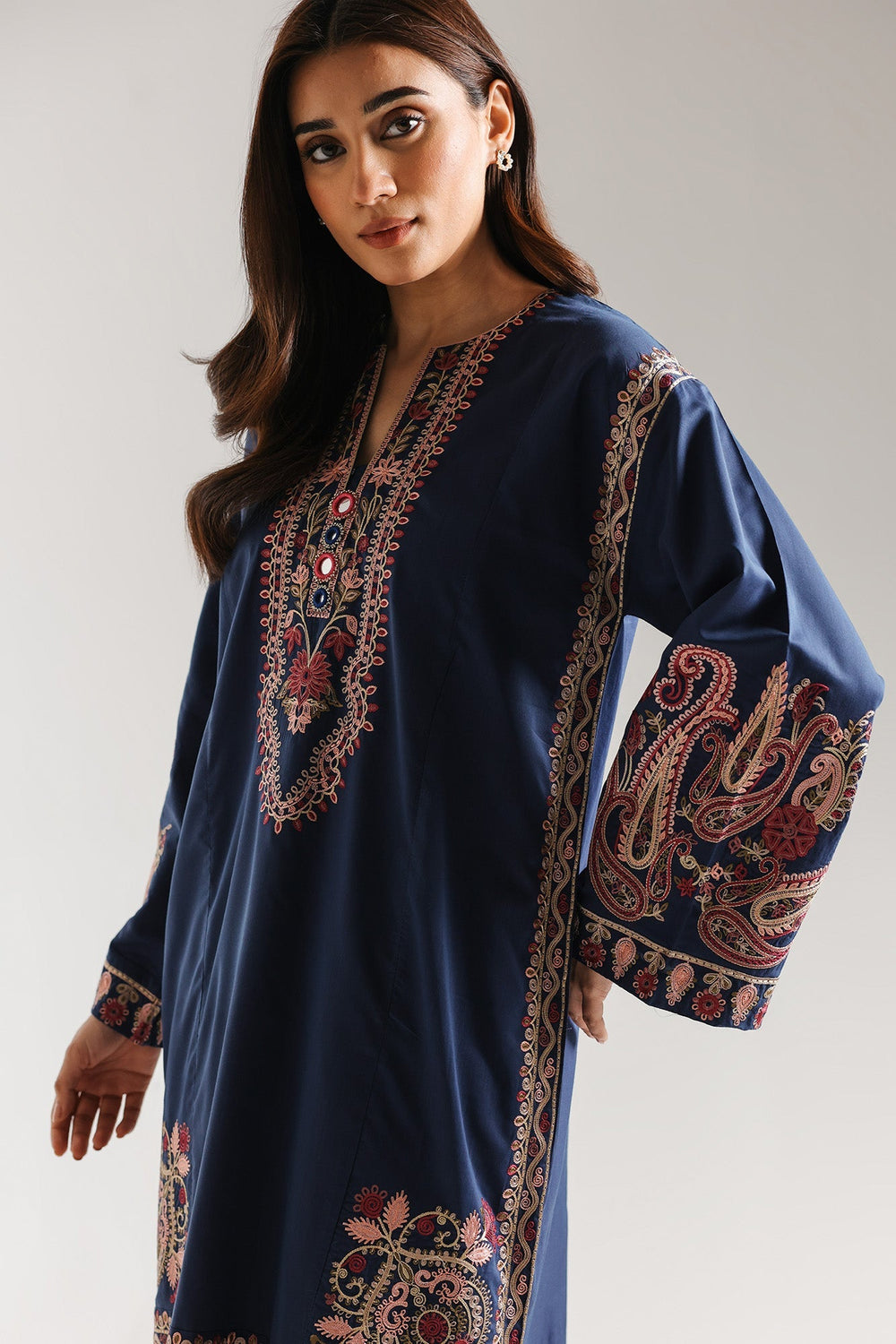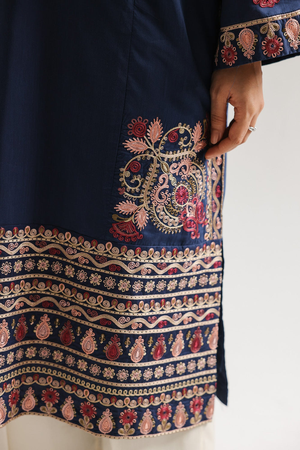 Immerse yourself in a look of deep, regal sophistication with this exquisite two-piece ensemble, rendered in a rich midnight blue that serves as a luxurious canvas for traditional artistry. The shirt is a masterclass in artisanal detail, featuring a central ornate embroidered panel along the V-neckline, adorned with intricate floral motifs and delicate beadwork. Vibrant pink and cream botanical patterns bloom across the hem and long, straight-cut sleeves, framed by rhythmic geometric borders that add a structured, high-fashion finish. This high-contrast top is harmoniously balanced by ivory wide-leg trouser featuring a bold black-and-pink embroidered border at the hem, creating a seamless and elongated profile. Whether styled for a festive cultural event or a refined evening social, this suit provides a presence that is both artistically resonant and undeniably elegant.