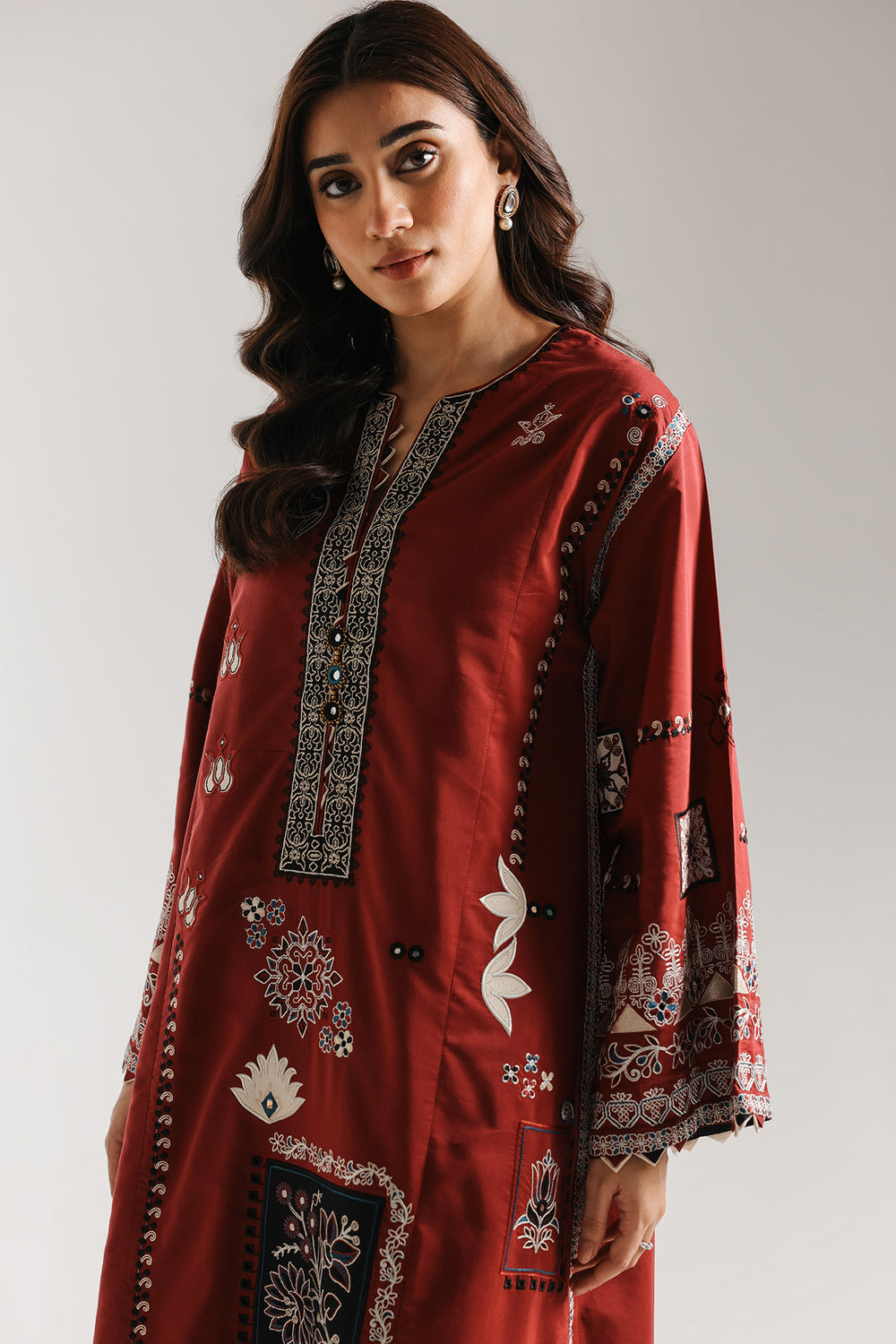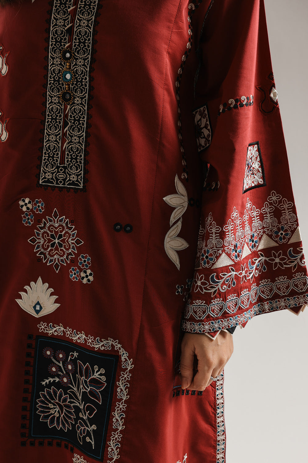 Step into a narrative of traditional elegance with this deep crimson red two-piece ensemble, designed for the woman who appreciates fine, cultural details. The straight-cut shirt features a sophisticated notched V-neckline adorned with a monochromatic embroidered border that flows into a unique, patchwork-style central print. Intricate geometric and botanical motifs in ivory and charcoal dance across the fabric, complemented by embroidered hemline borders and coordinating details on the long, structured sleeves. This artisanal top is masterfully paired with printed wide-leg trouser featuring a delicate black-and-ivory leaf pattern, creating a seamless blend of bold color and refined texture. Perfect for festive daytime social gatherings or sophisticated evening affairs, this suit offers a presence that is both timelessly traditional and undeniably modern.