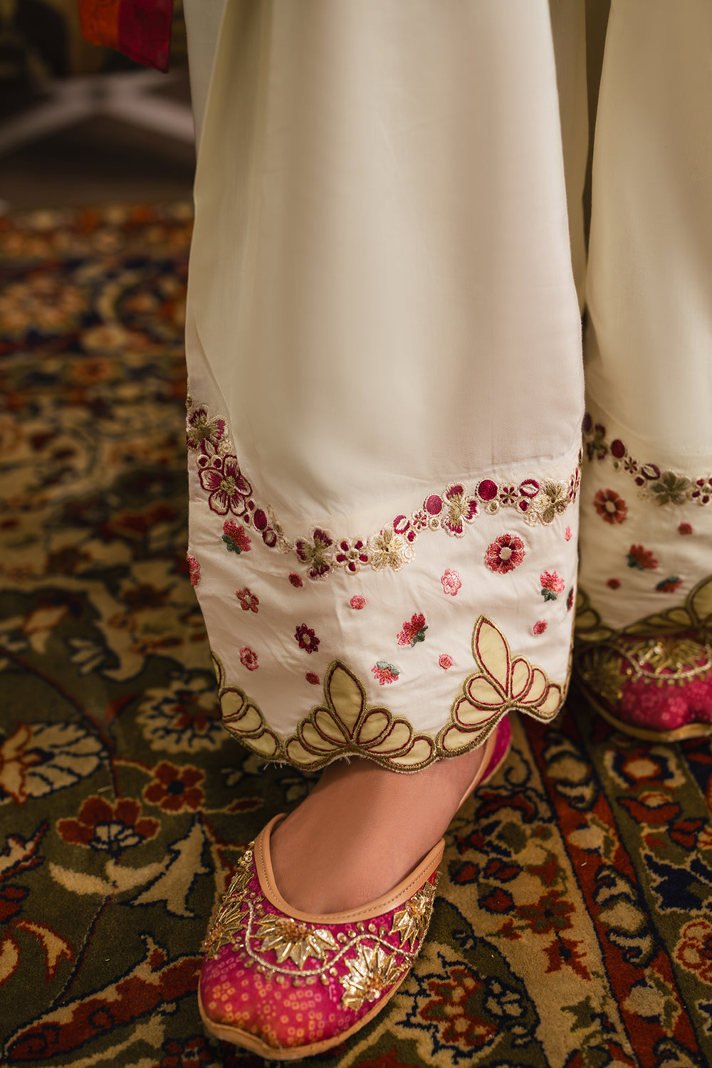 This elegant embroidered suit harmonizes natural earth tones with striking accent details. The sage green kameez features delicate floral embroidery complemented by a refined V-neckline with intricate threadwork and a scalloped laser-cut hemline that demonstrates precision craftsmanship. The coordinating cream-colored wide-leg palazzo pajamas are anchored by substantial embroidery at the hem with matching scalloped edges, creating visual continuity throughout the ensemble. The accompanying dupatta serves as a bold contrast piece, crafted in silk or chiffon with geometric zigzag borders and floral patterns in red, black, and cream that elevate the overall composition. This sophisticated three-piece ensemble is ideal for festive celebrations and formal occasions where layered elegance is desired.