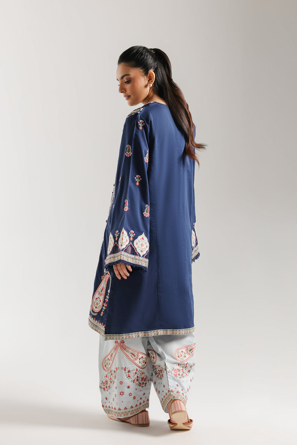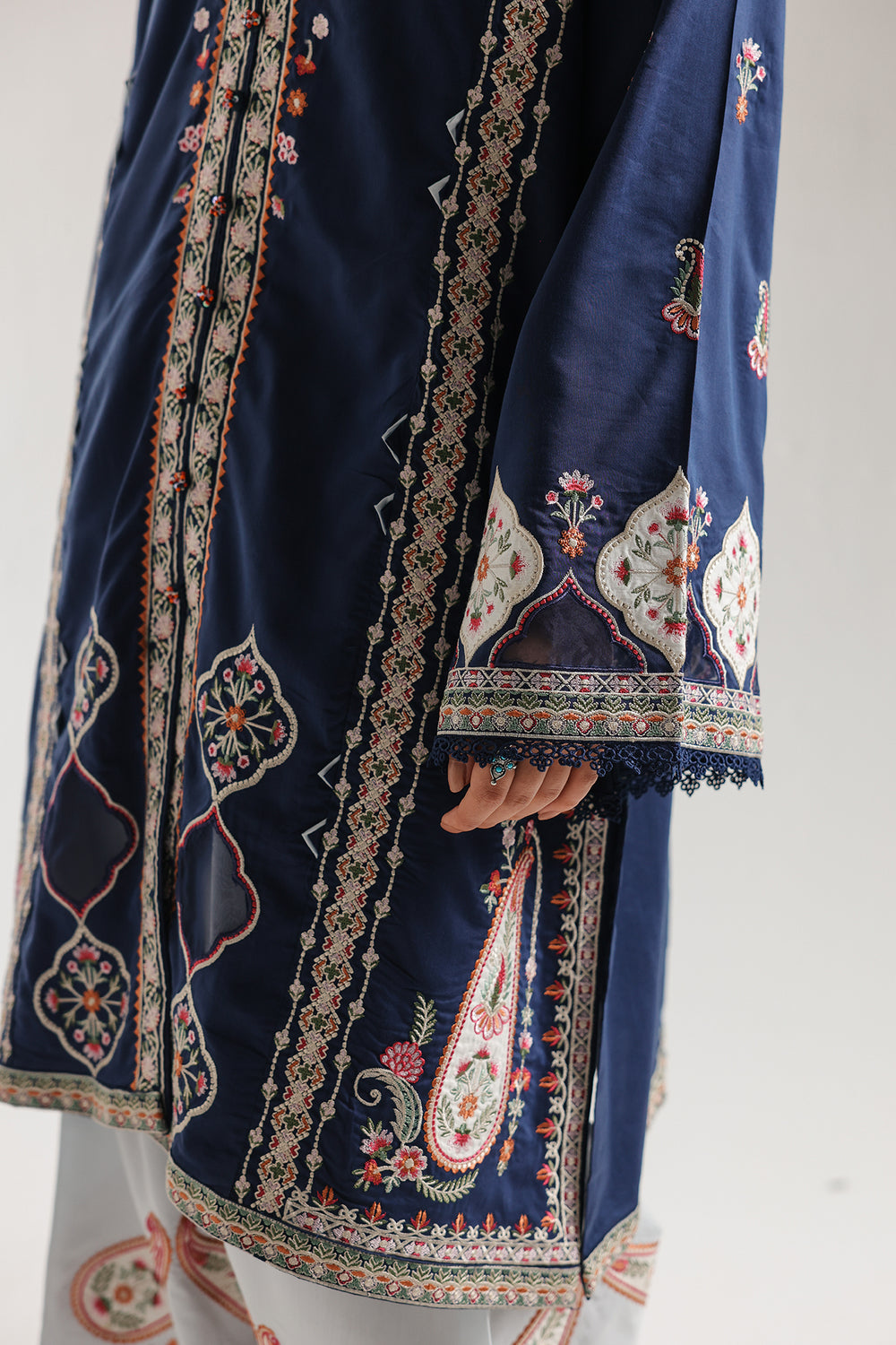 Exude regal sophistication in this deep navy embroidered suit. The long tunic is adorned with vertical geometric patterns and delicate floral motifs, creating a flattering silhouette. Paired with soft grey shalwar featuring striking paisley and small dainty flower embroidery, this ensemble perfectly blends traditional artistry with a refined, modern aesthetic.