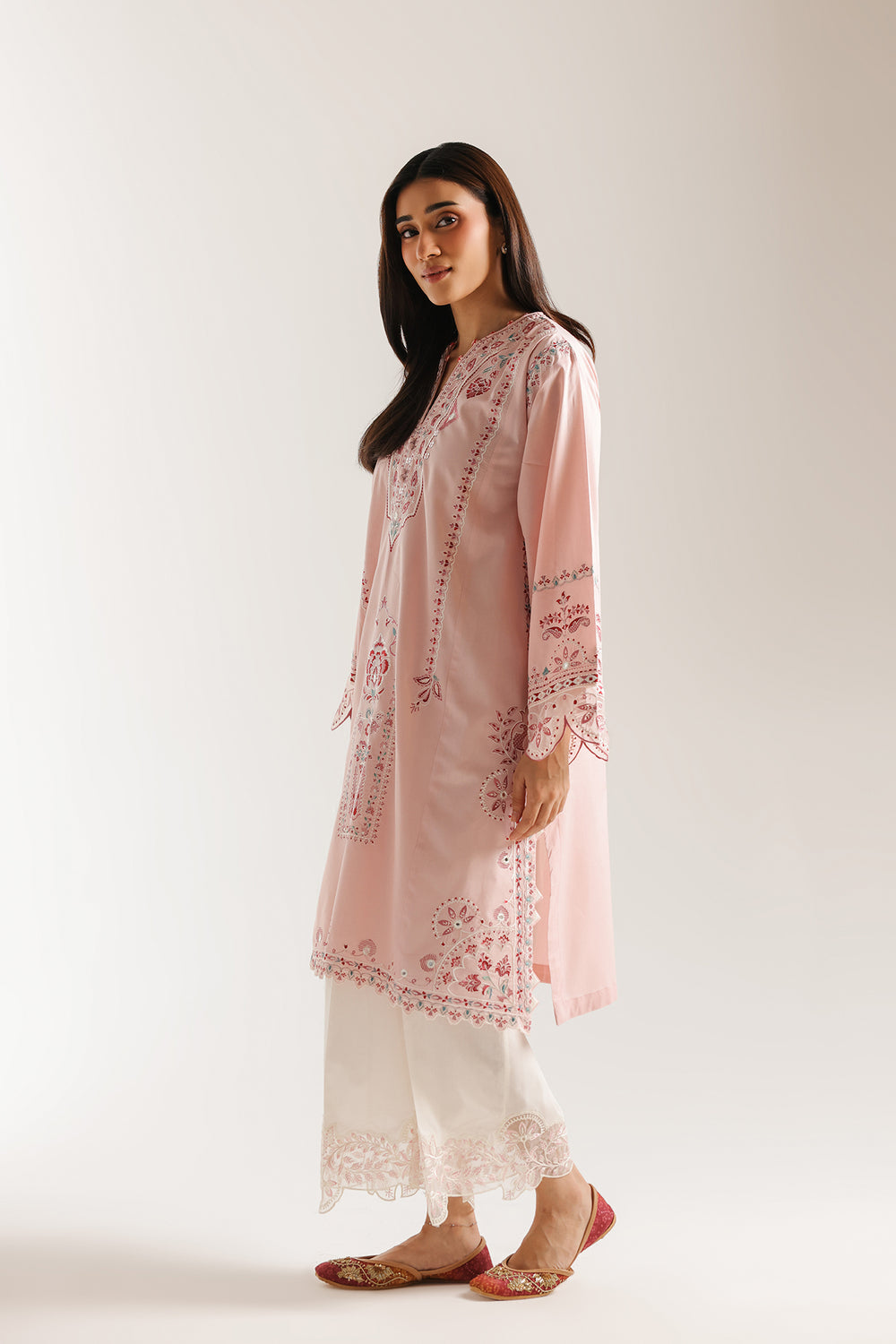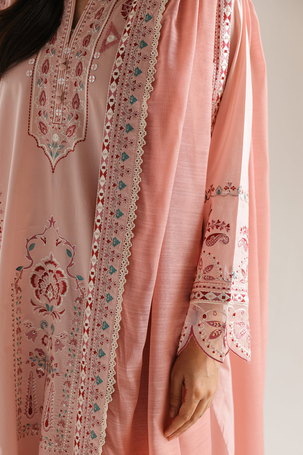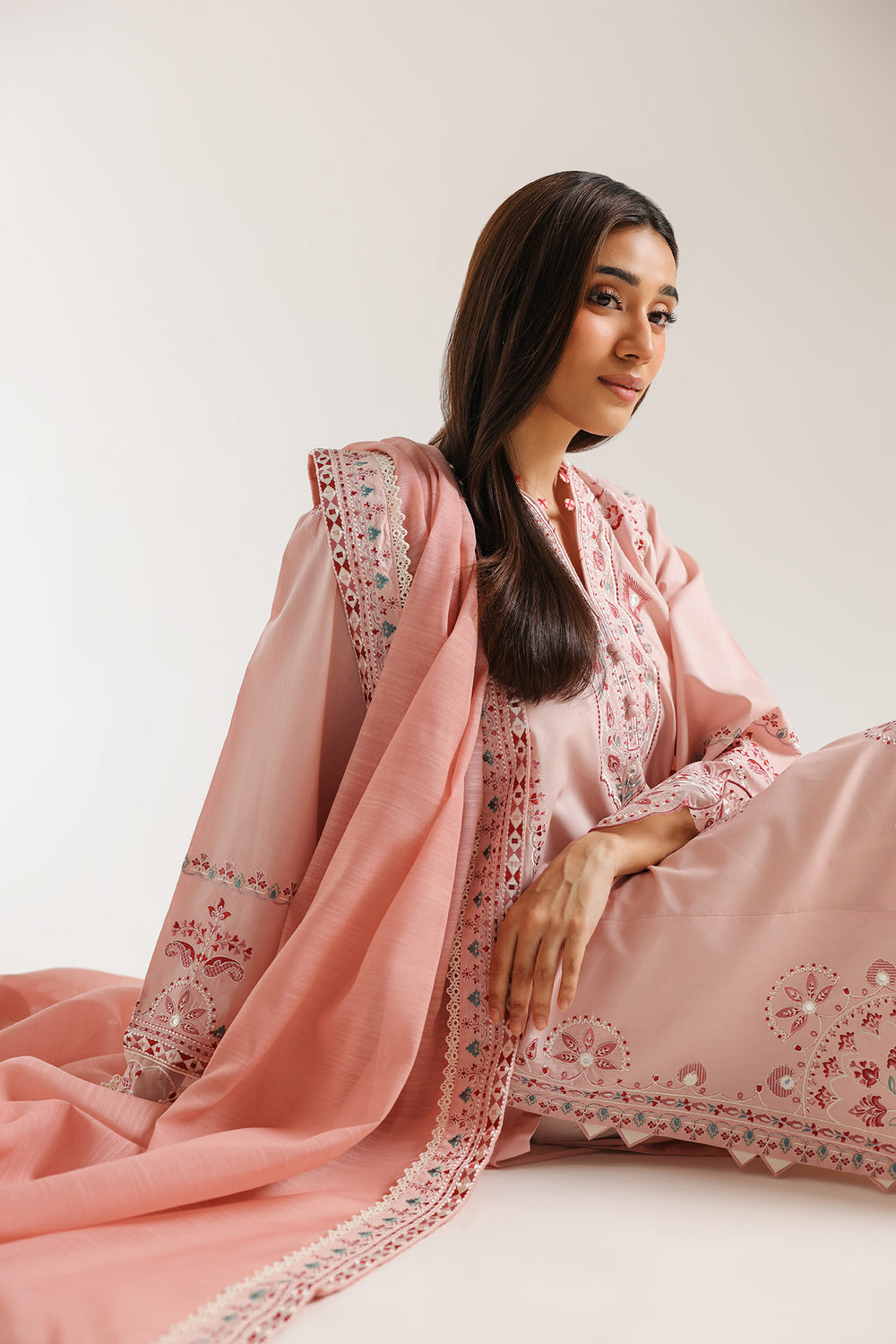 Experience sheer elegance with this enchanting three-piece pink embroidered suit. The tunic features intricate artisanal embroidery and delicate accents, beautifully complemented by scalloped lace borders on the sleeves and hem. Paired with a matching dupatta and laser-cut ivory trouser, this ensemble is a perfect choice for festive celebrations.