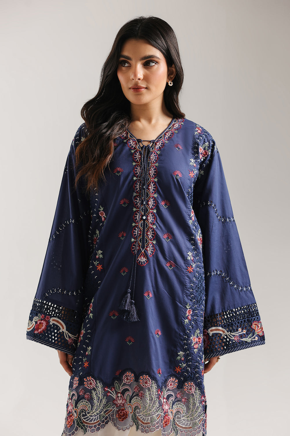 Embrace celestial charm with this stunning embroidered suit, rendered in a deep, lustrous midnight blue. This ensemble is a celebration of intricate textures, featuring a tunic adorned with delicate floral sprigs and a magnificent, multi-colored embroidered hem. The artisan-style scalloped borders and lace-insert sleeves offer a breezy, bohemian aesthetic without sacrificing luxury. Paired with crisp white farshi shalwar featuring scattered floral embroidery and a coordinated hem, this look is perfect for the woman who values artistic detail. The neckline, finished with a playful tassel detail, adds the final touch of effortless elegance.