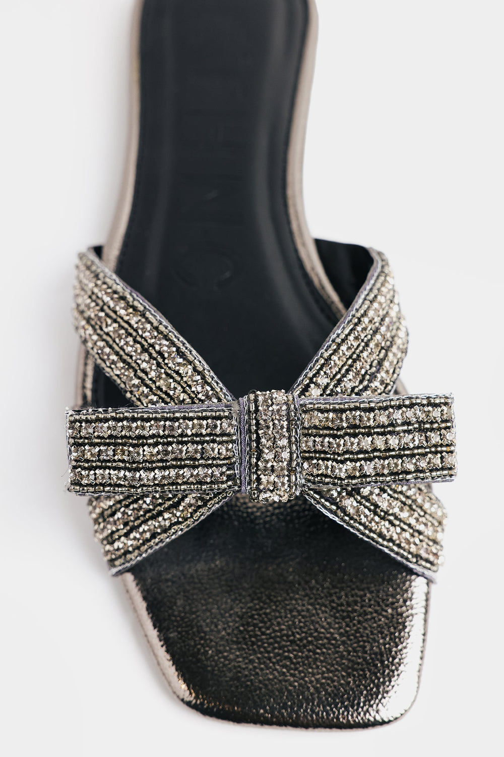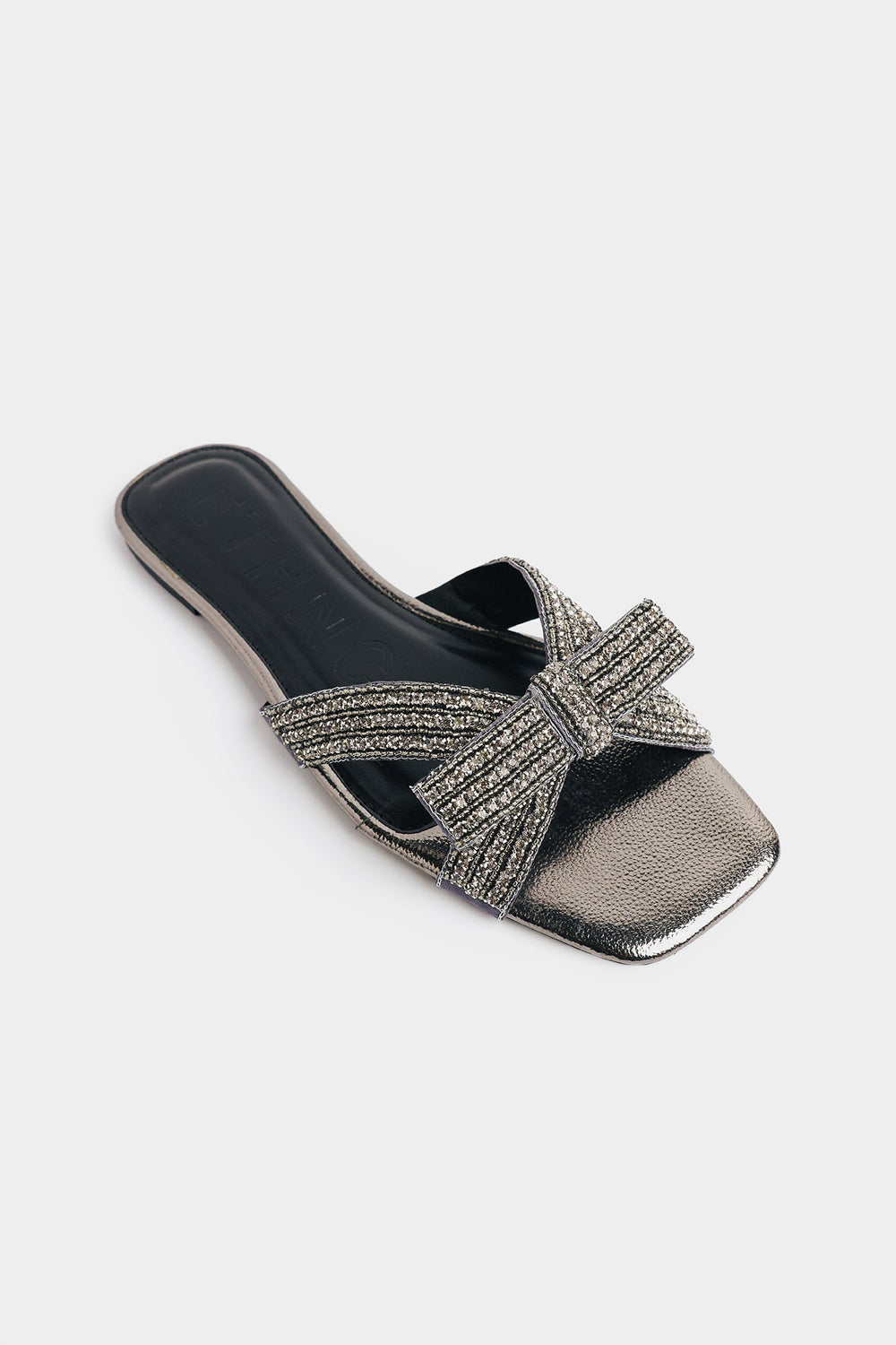 Step into shimmer and sass with these show-stopping slides! Featuring a sleek metallic pewter finish with a textured cracked-leather footbed, they're anything but ordinary—a jaw-dropping multi-layered bow adorned with densely packed shimmering crystals that catch light from every angle. The modern square-toe silhouette keeps things contemporary and cool, while the padded black footbed ensures all-day comfort. Perfect for elevating your casual looks with a touch of sparkle and personality.