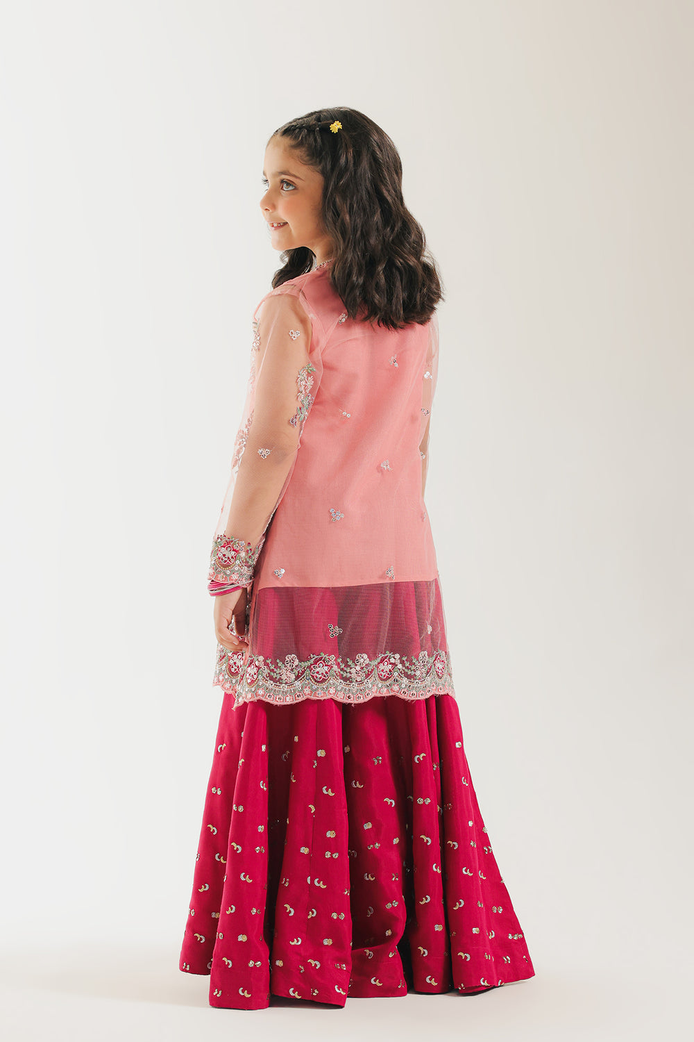 Dress your little girl in this enchanting and festive embroidered suit set. The sheer poly net shirt, in a delicate soft pink, is exquisitely adorned with intricate silver embroidery and shimmering sequins in beautiful floral and vine patterns. This detailed top is paired with a vibrant fuchsia flapper , which features a bold, flowing silhouette and is embellished with scattered silver sequins for a magical sparkle. Worn with a matching slip, this three-piece suit is the perfect choice for a grand celebration, ensuring a look that is both traditional and delightfully charming.