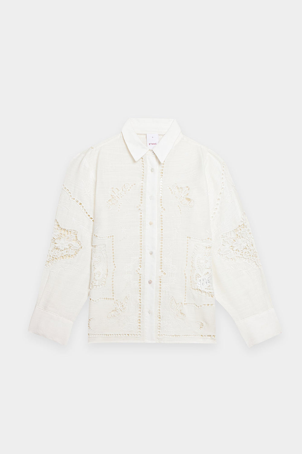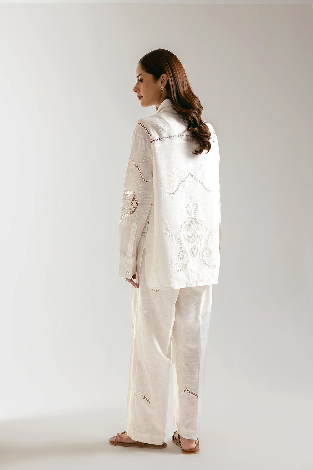 Elevate your everyday style with this classic button-down white shirt and a matching trouser, featuring intricate cutwork embroidery. This delicate detailing adds a level of sophistication and subtle visual interest, enhancing the classic silhouette with a unique texture and design. The lace-like patterns of the embroidery bring depth and an ethereal touch to both pieces. Embrace the perfect harmony of grace and modern minimalism with this casual chic ensemble.