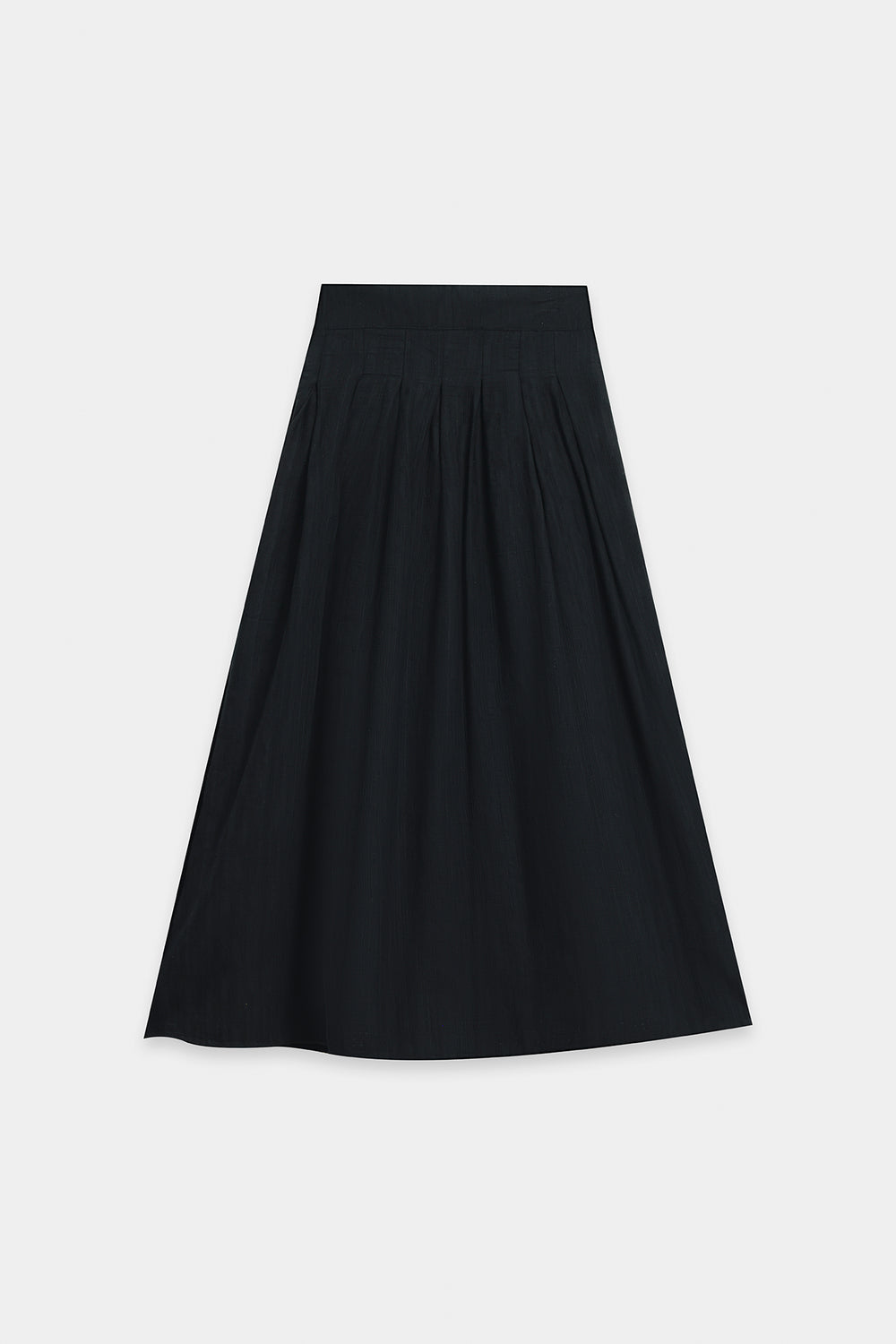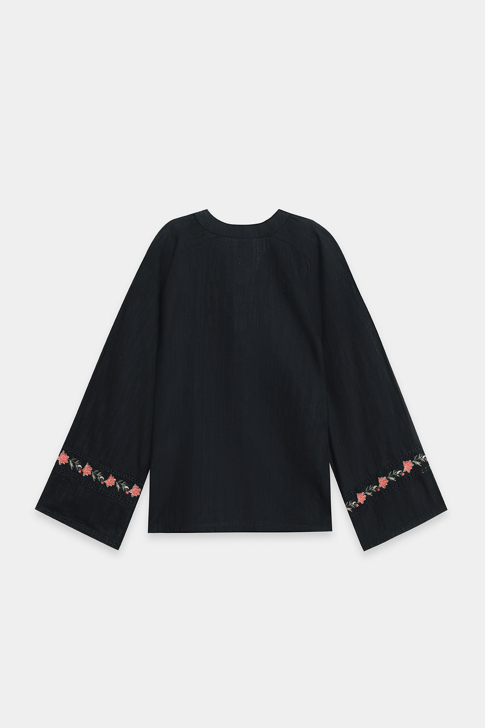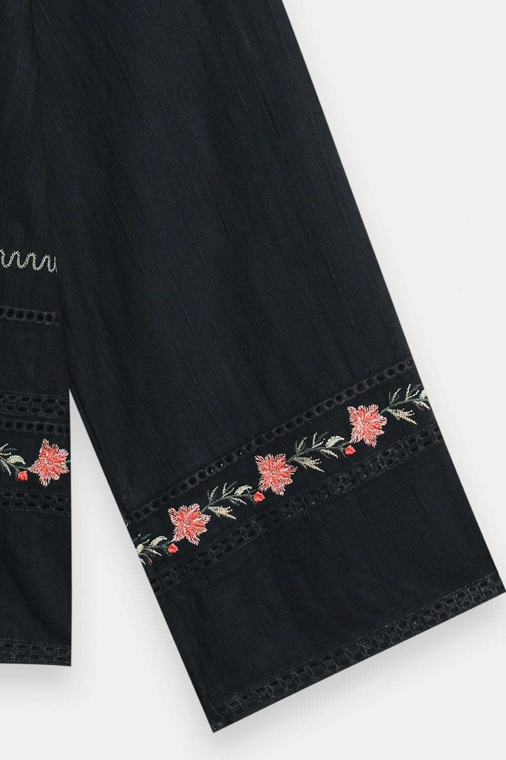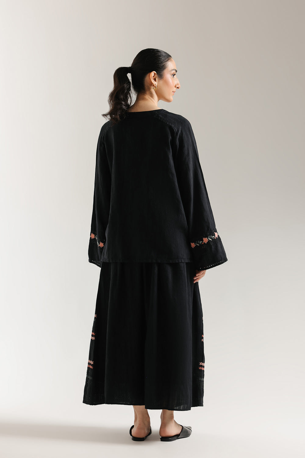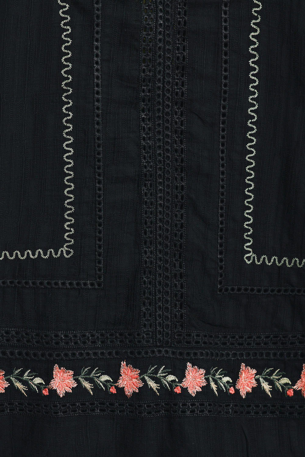 Embrace bohemian elegance with this sophisticated embroidered set. The black ensemble features a relaxed-fit shirt with a classic V-neckline and intricate white stitch detailing, giving a textured, folk-inspired look. Subtle floral embroidery in soft pink and muted orange accents the border at the hemline. The set is completed with a flowing, floor-length skirt in a matching black fabric, featuring delicate embroidered squares along the lower half that echo the floral motifs of the shirt. This suit is the perfect choice for a unique and graceful statement, blending comfort with intricate artistry.