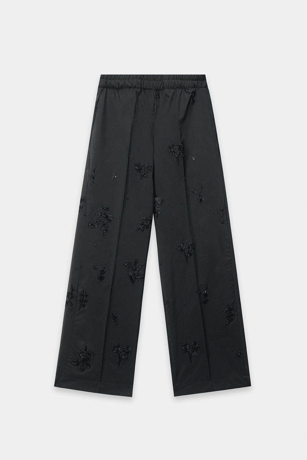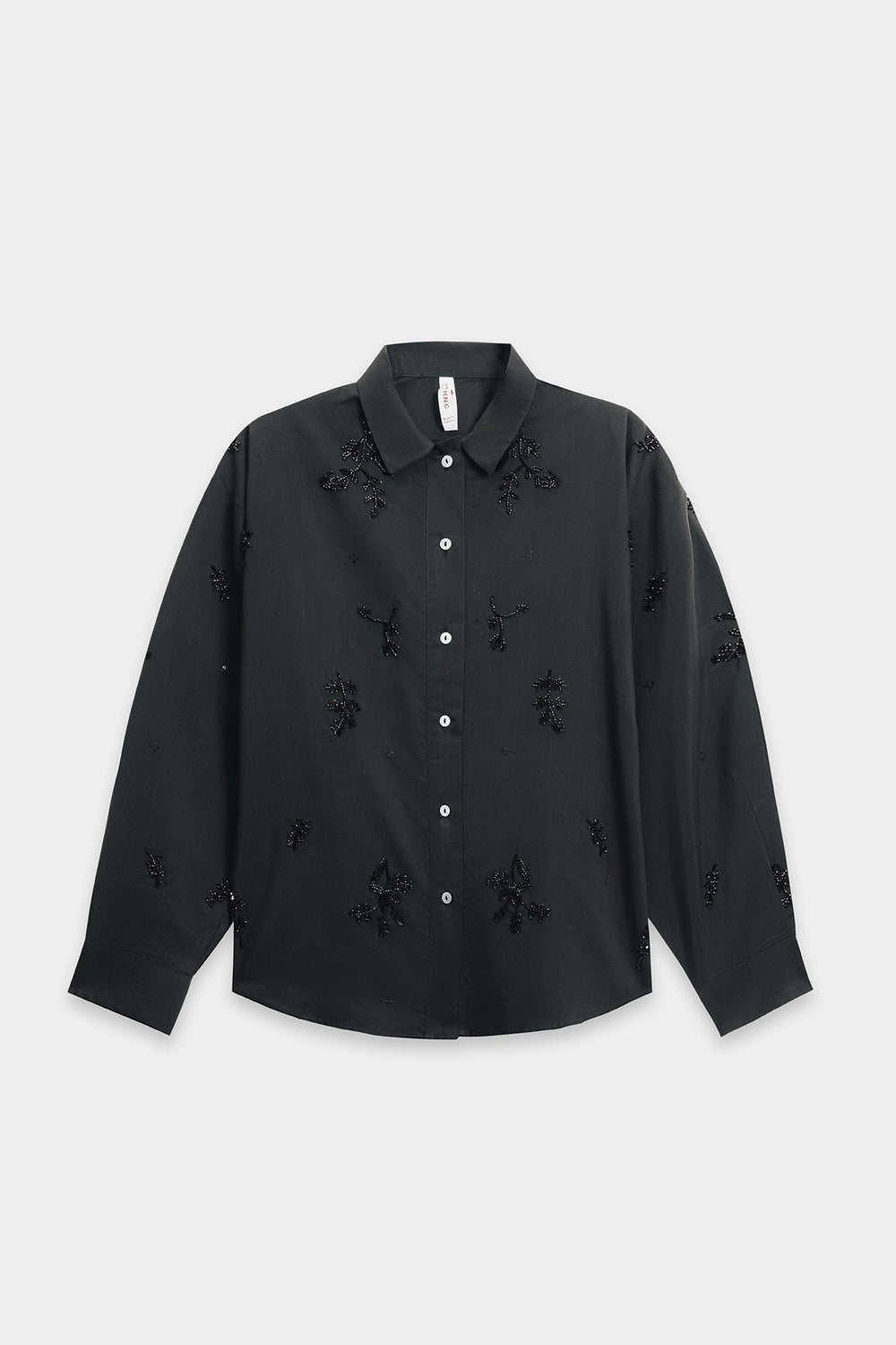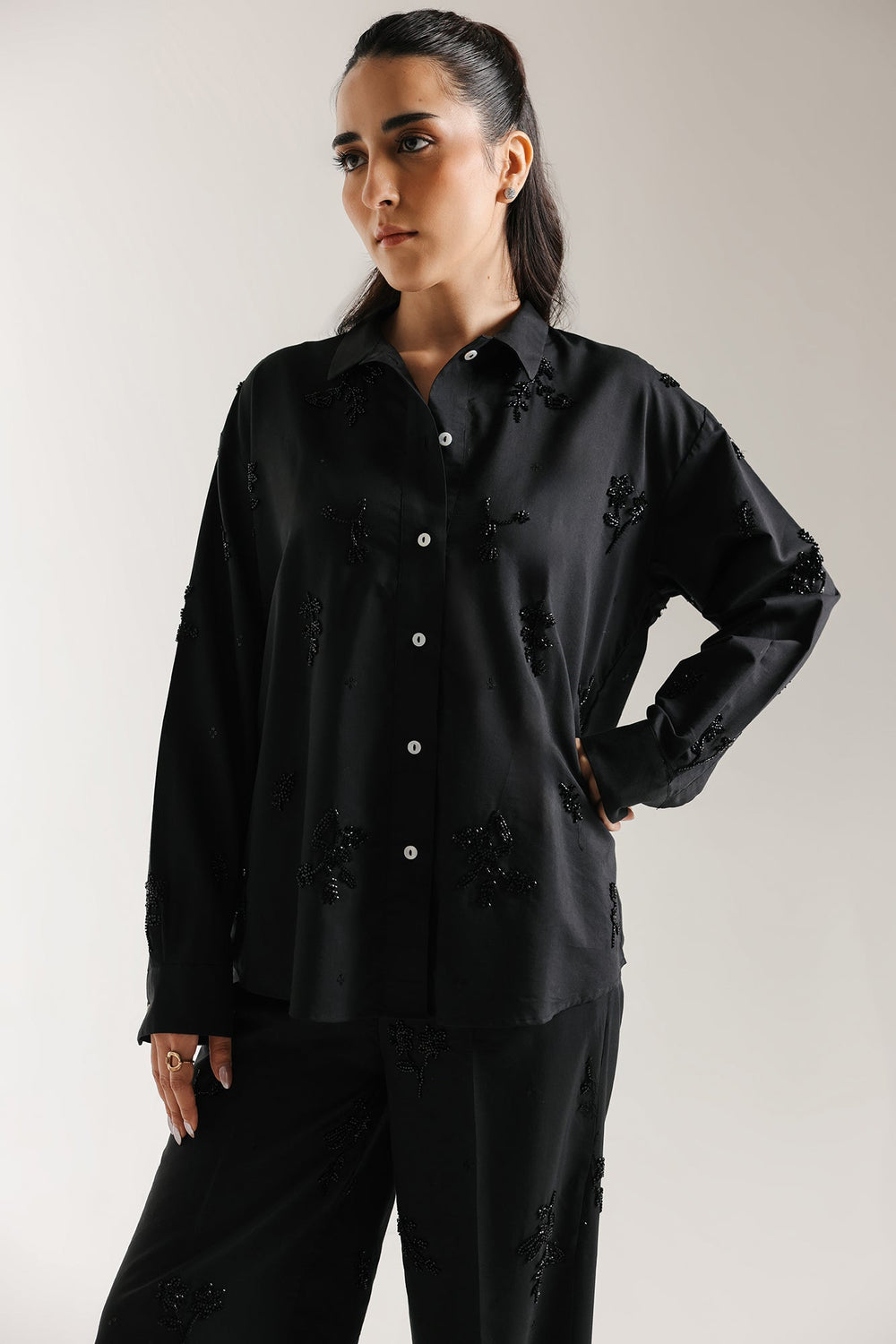 This is a black button-down shirt featuring delicate bead-embellished motifs scattered across the front. The embellishments form small floral and leaf-like patterns, adding a subtle textured shine. It has a classic pointed collar and white buttons that create a clean contrast against the dark fabric, paired with black straight trousers. The overall look is elegant, minimal, and refined—perfect for dressy or semi-formal styling.