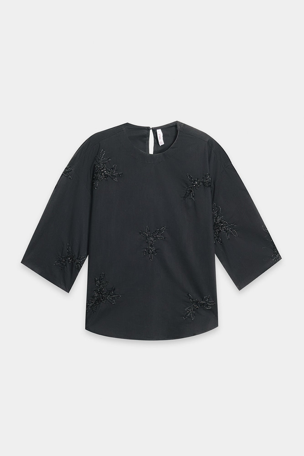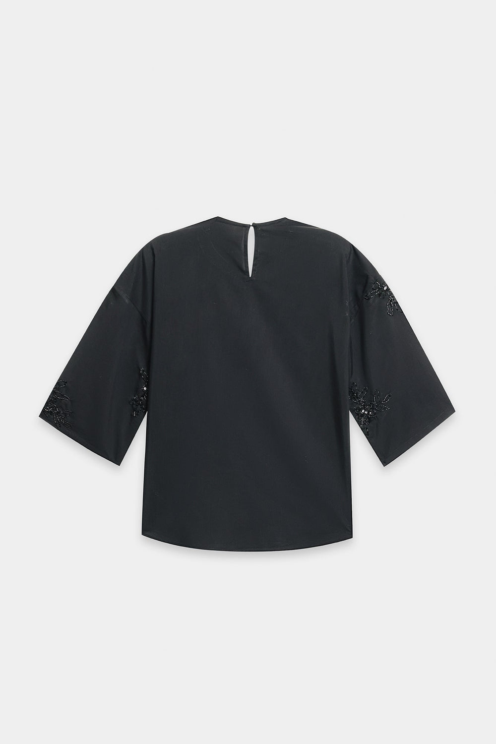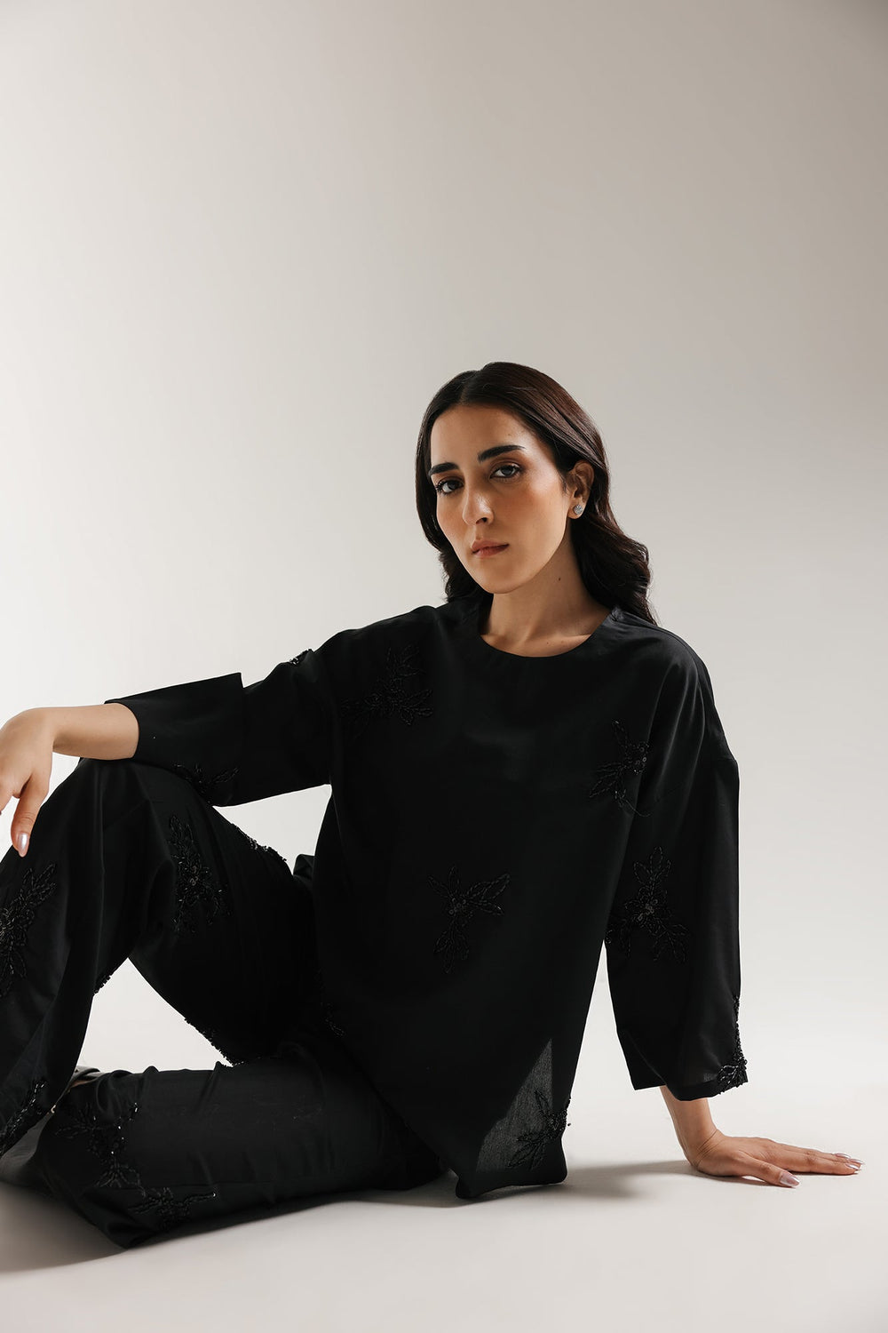 A sophisticated black garment showcasing meticulously placed beaded embellishments that create delicate botanical-inspired designs across the chest. The intricate beadwork on the shirt as well as on the trousers introduces subtle dimensionality and luminosity to the piece. This refined composition balances understated elegance with textural interest, making it an excellent selection for elevated casual or formal occasions