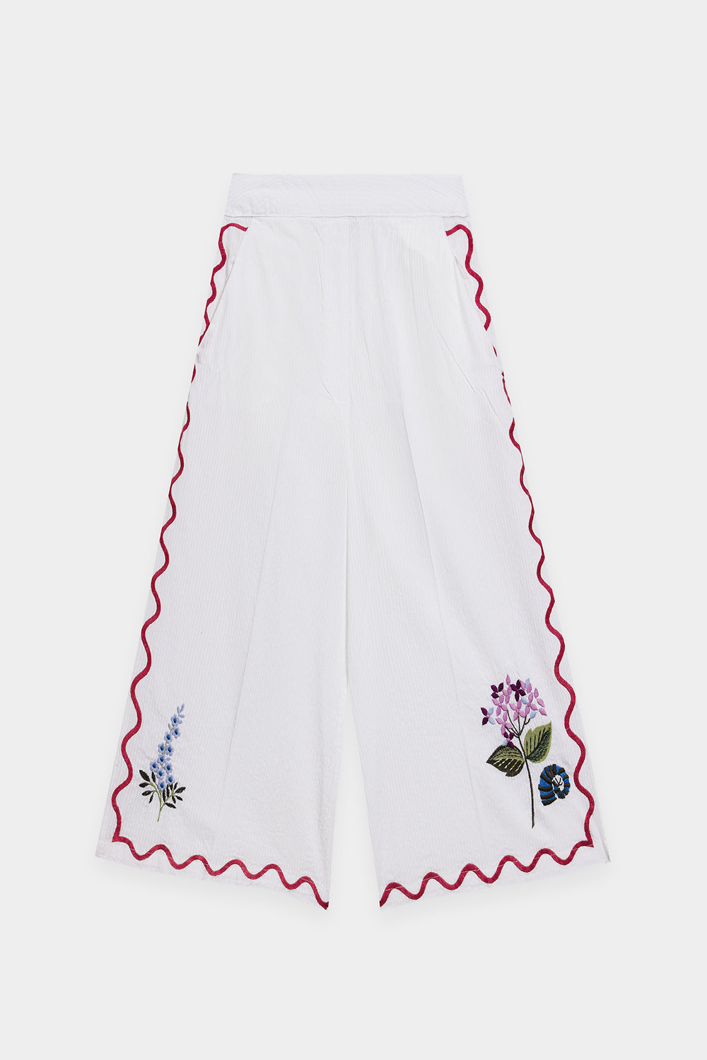 Dive into a whimsical wonderland of design. This enchanting suit is a celebration of artistry, featuring a crisp white fabric adorned with playful floral and celestial motifs outlined in a bold, scalloped red trim. The relaxed-fit shirt and cropped trousers offer a comfortable and carefree silhouette, while the intricate, hand-stitched details add a touch of charming craftsmanship. This ensemble is a perfect blend of modern comfort and artistic expression.