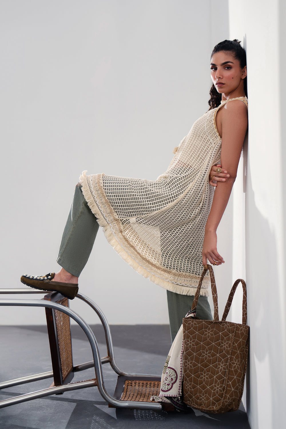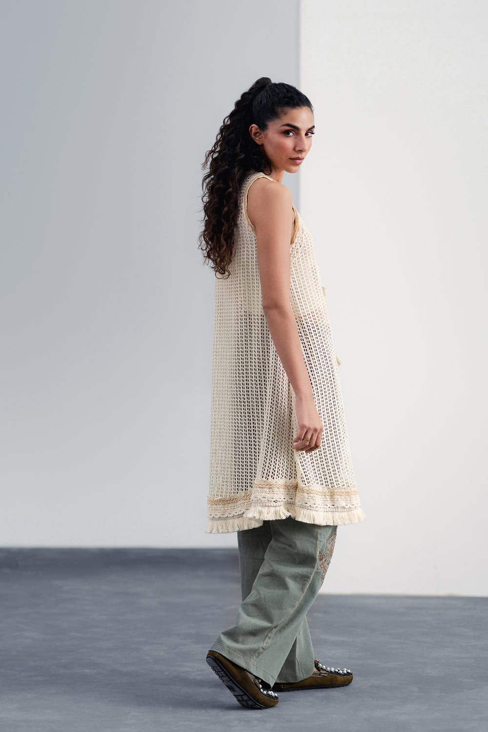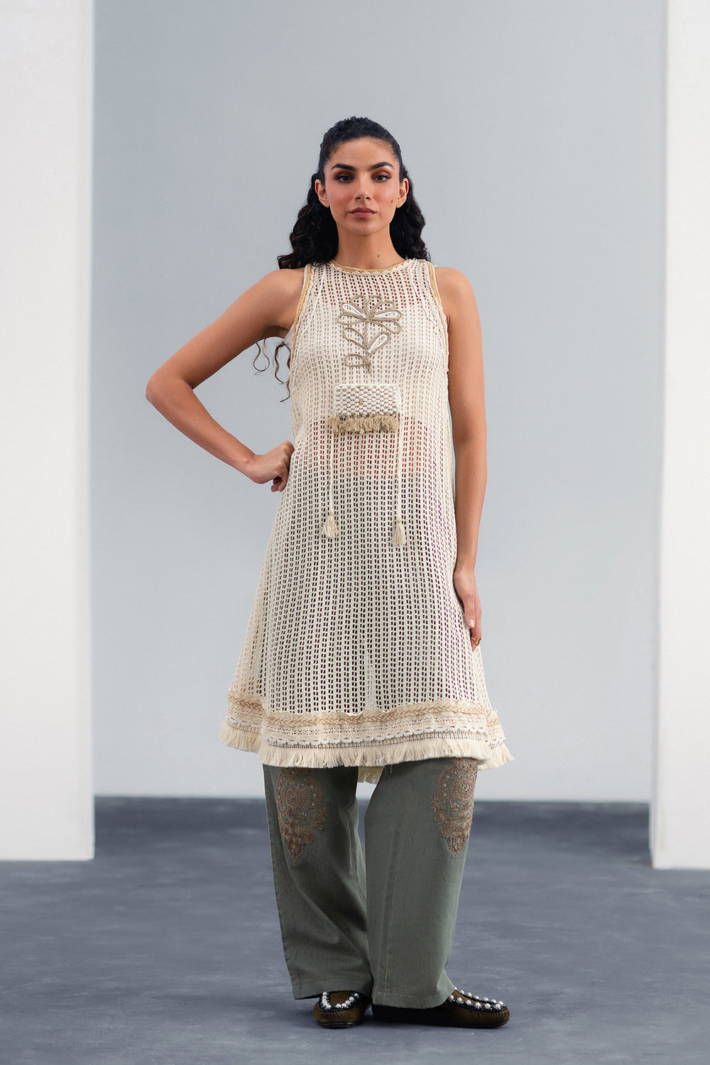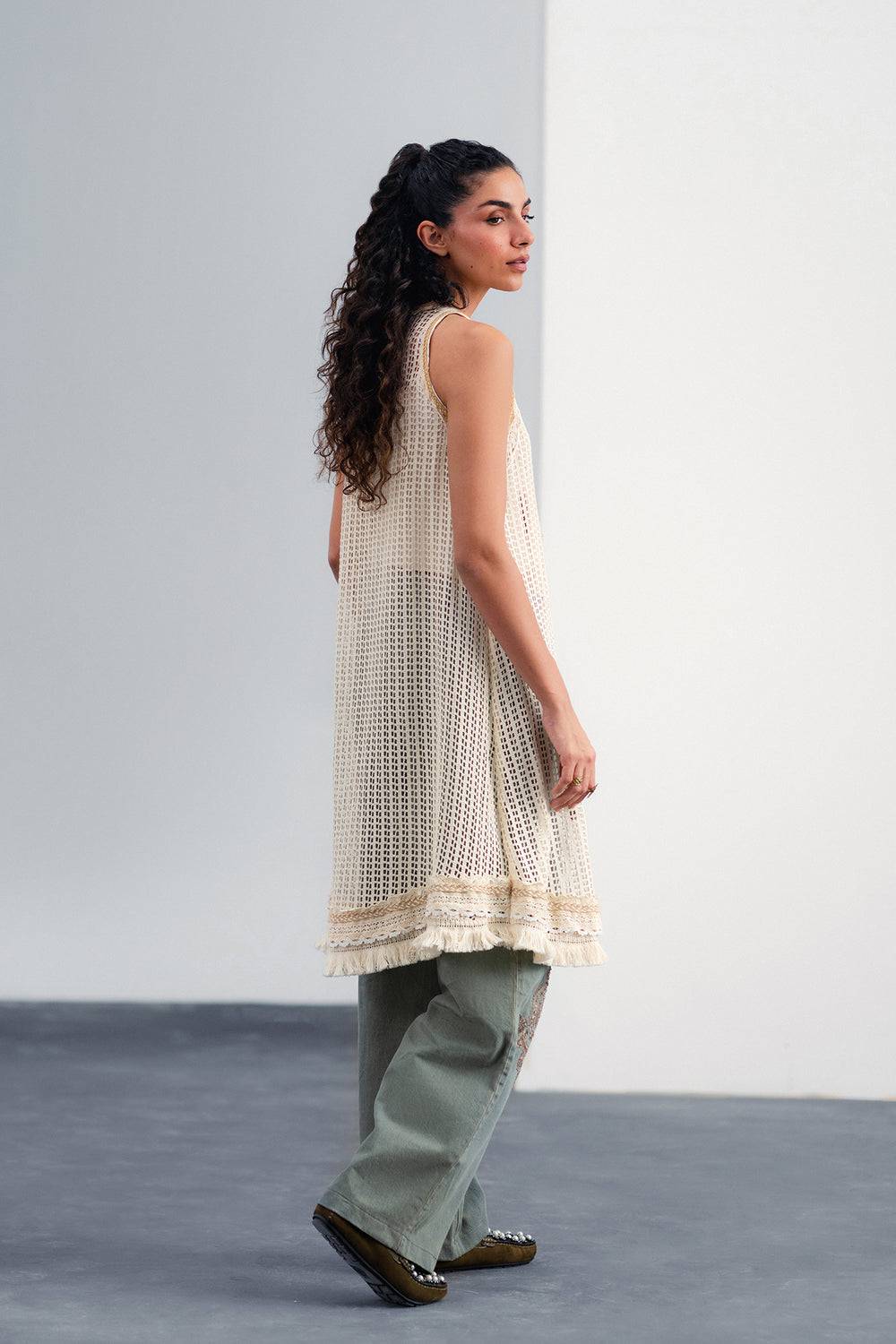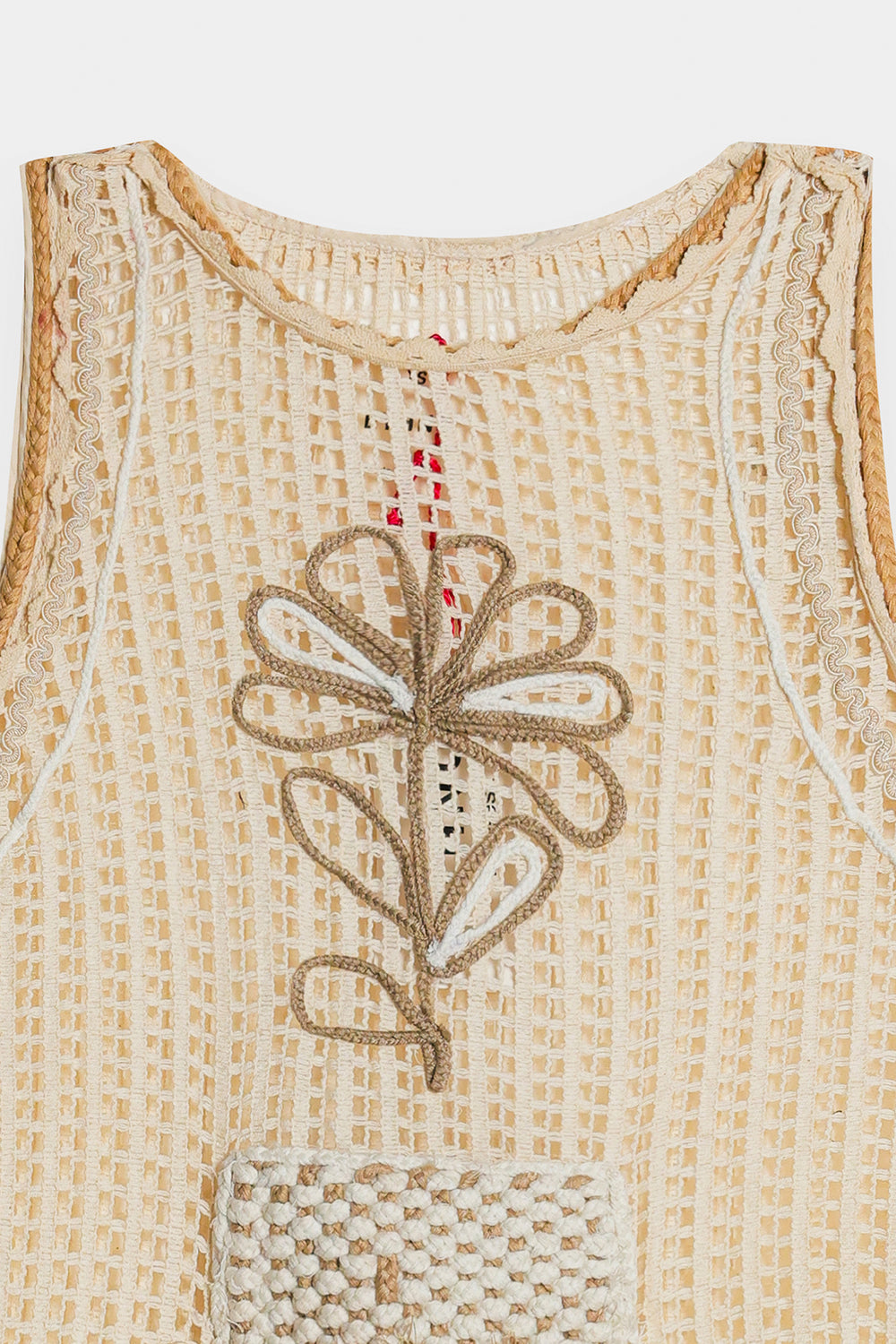 Embrace a free-spirited yet refined style with our timeless-chic dress. This sleeveless dress features a captivating open-knit texture and a flattering A-line silhouette. The eye-catching embroidered motif at the chest adds a touch of bohemian luxury, while the fringed hemline sways with your every move. This versatile piece can be worn as a stand-alone dress or layered over pants for a fashion-forward look. It's the perfect choice for a sunny day out, a weekend getaway, or for adding a touch of effortless style to your everyday.