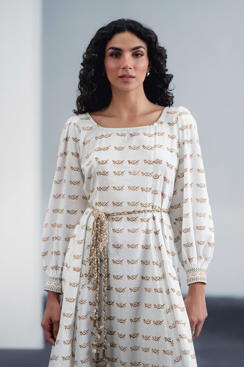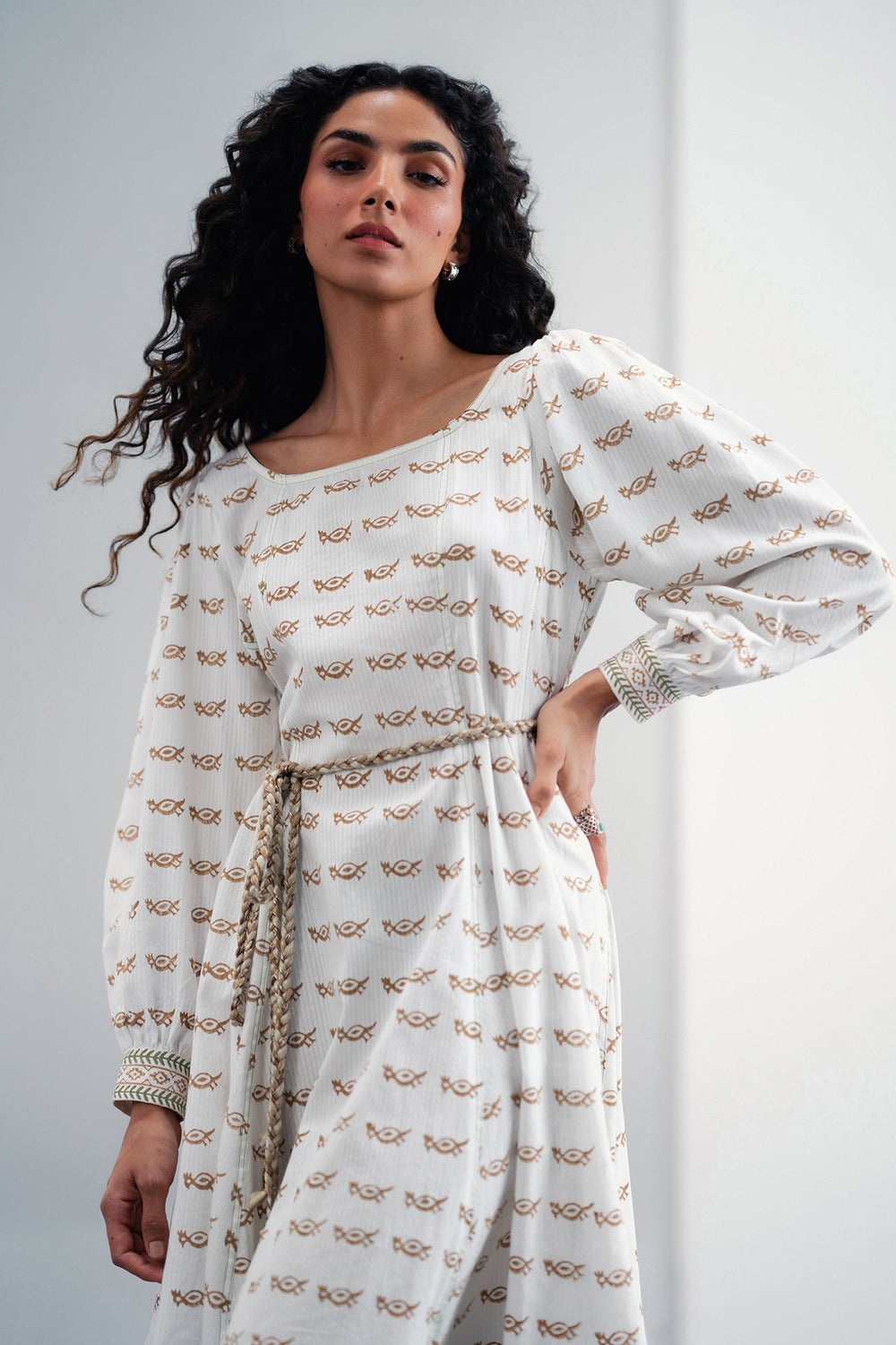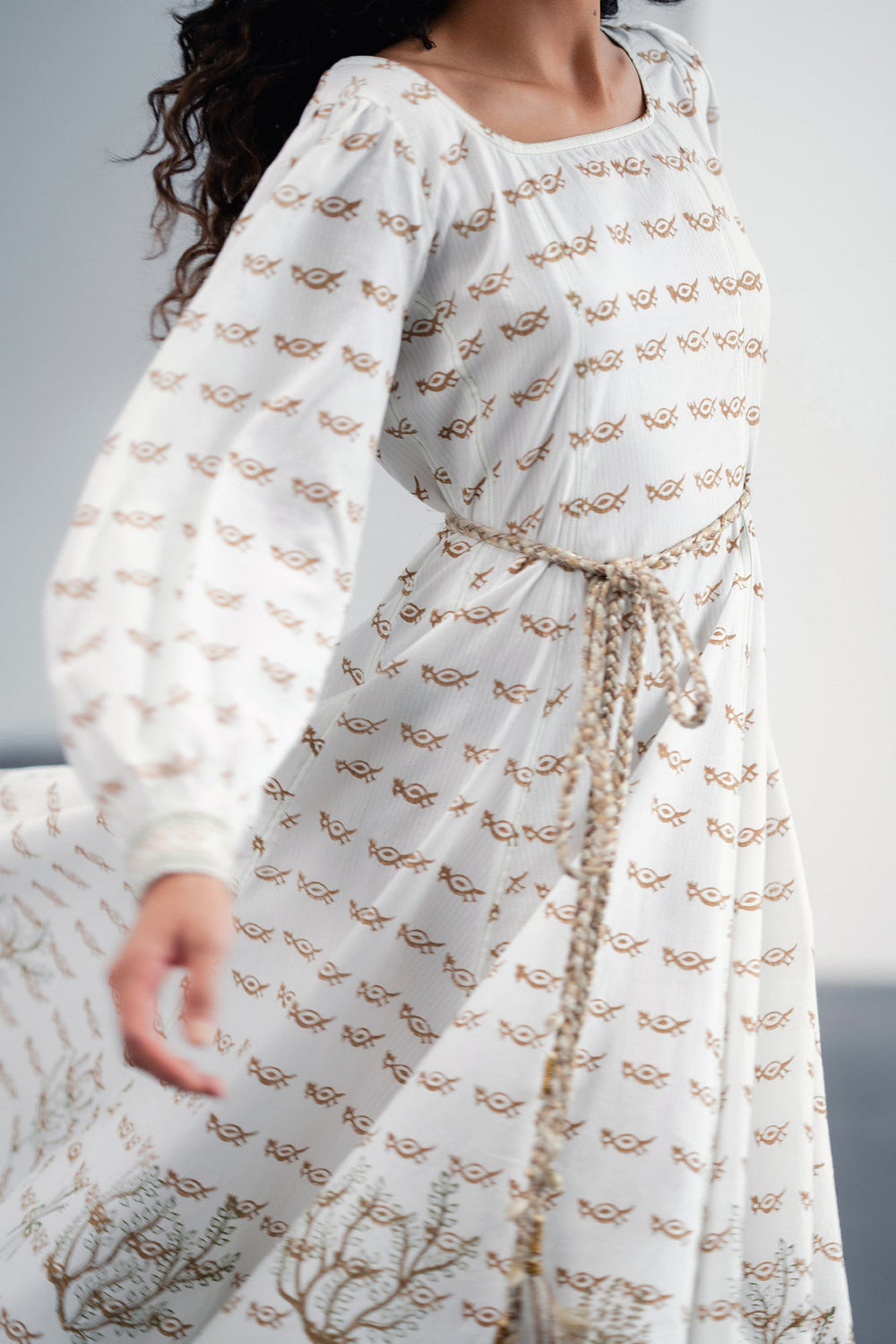 This dress is a poetic masterpiece, where a classic silhouette meets enchanting artistry. The flowing white fabric is adorned with a delicate all-over motif, while a wide, intricate botanical print graces the hem. The long, voluminous sleeves are cinched with beautifully embroidered cuffs, and a braided belt with tassels cinches the waist, creating a look that is both whimsical and effortlessly elegant.
