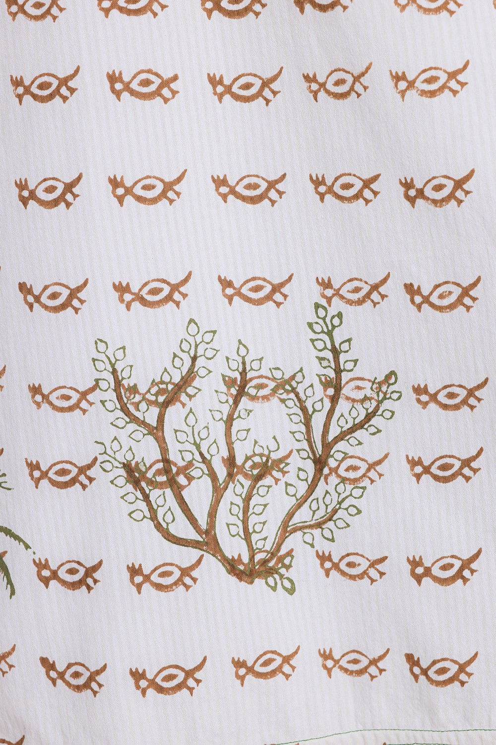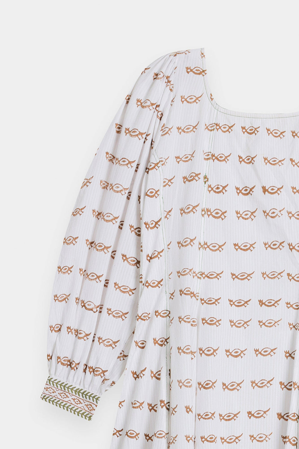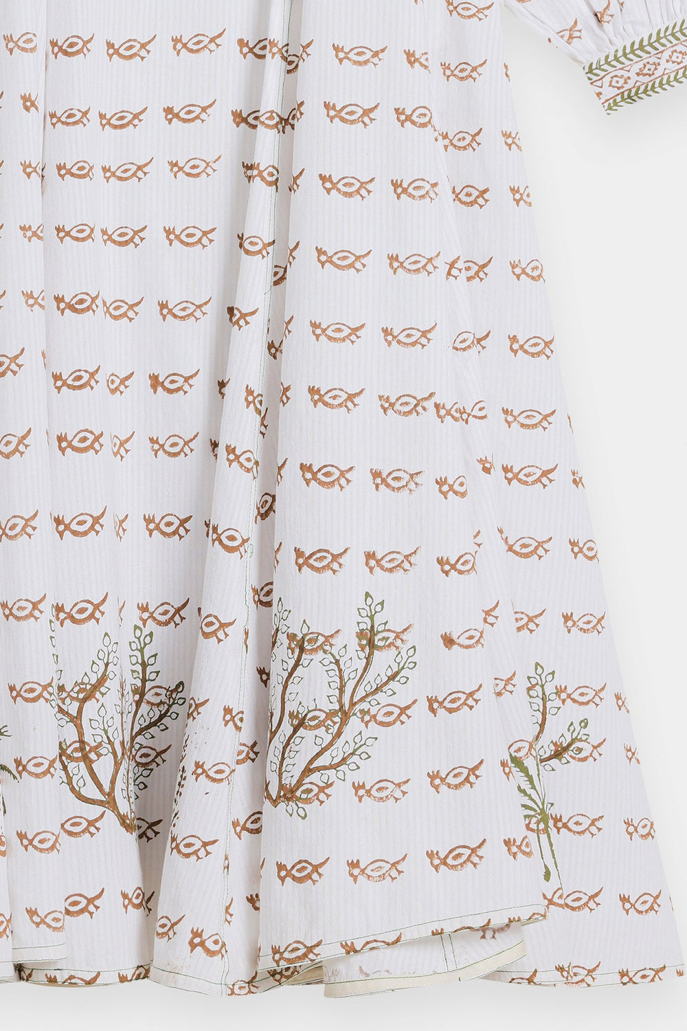 This dress is a poetic masterpiece, where a classic silhouette meets enchanting artistry. The flowing white fabric is adorned with a delicate all-over motif, while a wide, intricate botanical print graces the hem. The long, voluminous sleeves are cinched with beautifully embroidered cuffs, and a braided belt with tassels cinches the waist, creating a look that is both whimsical and effortlessly elegant.
