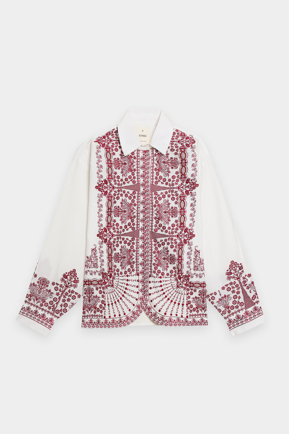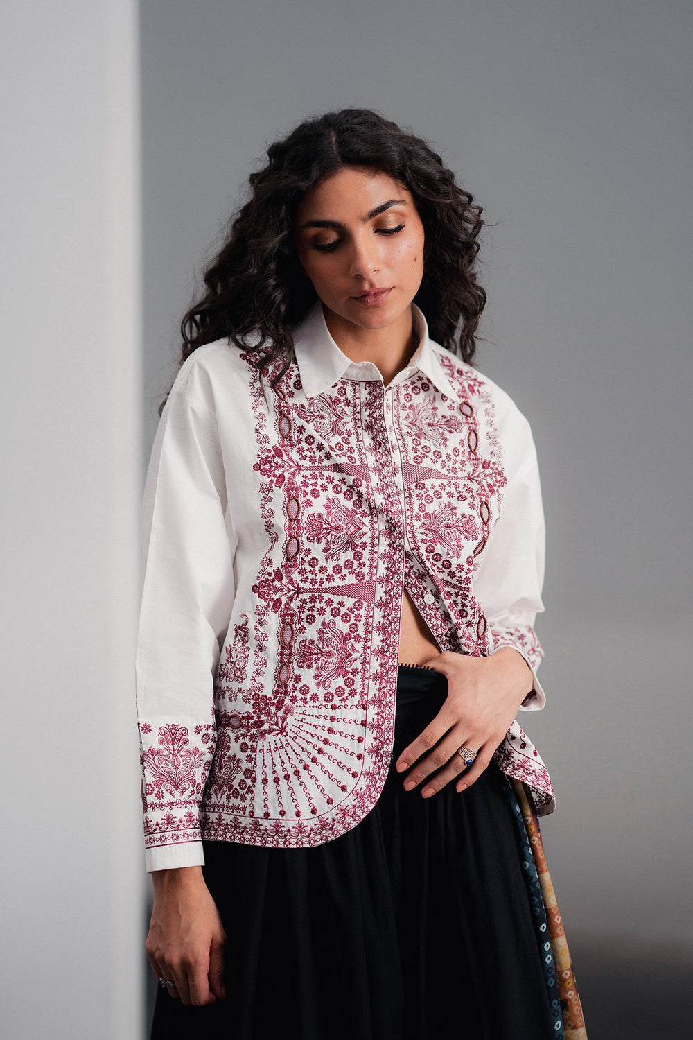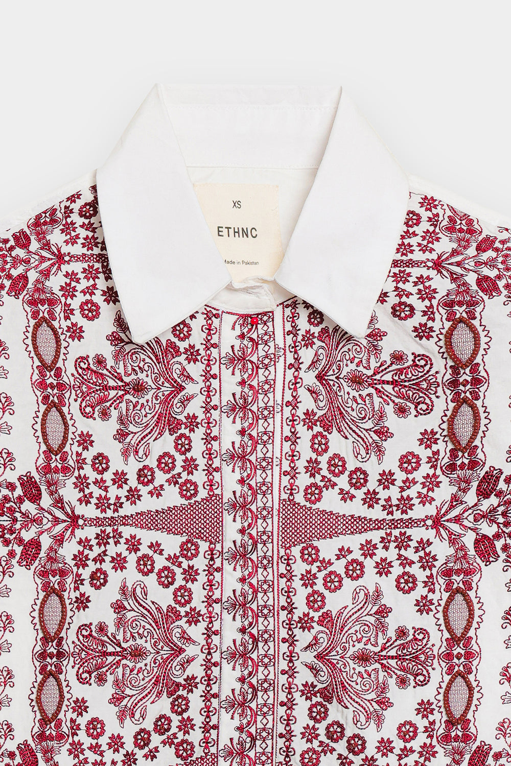 A canvas for intricate artistry, this tailored shirt makes a bold yet elegant statement. It features a striking white base adorned with elaborate reddish-pink embroidery that flows gracefully across the front and cuffs. The exquisite floral and geometric patterns, combined with a classic collar and sophisticated silhouette, create a piece that is a testament to timeless elegance and craftsmanship.
