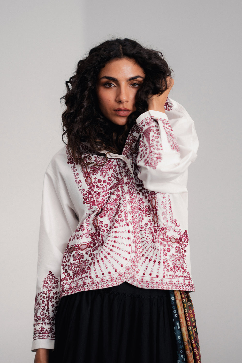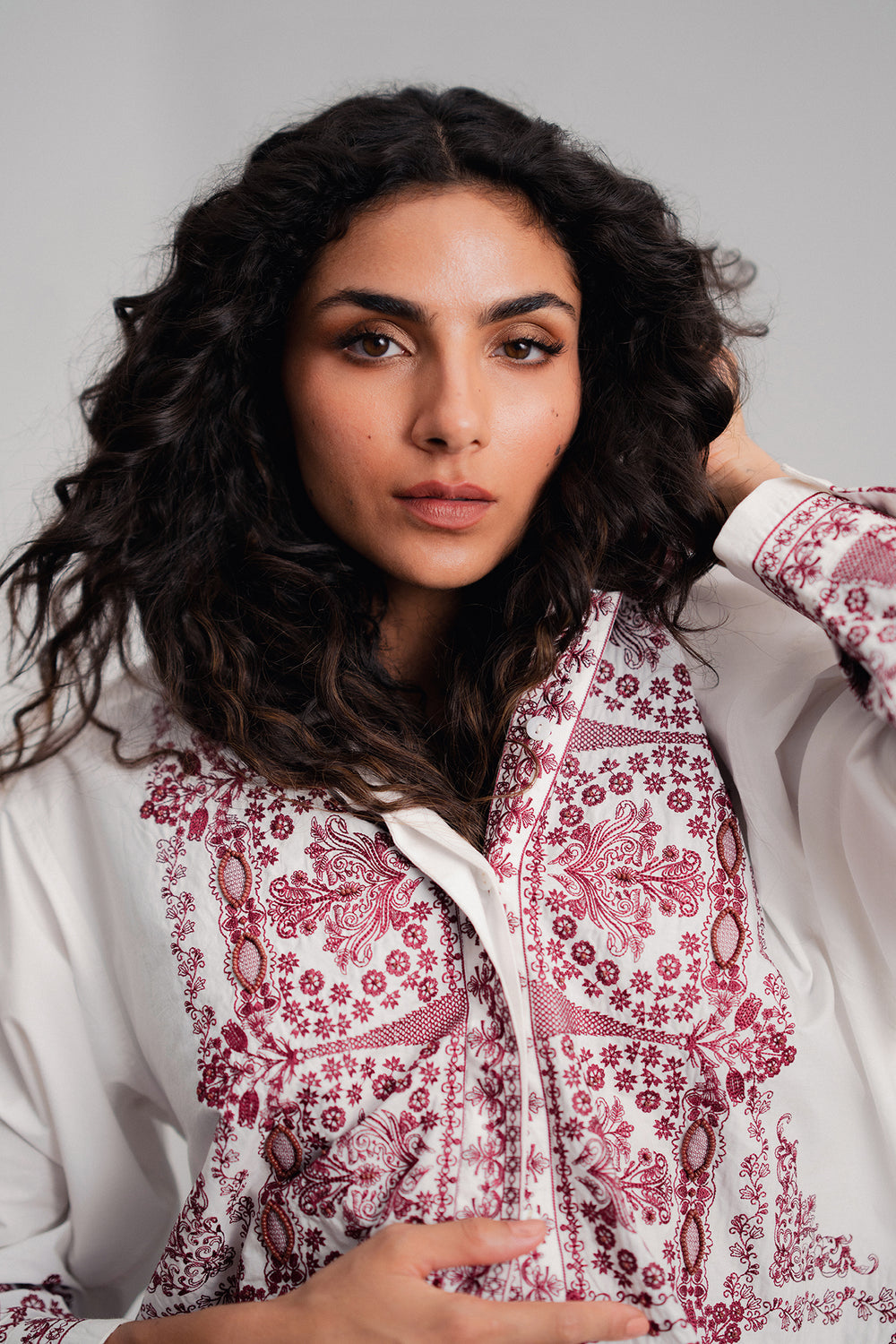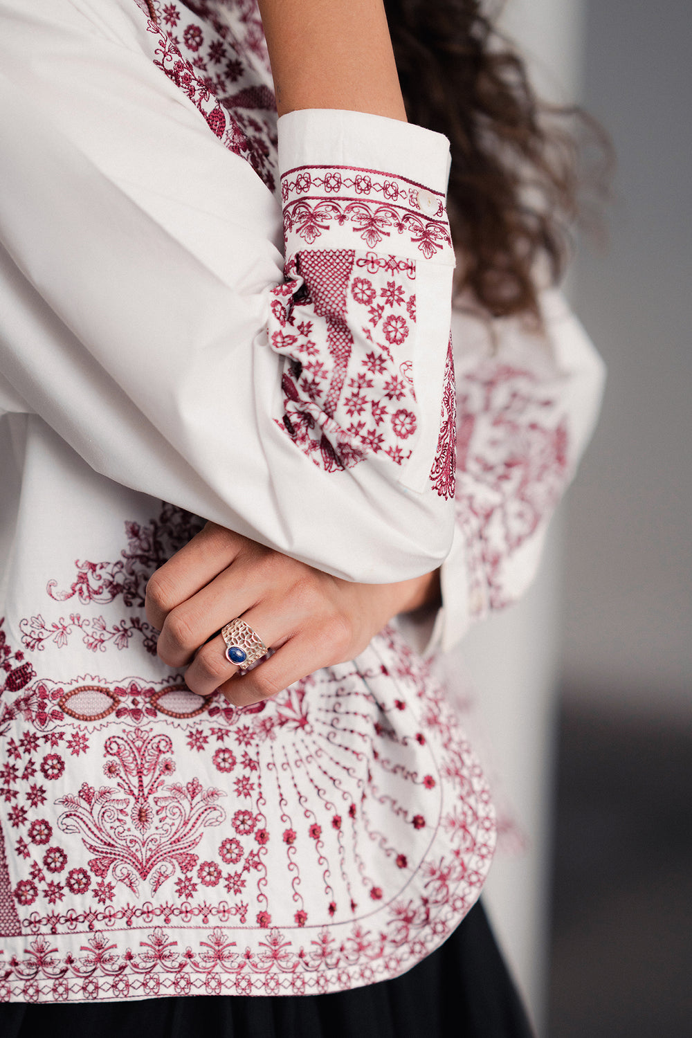 A canvas for intricate artistry, this tailored shirt makes a bold yet elegant statement. It features a striking white base adorned with elaborate reddish-pink embroidery that flows gracefully across the front and cuffs. The exquisite floral and geometric patterns, combined with a classic collar and sophisticated silhouette, create a piece that is a testament to timeless elegance and craftsmanship.