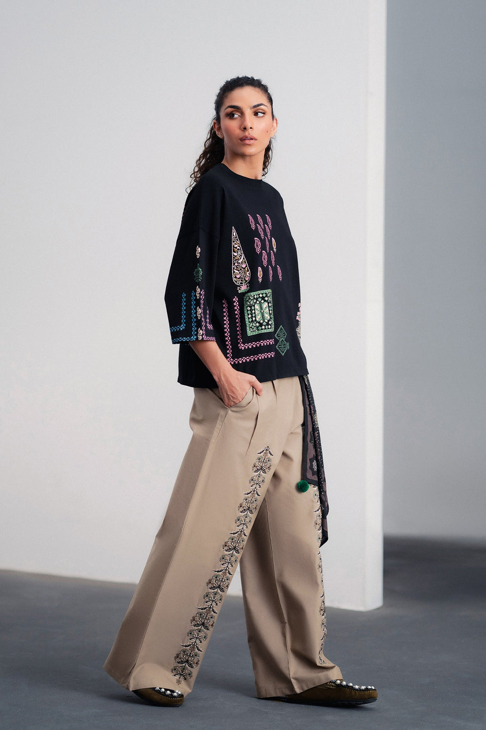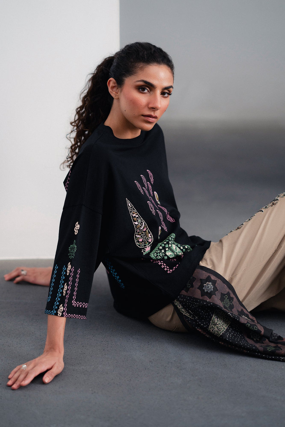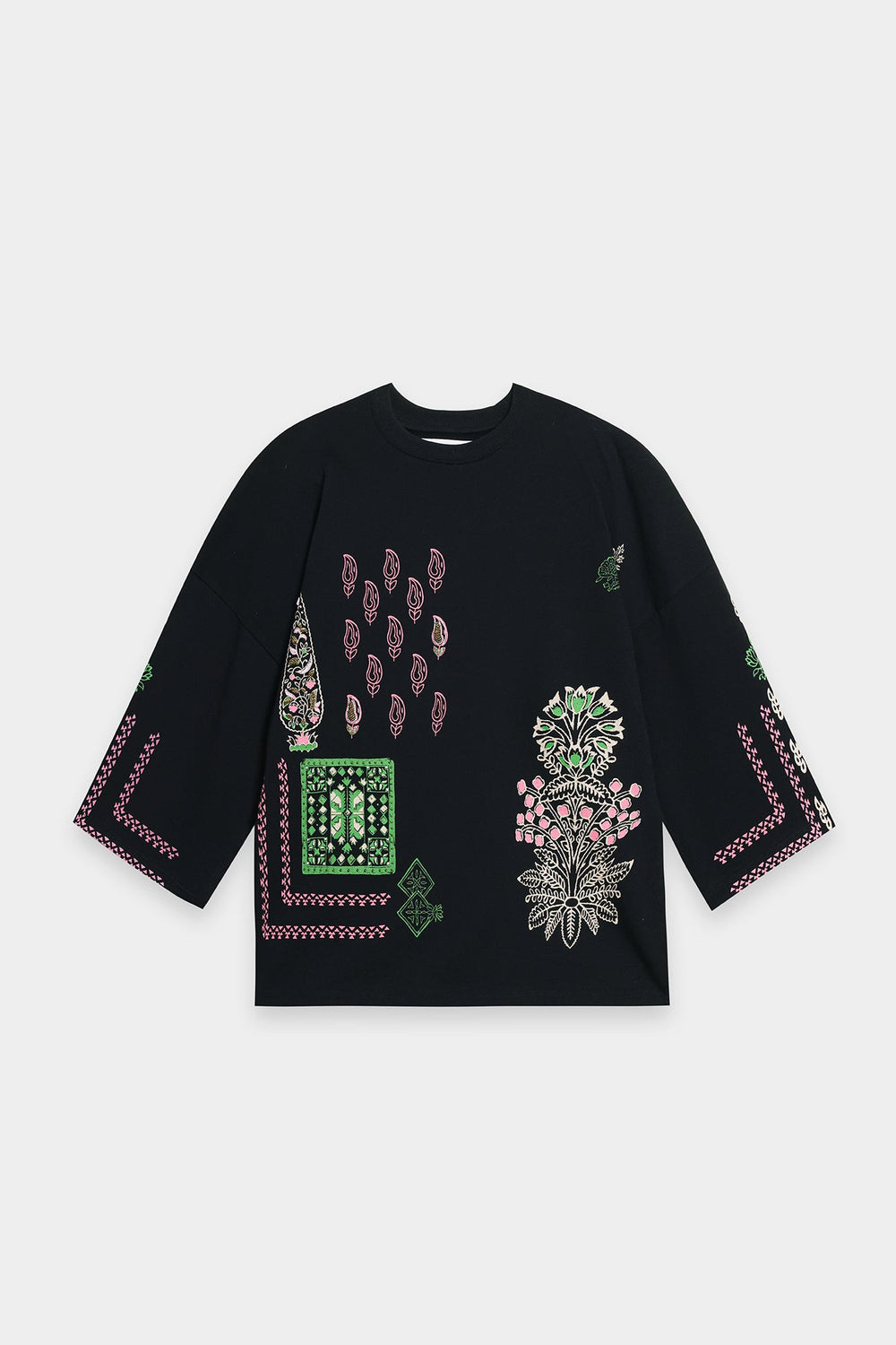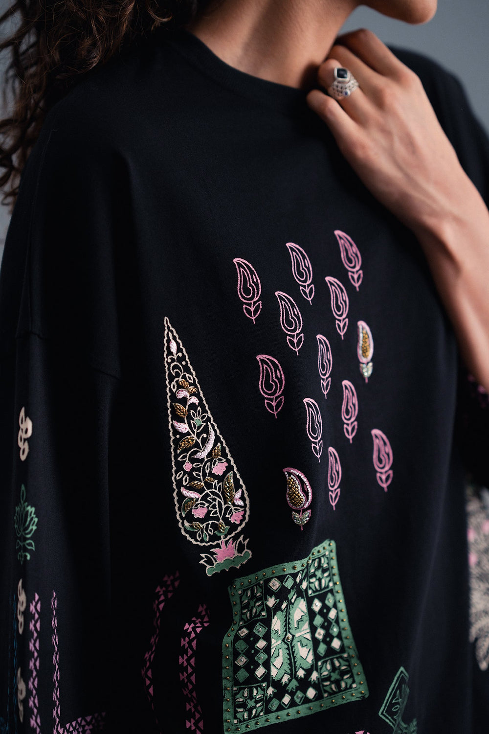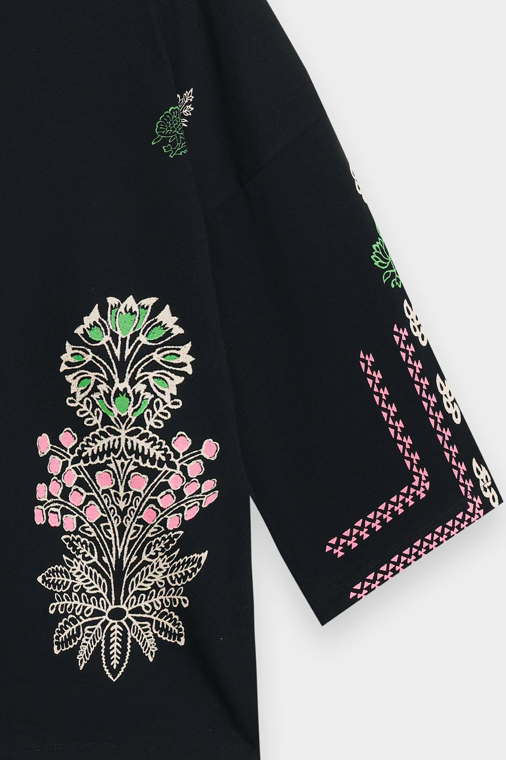This striking black embroidered top is a true statement piece. Crafted with a relaxed, boxy silhouette, it features intricate, multi-colored print in a delicate pattern across the front and sleeves. The detailed artwork adds a rich, vibrant texture against the black fabric, creating a look that is both modern and timeless. Designed for comfort and style, this versatile top can be paired with tailored trousers or a simple skirt for an effortlessly chic ensemble.