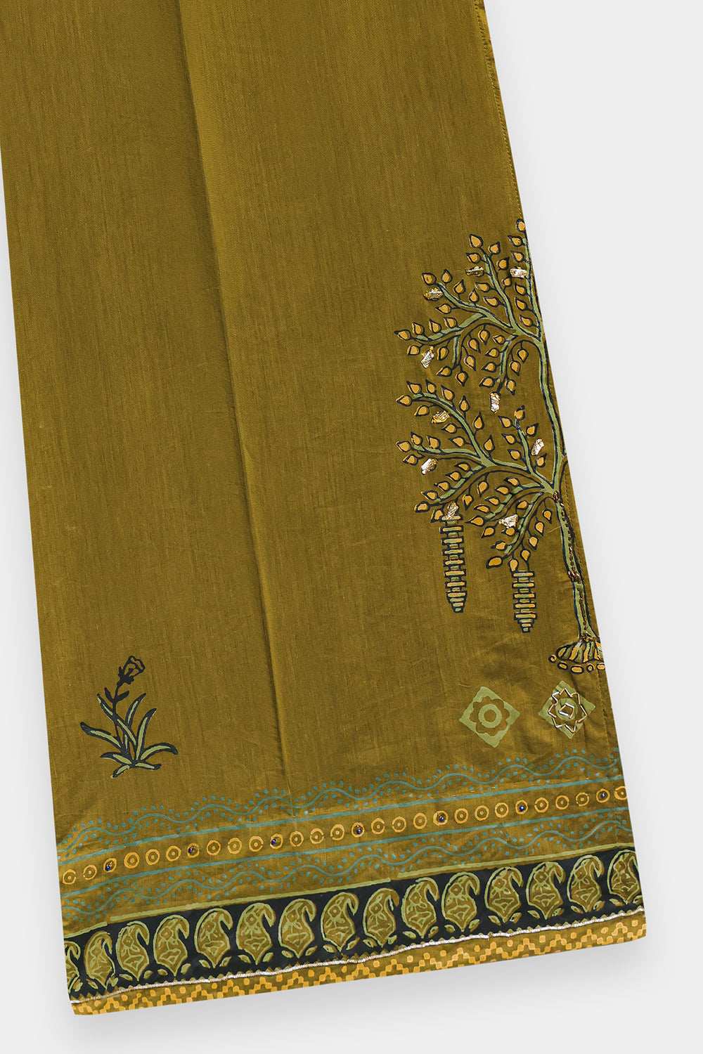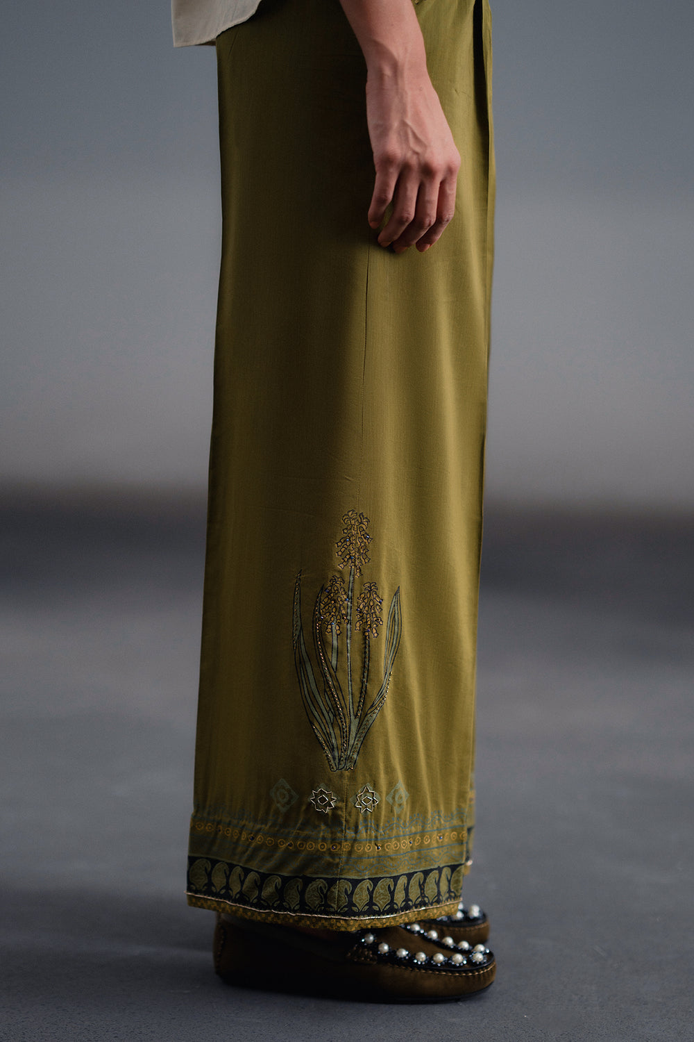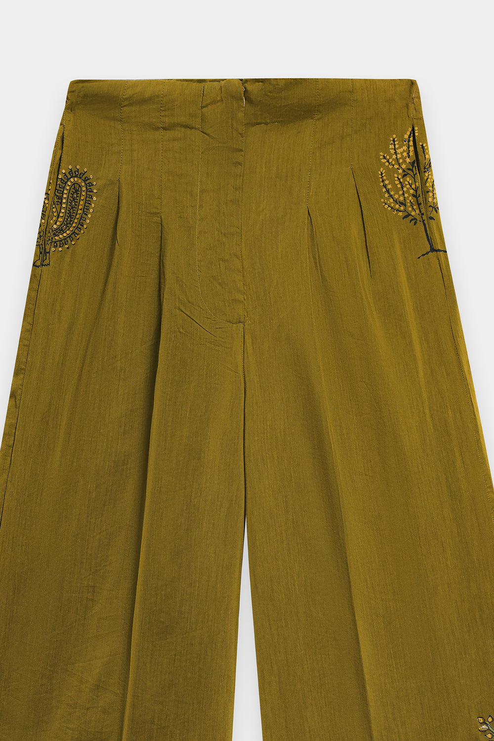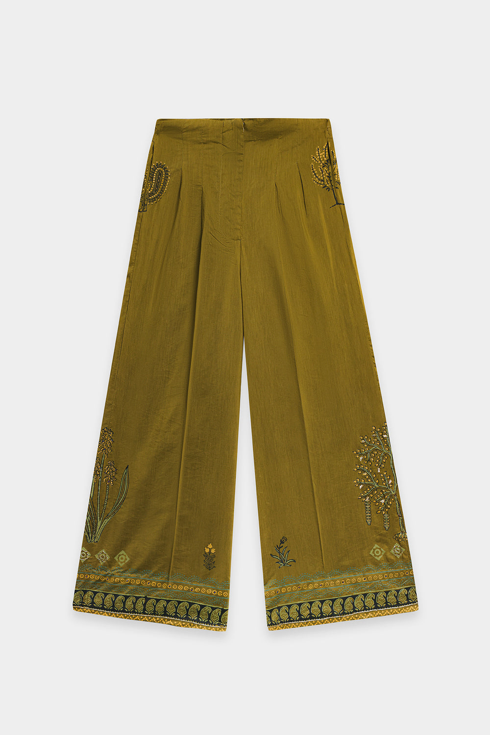 The trouser feature a flowing, wide-leg silhouette in a rich, earthy green hue. The design is elevated by intricate, shimmering embroidery that adorns the lower legs, adding a touch of sophisticated detail. The comfortable fit and artistic embellishments make them a stunning and versatile piece for any wardrobe.