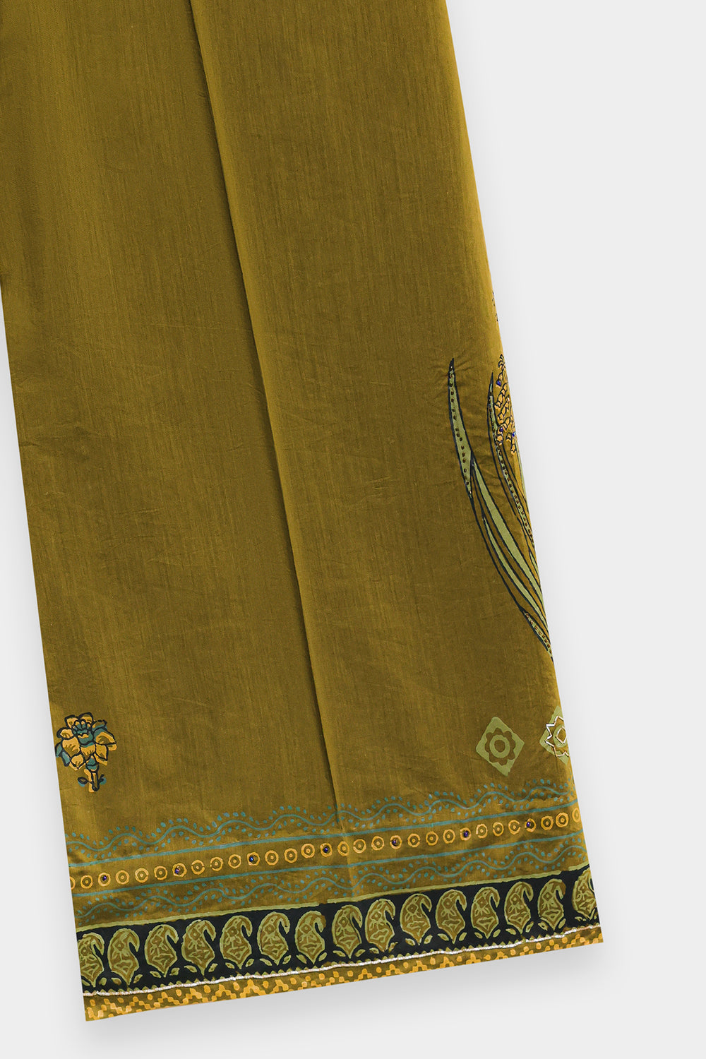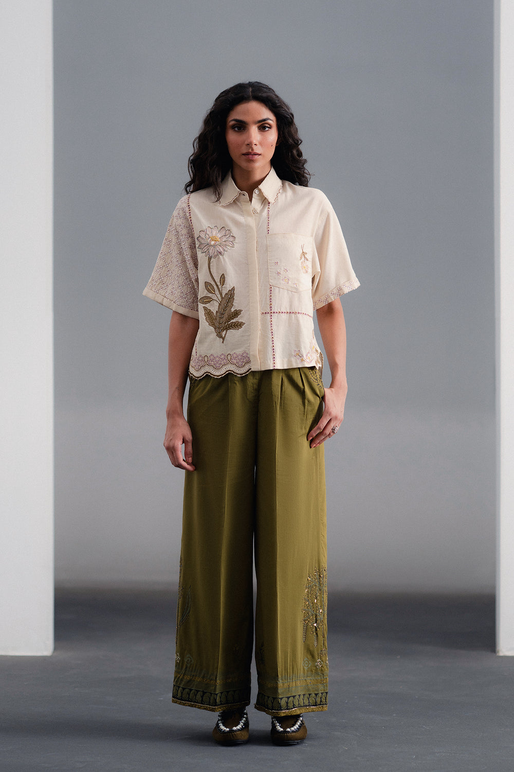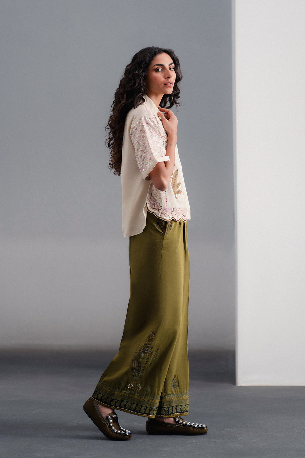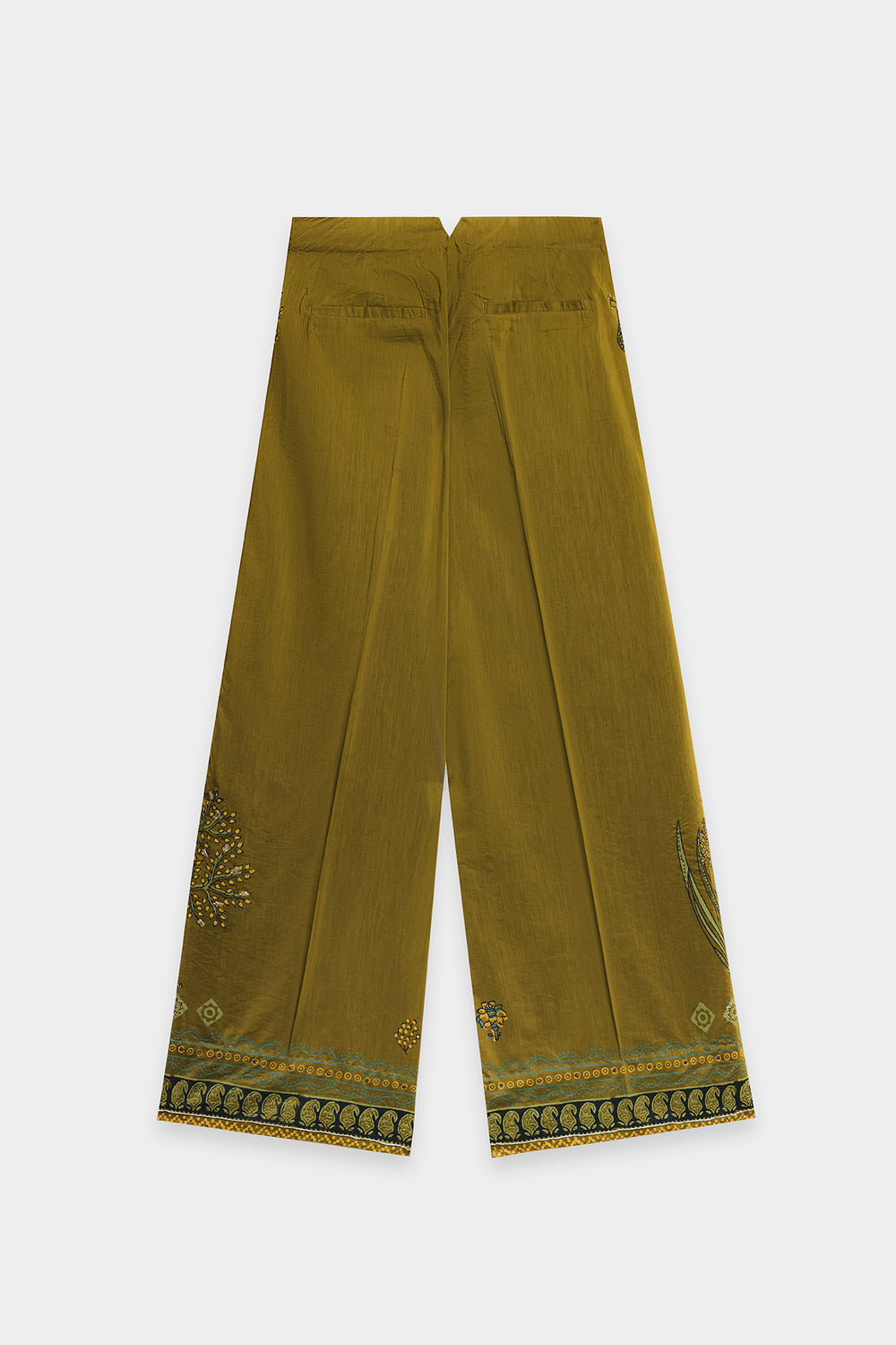The trouser feature a flowing, wide-leg silhouette in a rich, earthy green hue. The design is elevated by intricate, shimmering embroidery that adorns the lower legs, adding a touch of sophisticated detail. The comfortable fit and artistic embellishments make them a stunning and versatile piece for any wardrobe.