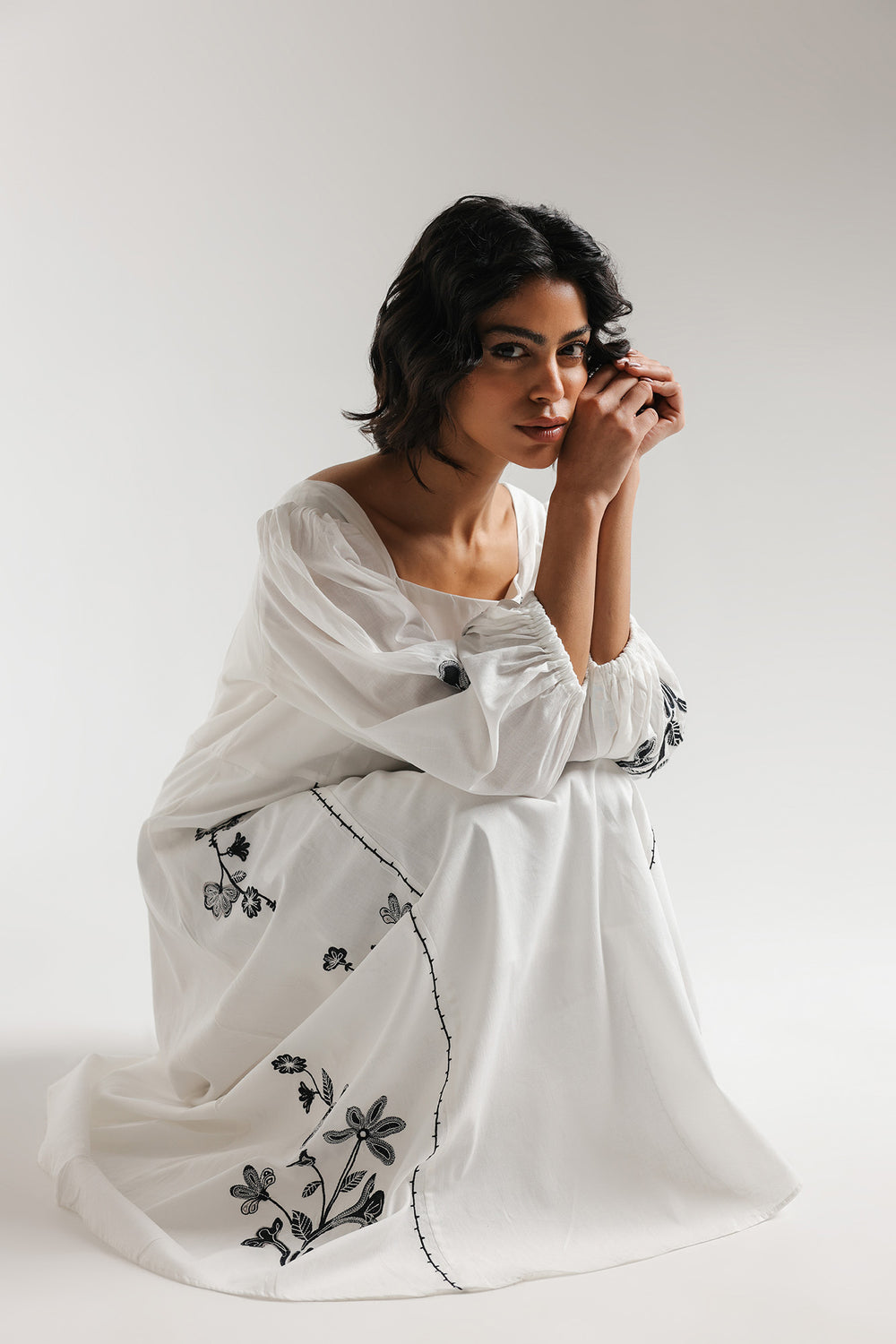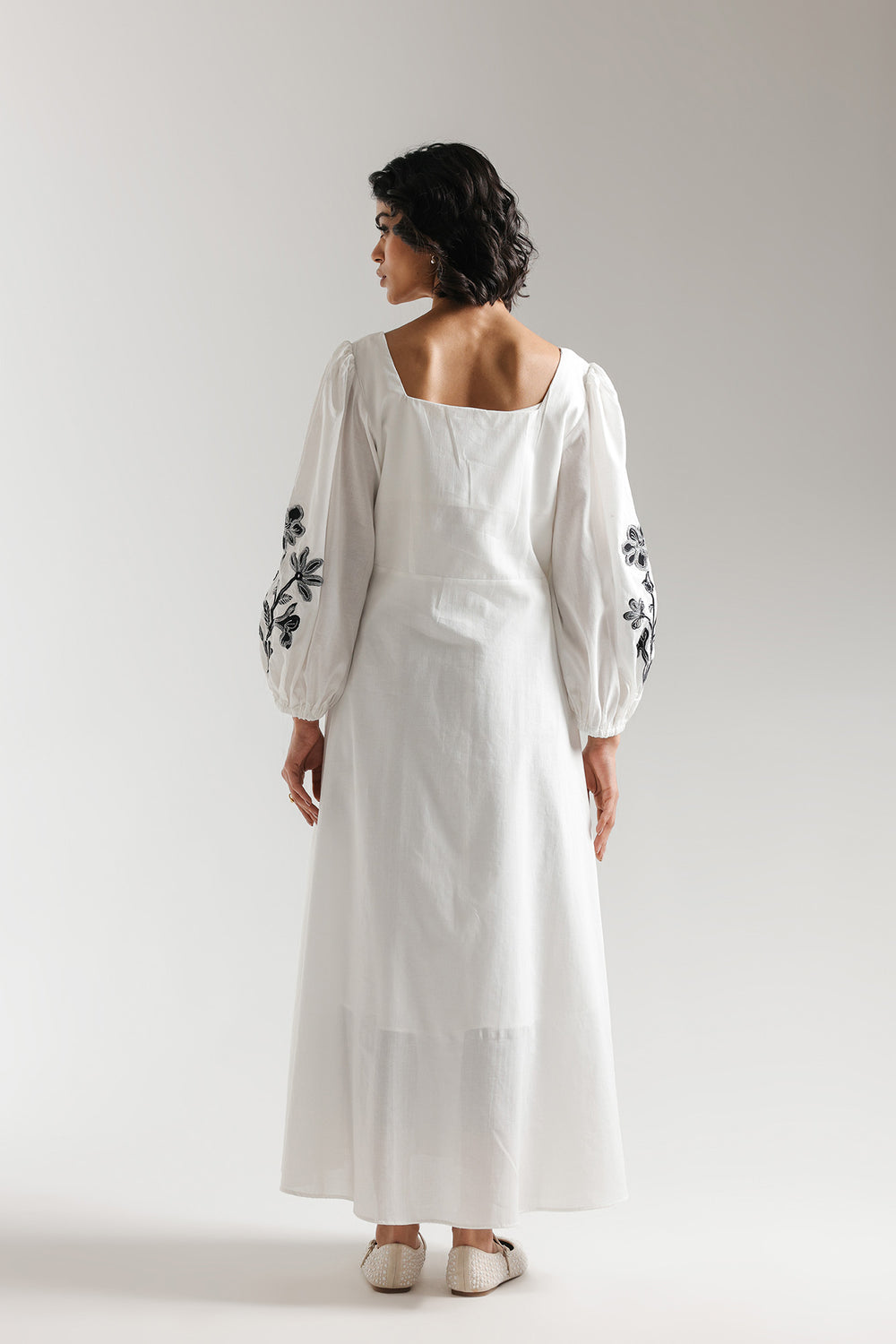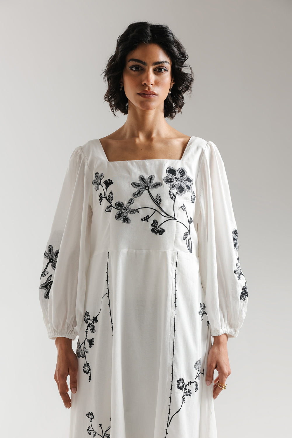 Make a romantic and graceful statement with this white dress, featuring a high-waisted maxi silhouette and bold botanical embroidery. The design is characterized by a structured square neckline and voluminous puffed sleeves with elasticated cuffs, offering a modern feminine aesthetic. Intricate black floral motifs and delicate trailing vines are artfully embroidered across the bodice, sleeves, and down the side panels of the fluid skirt. Vertical stitched detailing frames the central panel, enhancing the elongated look of this floor-length gown.