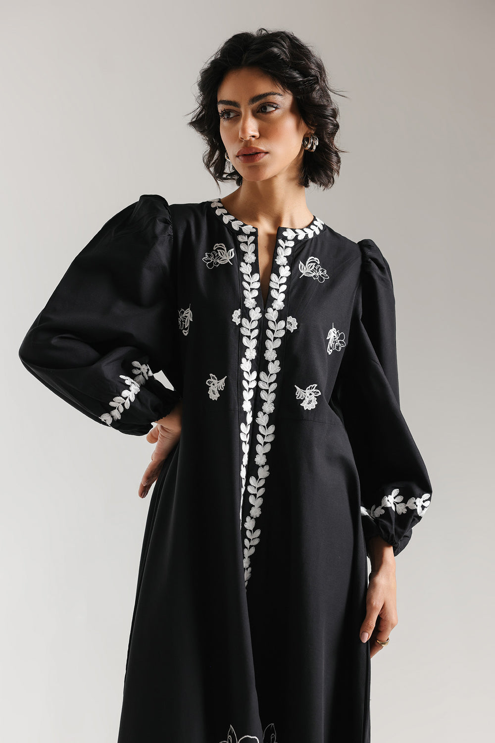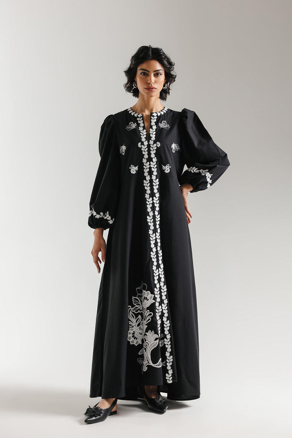 Make a dramatic and sophisticated statement with this black dress, featuring a high-waisted maxi silhouette and striking ivory embroidery. The design is characterized by a high split V-neckline and voluminous puffed sleeves with elasticated cuffs, creating a modern and regal aesthetic. A bold, vertical panel of leaf-inspired needlework runs down the entire center of the garment, while delicate floral sprigs are scattered across the bodice and sleeves. The look is completed with a large, intricate botanical motif blooming from the lower front panel, offering a high-contrast blend of monochrome elegance and artisanal craft.