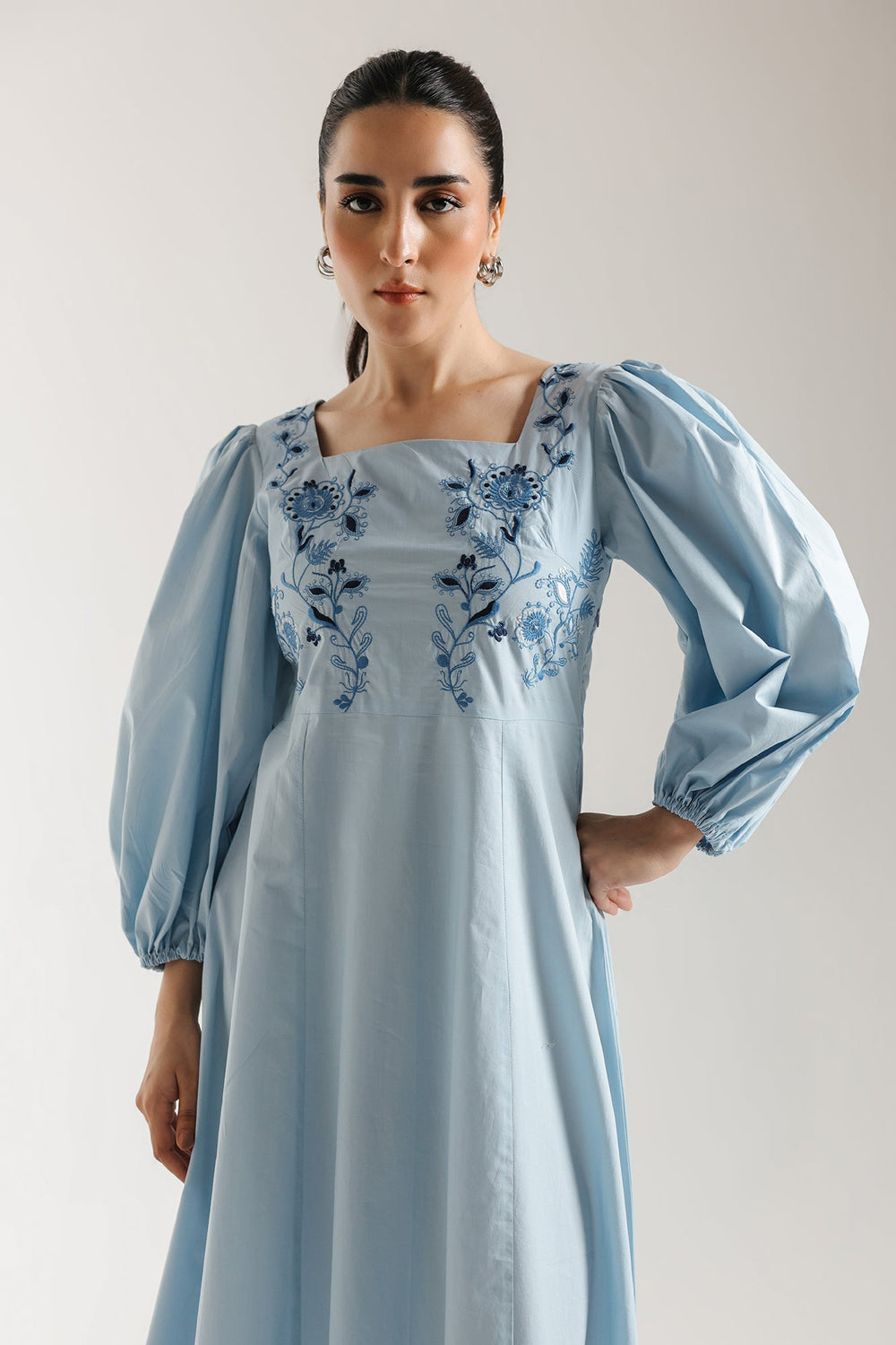 Elegant cyan dress featuring graceful balloon sleeves that add a romantic touch to your wardrobe. The round neckline is beautifully framed with delicate embroidery, while matching embroidered details adorn the hem for a cohesive, polished look. Perfect for special occasions or elevated everyday wear, this piece combines comfort with timeless style.