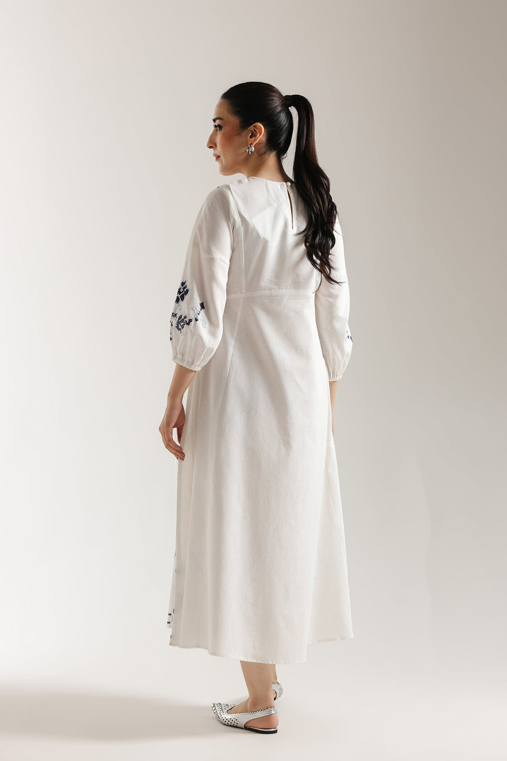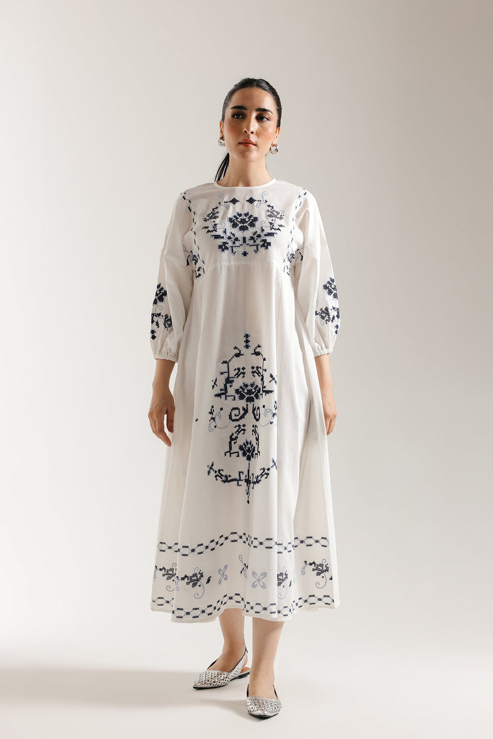 Elegant white dress featuring intricate black embroidery throughout. The light balloon sleeves add a graceful, feminine touch while the long length provides a sophisticated silhouette. Perfect for special occasions or formal gatherings, this piece combines traditional craftsmanship with timeless style. The contrast between the crisp white fabric and detailed black embroidery creates a striking visual appeal that works beautifully for weddings, celebrations, or evening wear.