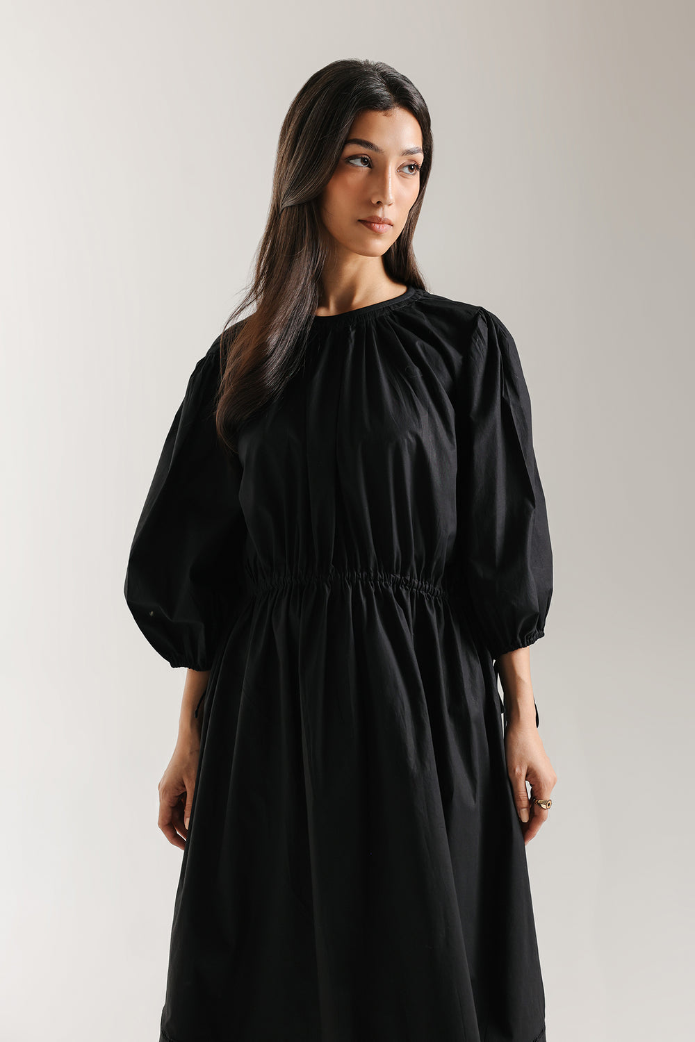 Command attention with the chic volume and clean lines of this minimalist black dress. This midi-length dress is crafted from a crisp solid black fabric. The design features an oversized, voluminous silhouette created by gathering at the round neckline and a defined elasticated waistline. It is detailed with dramatic, loose-fitting puffed sleeves that cinch below the elbow. The wide, flowing skirt is completed with a subtle lace accent near the hem. This piece is a powerful yet effortless choice for modern style.