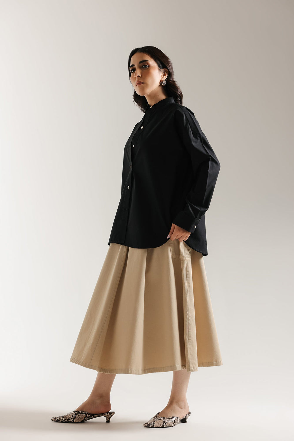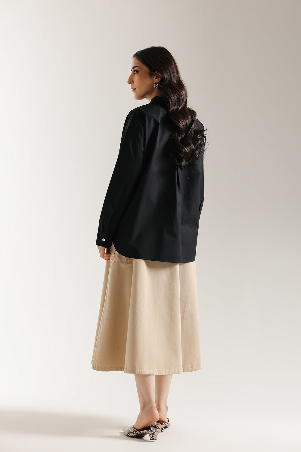 Step into sophisticated simplicity with this chic black button-down shirt. Crafted with a sleek, minimalist aesthetic, it features a refined band collar that provides a clean, contemporary alternative to a traditional neckline. The shirt is designed with a comfortable, relaxed fit, allowing for graceful movement and versatility. It is subtly detailed with white buttons down the front, blending seamlessly with the deep black fabric. Paired with a midi skirt for a polished look, this shirt is a foundational piece for building modern, professional, and endlessly stylish outfits.