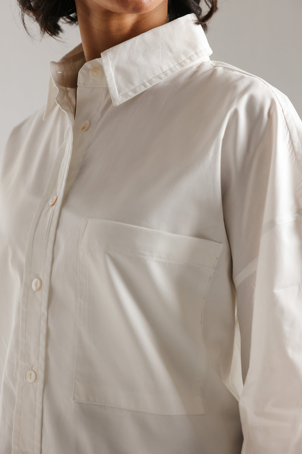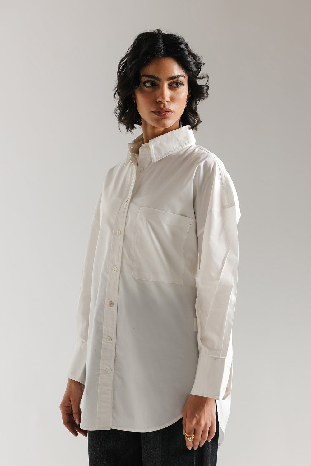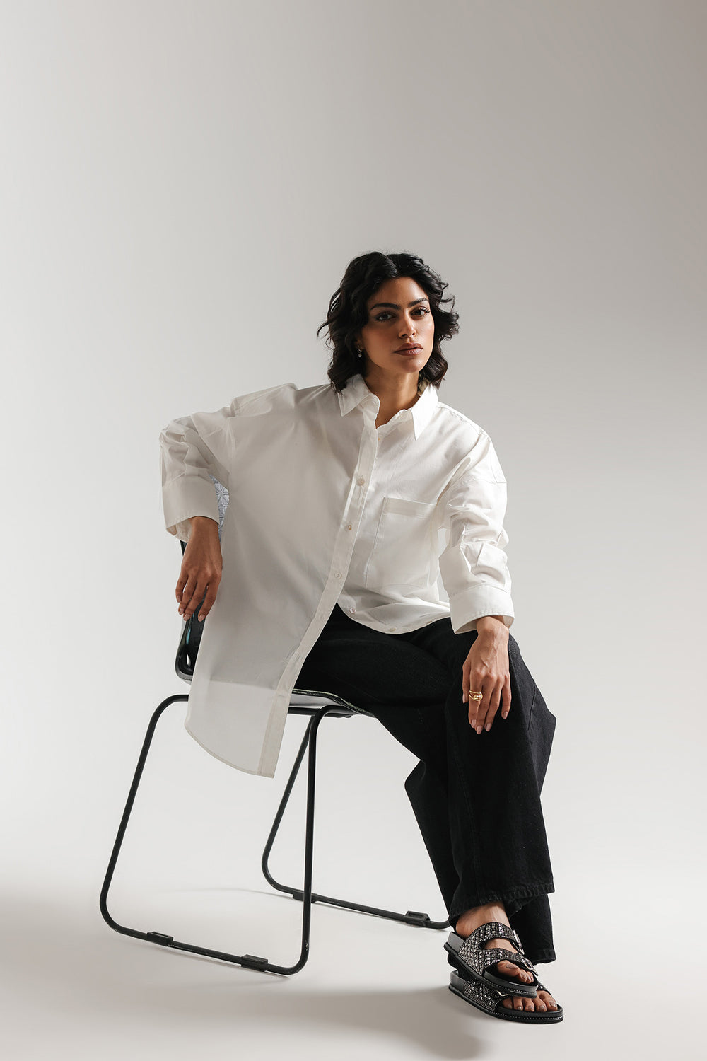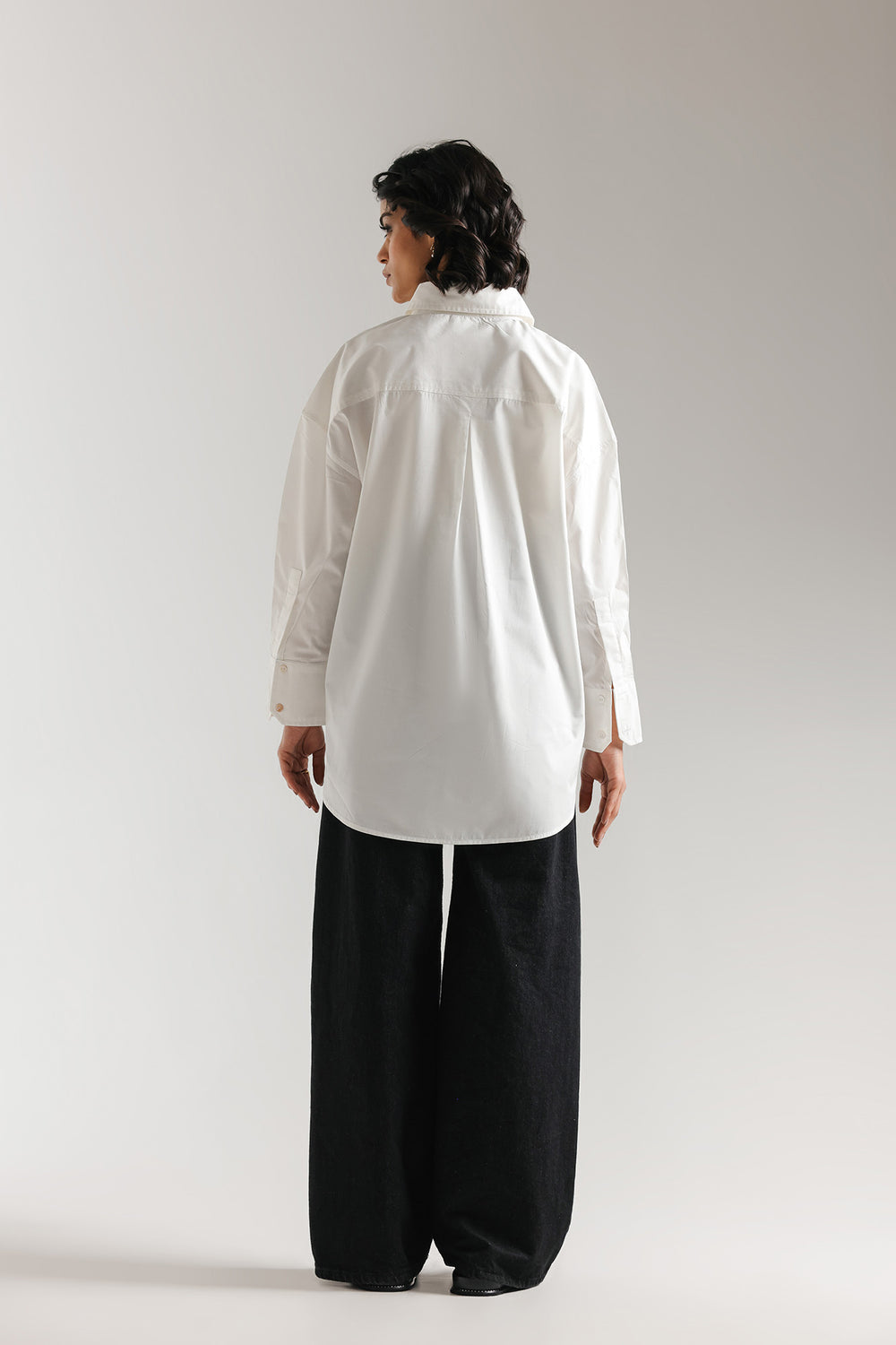 This sleek button-down shirt in pristine white is the ultimate wardrobe essential for the modern minimalist who values both structure and ease. Crafted from a premium fabric with a subtle sheen, the silhouette features a sophisticated oversized fit with dropped shoulders and a crisp, pointed collar that exudes effortless cool. Functional yet stylish, it is detailed with a tonal front button placket and wide, structured cuffs that allow for versatile styling, whether worn buttoned up for a sharp look or layered open for a relaxed vibe. The elongated hemline provides a graceful, contemporary drape that pairs flawlessly with matching dark denim or tailored trousers, making it a powerful statement piece for high-end casual wear or polished evening ensembles.