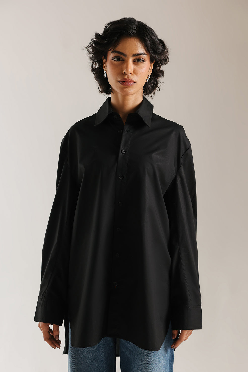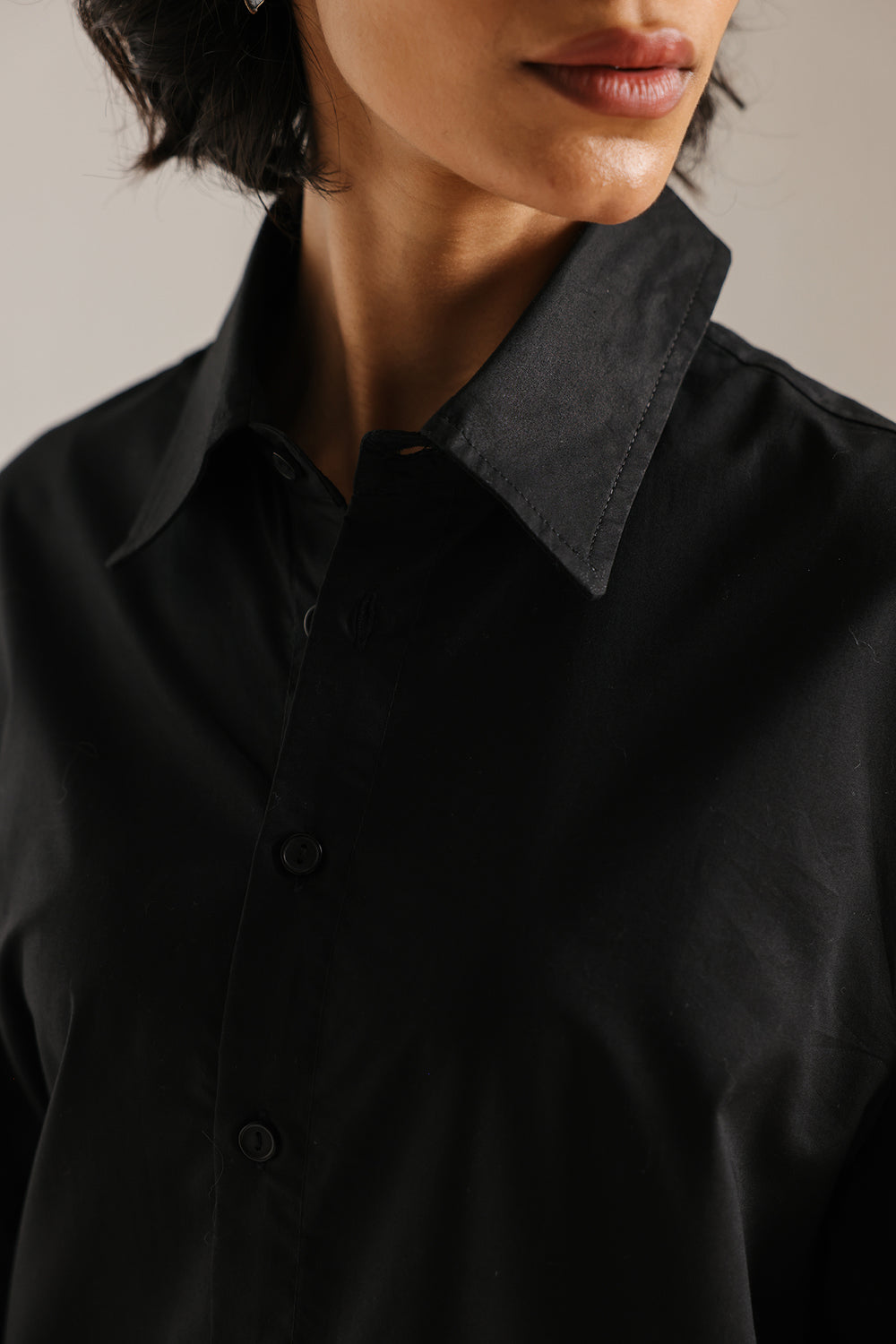 This classic black button-down shirt is a masterclass in modern, minimalist design, offering an oversized silhouette that perfectly balances structured tailoring with effortless ease. Crafted from high-quality, crisp cotton, the shirt features a sophisticated pointed collar and a clean front placket adorned with distinct, naturally-toned buttons. The oversized fit is further elevated by dropped shoulders and wide, structured cuffs, creating a contemporary drape that transitions seamlessly from a polished professional setting to a chic, off-duty look. Whether paired with wide-leg denim for a relaxed aesthetic or tucked into a sleek skirt, this versatile piece serves as a timeless and essential foundation for any high-end wardrobe.