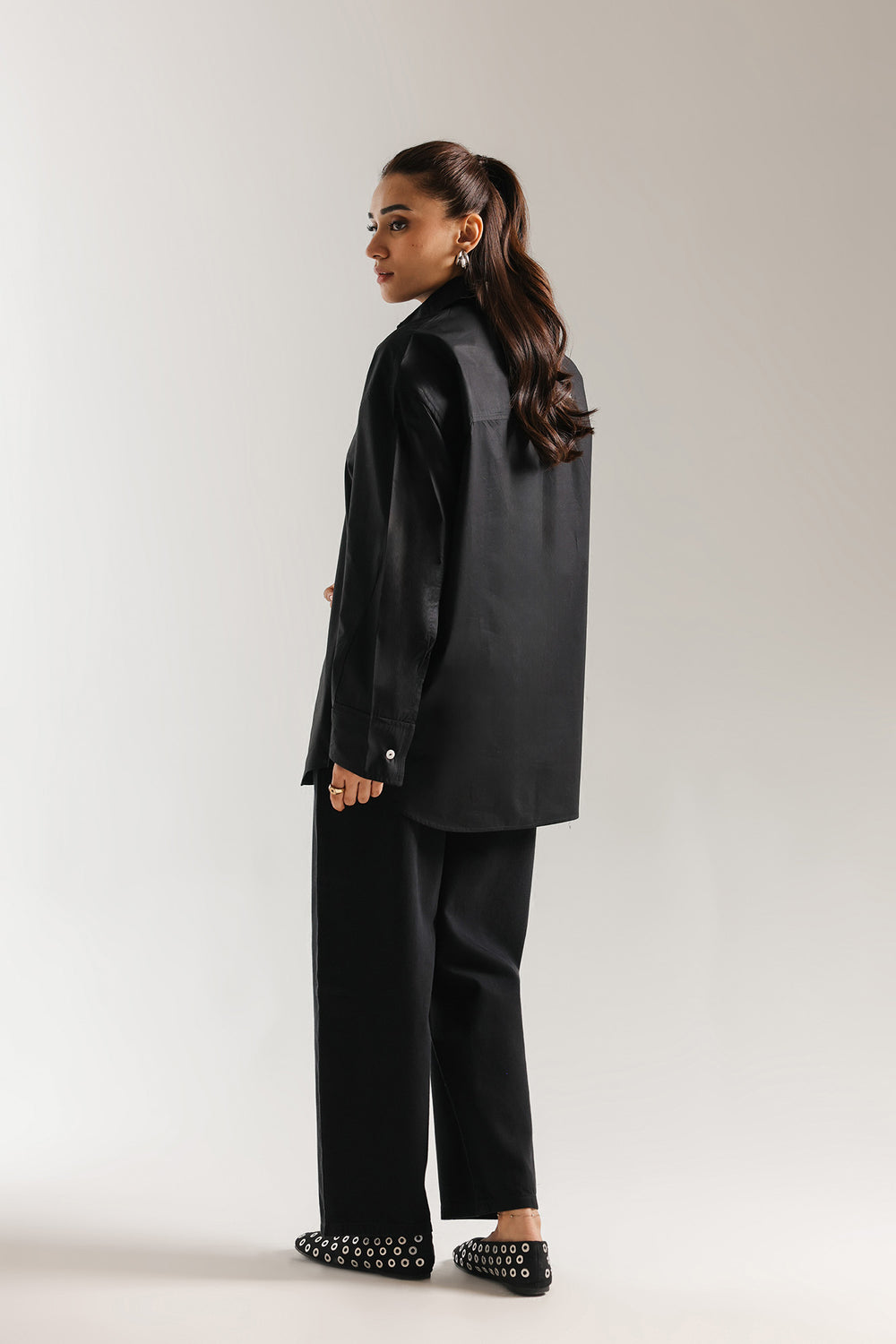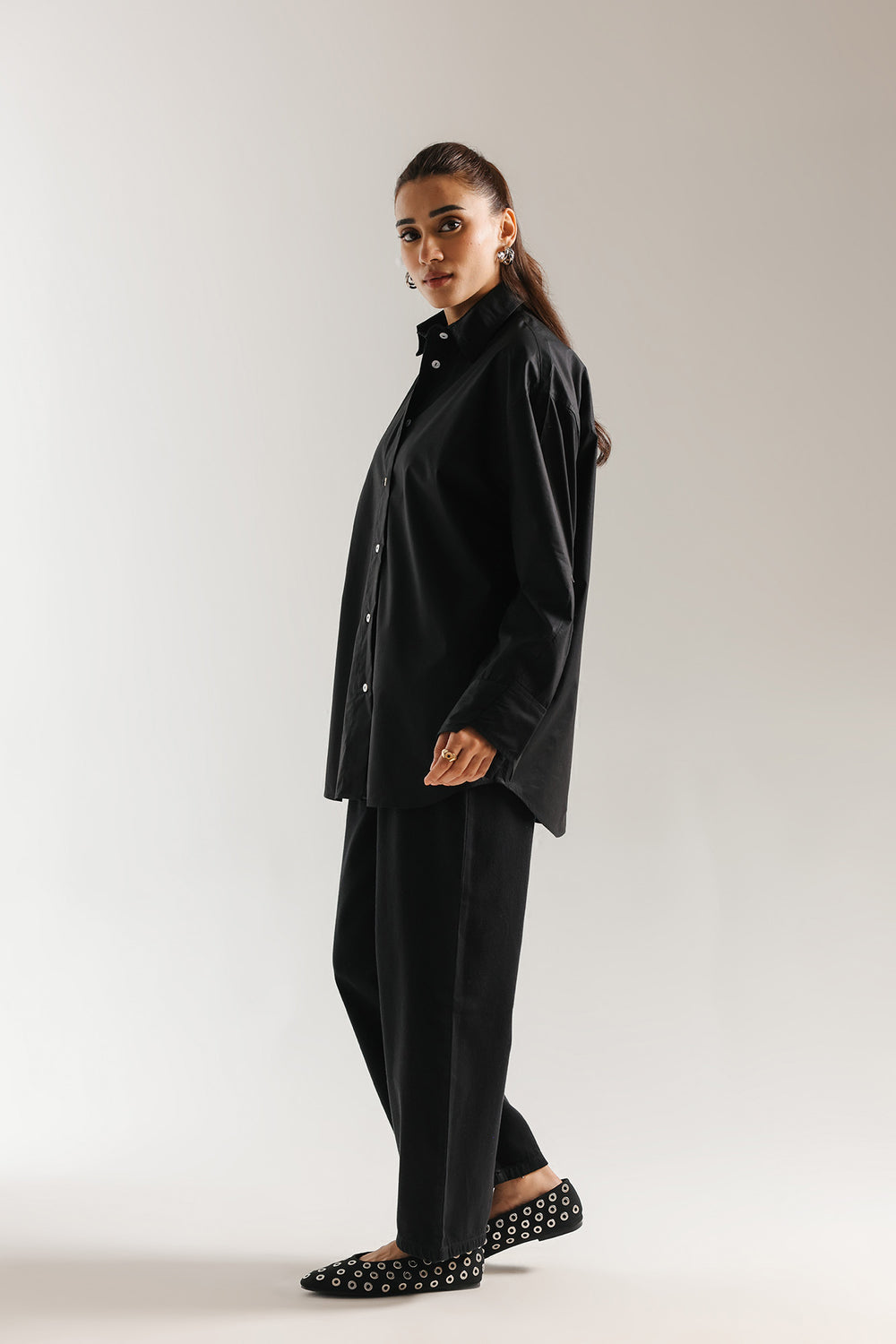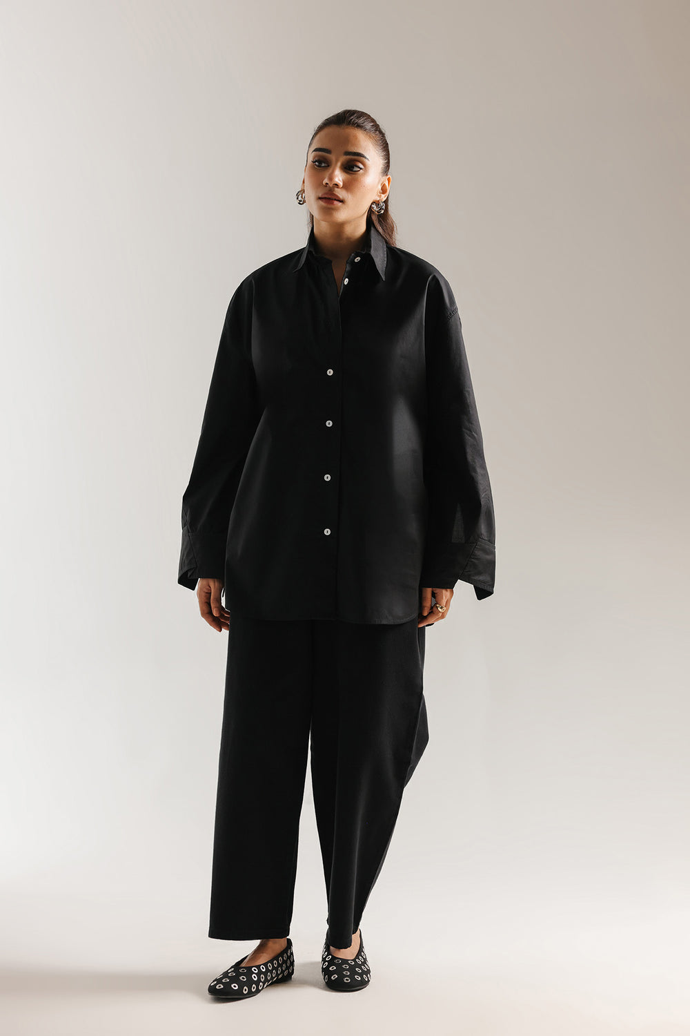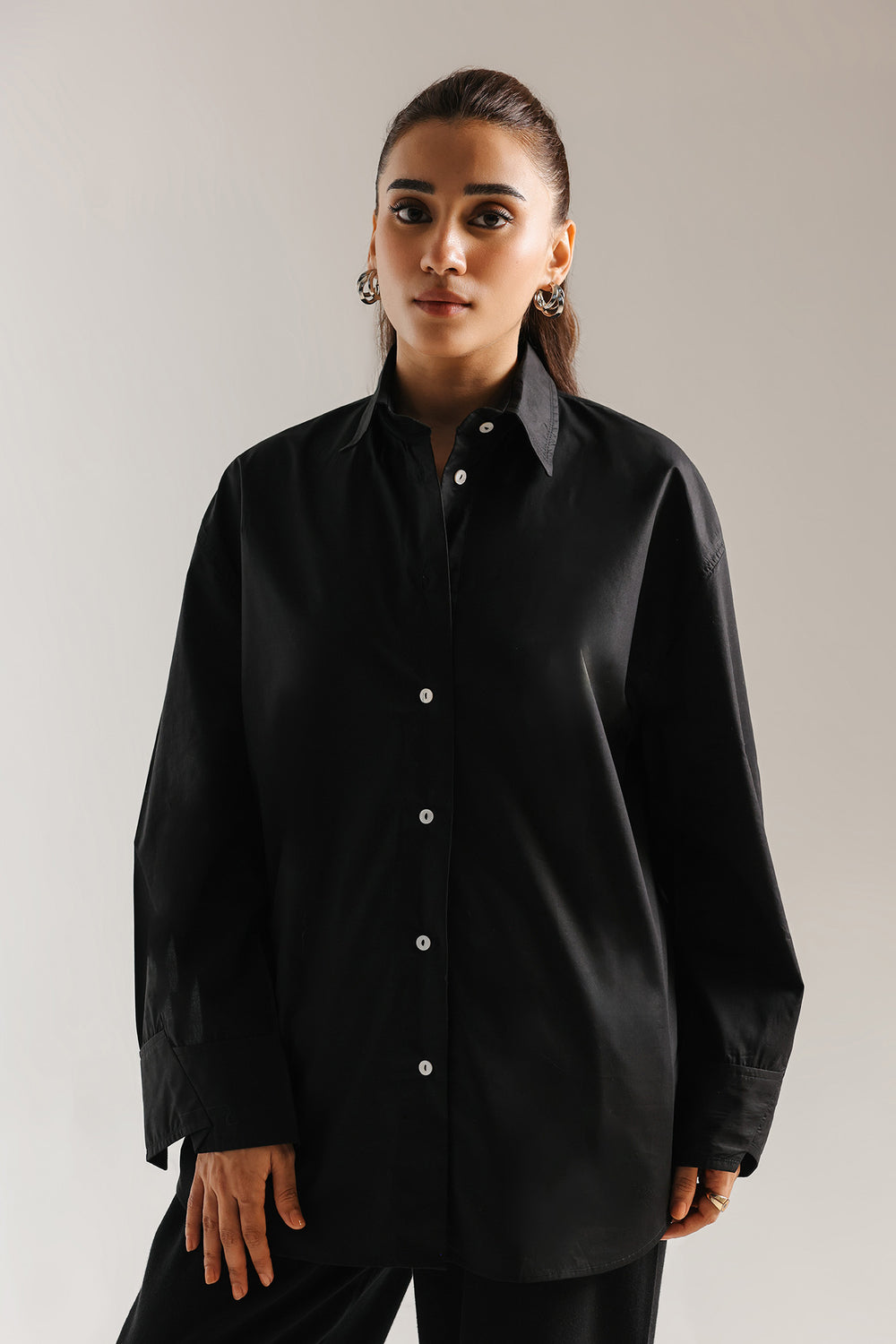 This crisp black button-down shirt is the epitome of effortless, modern sophistication, designed to be a timeless cornerstone of any high-end wardrobe. Crafted from premium cotton with a clean, polished finish, it features a structured oversized silhouette with dropped shoulders and an elongated hem that creates a graceful, contemporary drape. The design is elevated by a sharp pointed collar and wide, structured cuffs with delicate tonal stitching, offering versatile styling options that transition seamlessly from professional polished looks to relaxed, chic ensembles. Whether paired with wide-leg denim for a casual daytime vibe or layered under a tailored vest, this shirt provides a bright, minimalist canvas that exudes understated luxury.