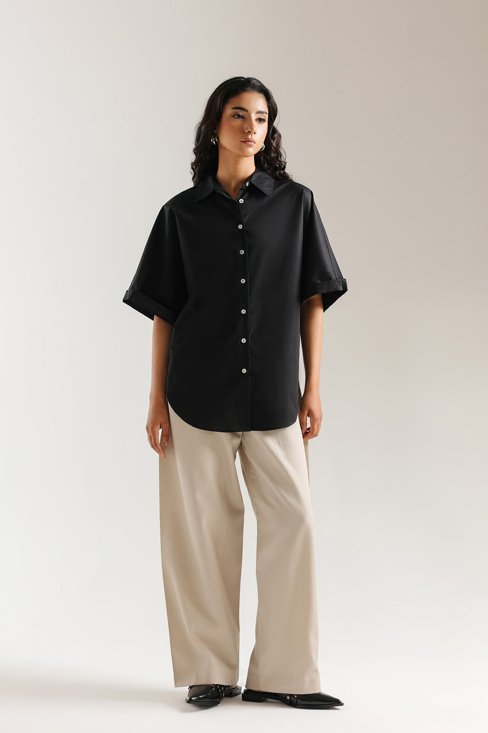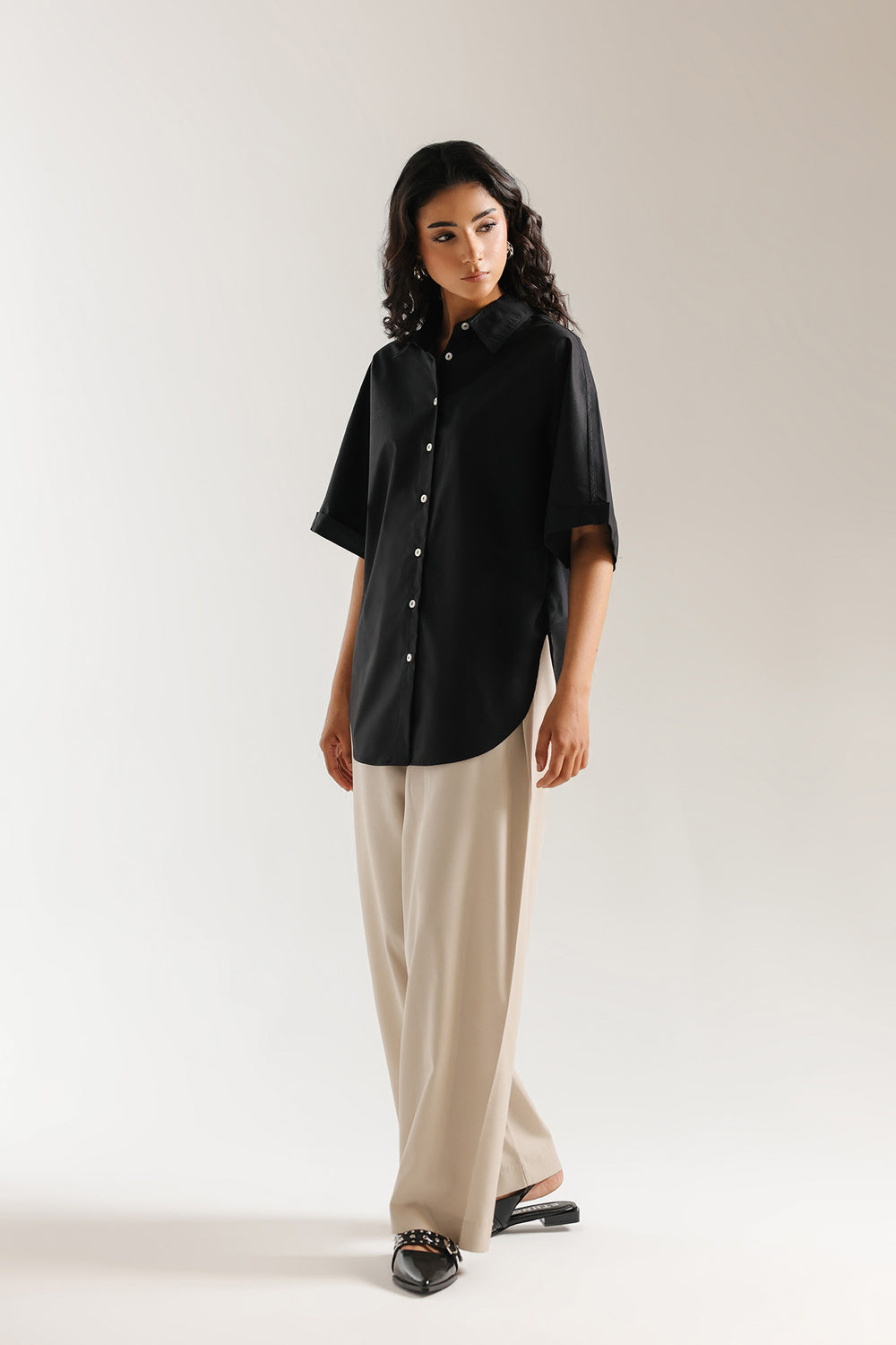 This sleek black shirt is a definitive statement in modern minimalism, blending an effortless silhouette with refined structural details for a look of understated power. Crafted from a premium fabric with a crisp, smooth finish, the design features a sophisticated oversized fit with wide, elbow-length sleeves that add a contemporary, architectural edge. The classic pointed collar and clean, white toned button placket provide a sharp contrast against the deep ebony canvas, while the gently curved hemline ensures a graceful drape whether worn loose or tucked in. Perfect for high-end casual wear or polished evening ensembles, this versatile piece serves as a bold foundation that pairs flawlessly with tailored neutral trousers or dark denim for a truly elevated aesthetic.