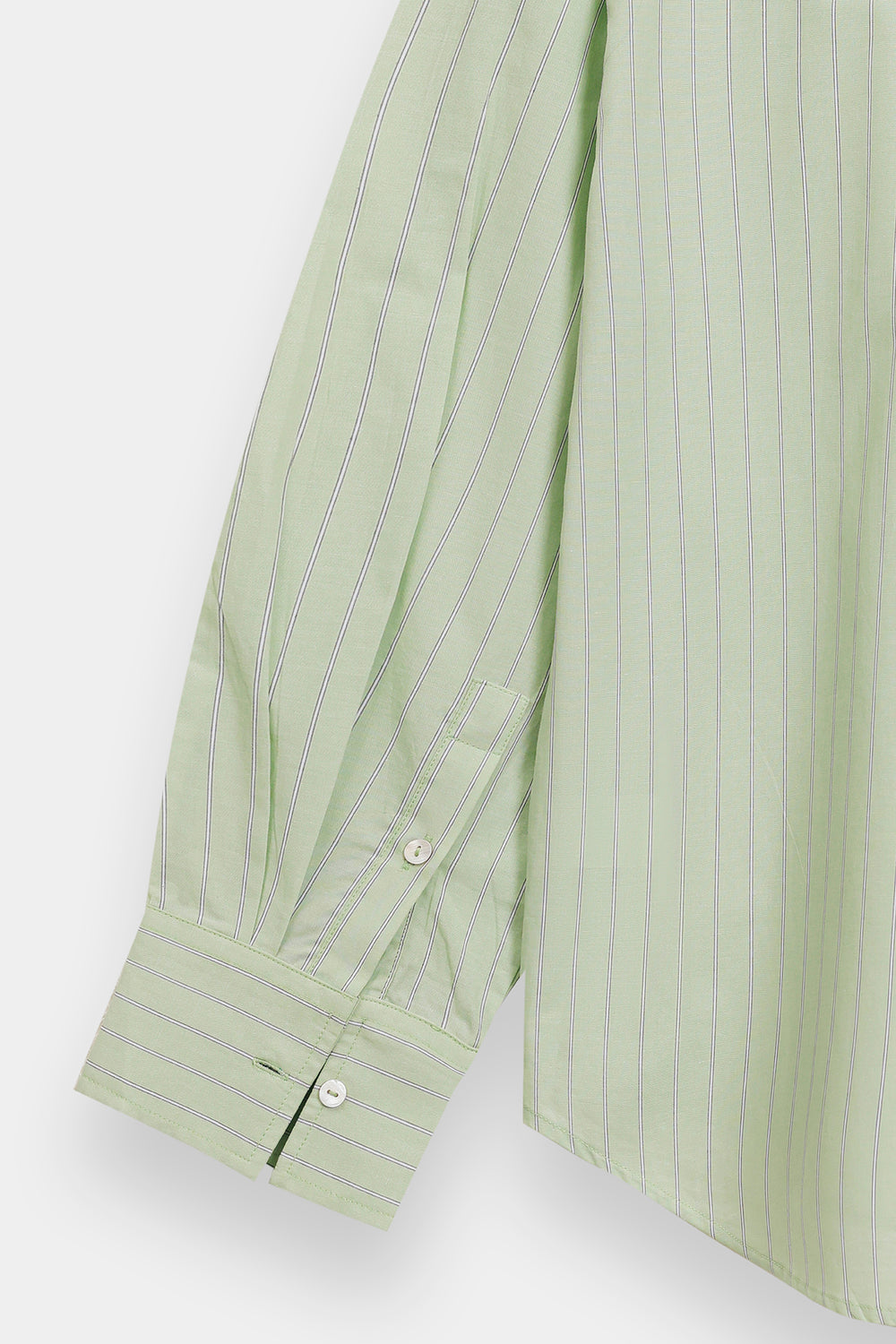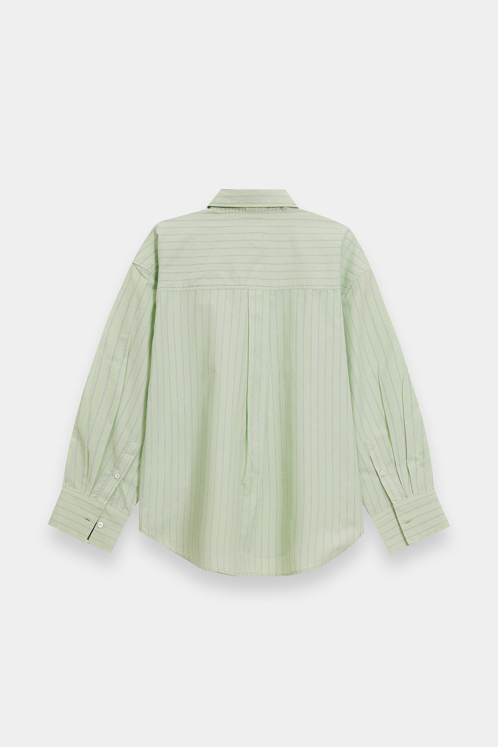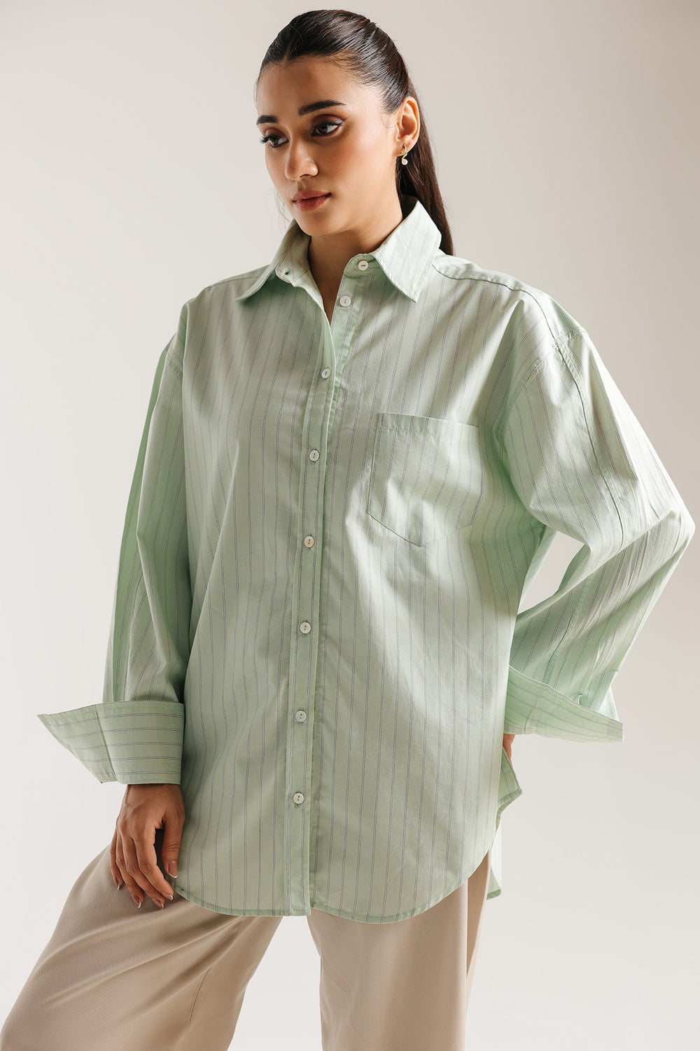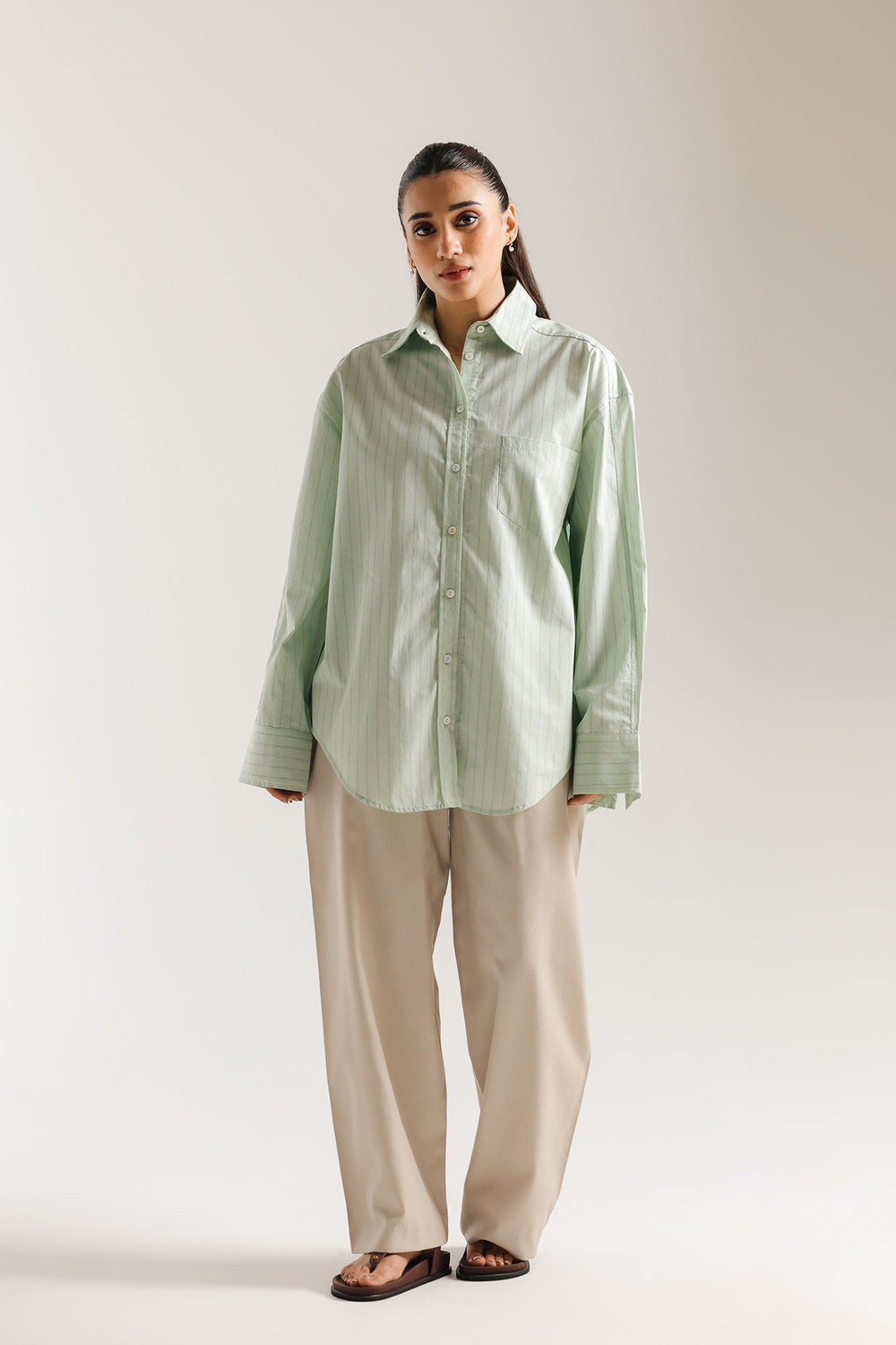 Embrace a look of modern simplicity in this mint green button-down shirt, featuring a relaxed, oversized silhouette and a classic pointed collar. The design is distinguished by subtle vertical pinstripes and a single patch pocket on the chest, adding a functional yet understated detail. The shirt features long, full sleeves with structured cuffs and a curved hemline, enhancing its effortless and contemporary feel.