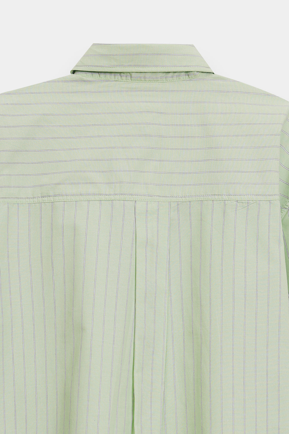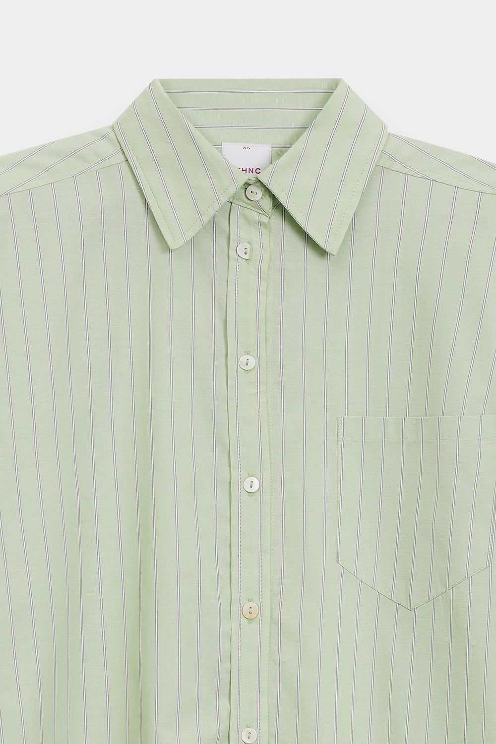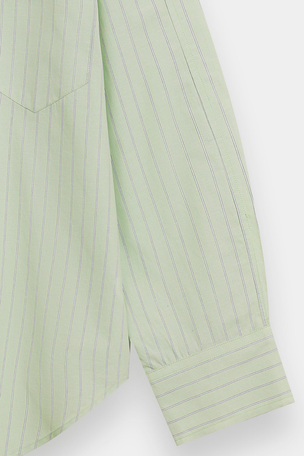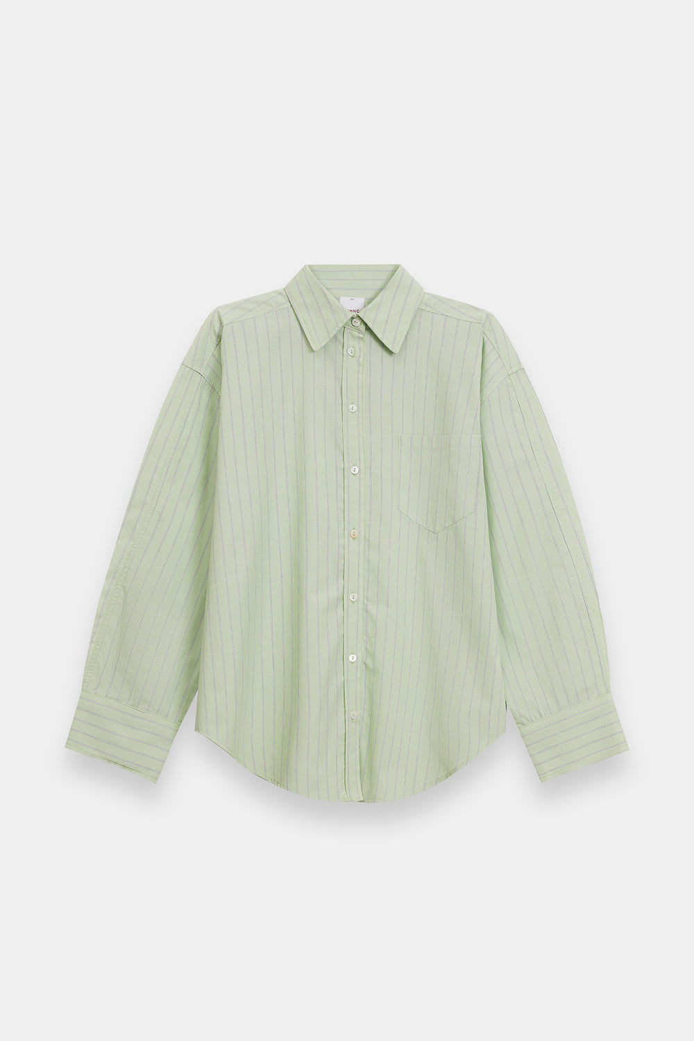 Embrace a look of modern simplicity in this mint green button-down shirt, featuring a relaxed, oversized silhouette and a classic pointed collar. The design is distinguished by subtle vertical pinstripes and a single patch pocket on the chest, adding a functional yet understated detail. The shirt features long, full sleeves with structured cuffs and a curved hemline, enhancing its effortless and contemporary feel.