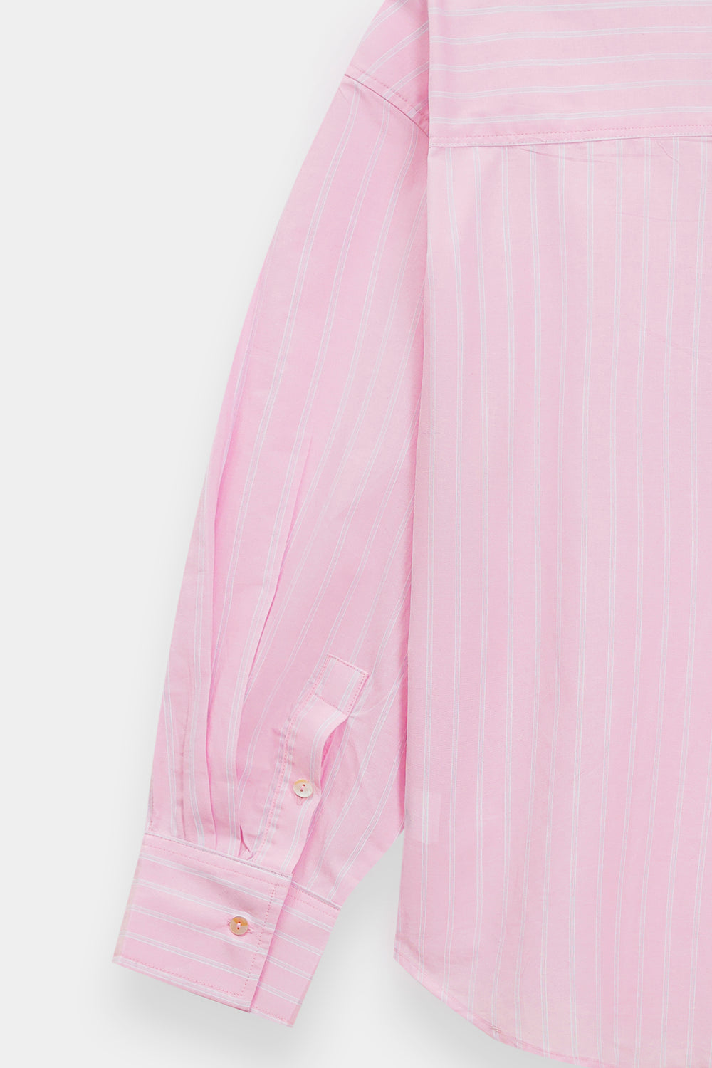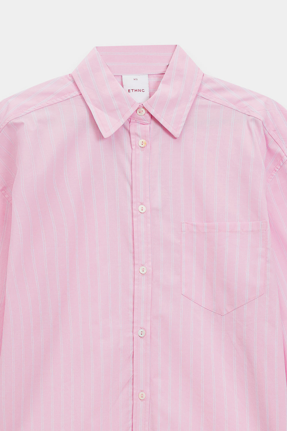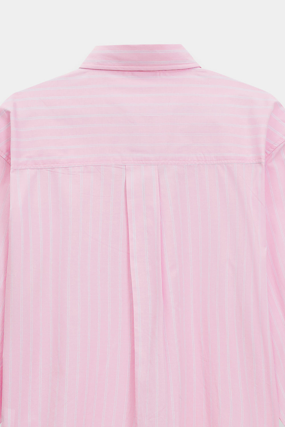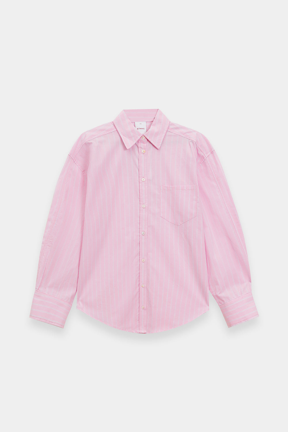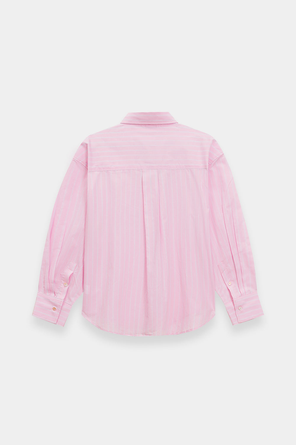 Embrace a look of modern simplicity in this cream pink button-down shirt, featuring a relaxed, oversized silhouette and a classic pointed collar. The design is distinguished by subtle vertical pinstripes and a single patch pocket on the chest, adding a functional yet understated detail. The shirt features long, full sleeves with structured cuffs and a curved hemline, enhancing its effortless and contemporary feel.