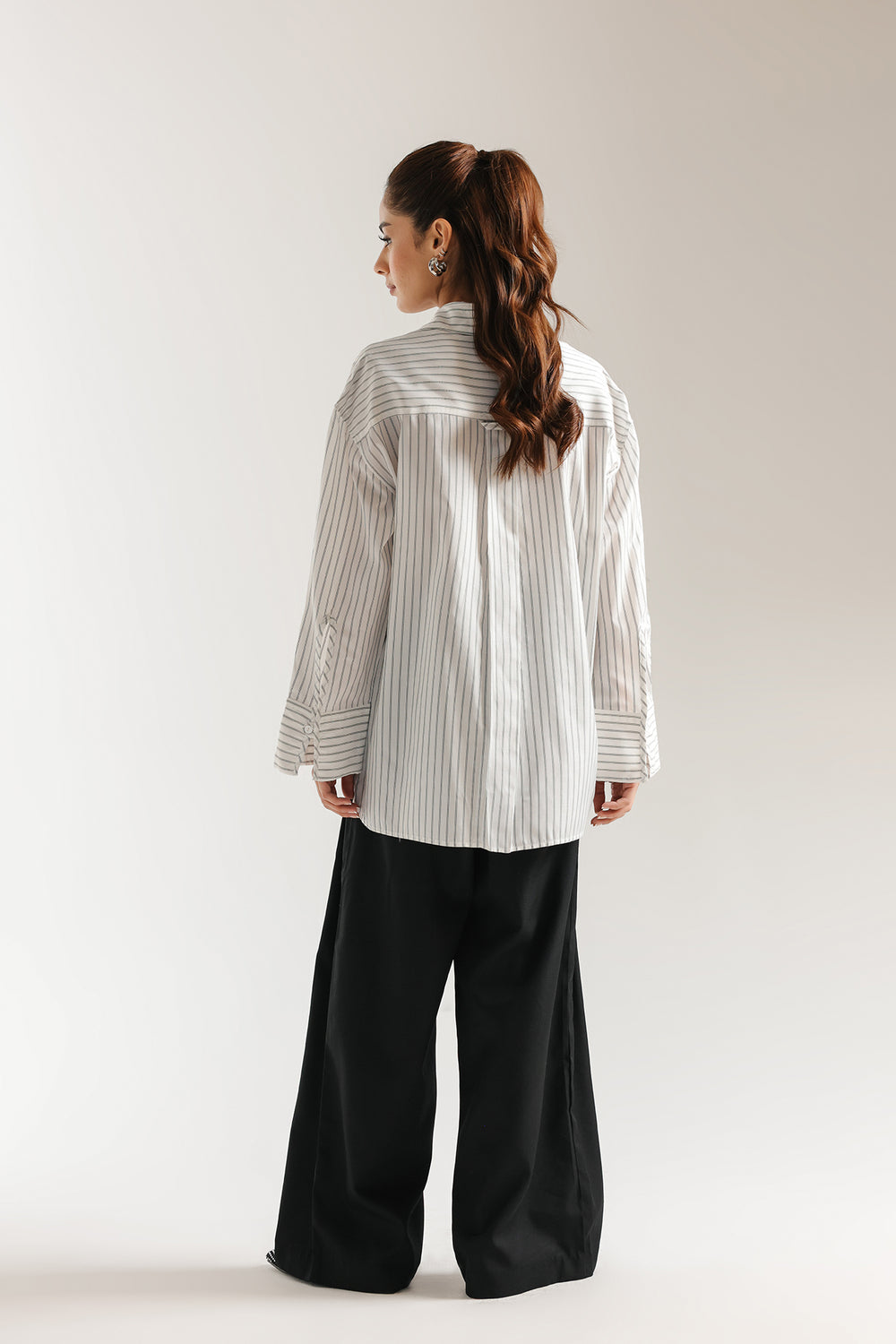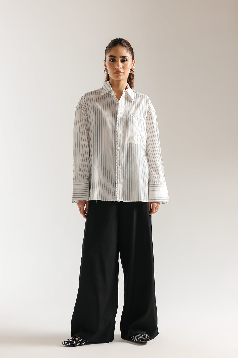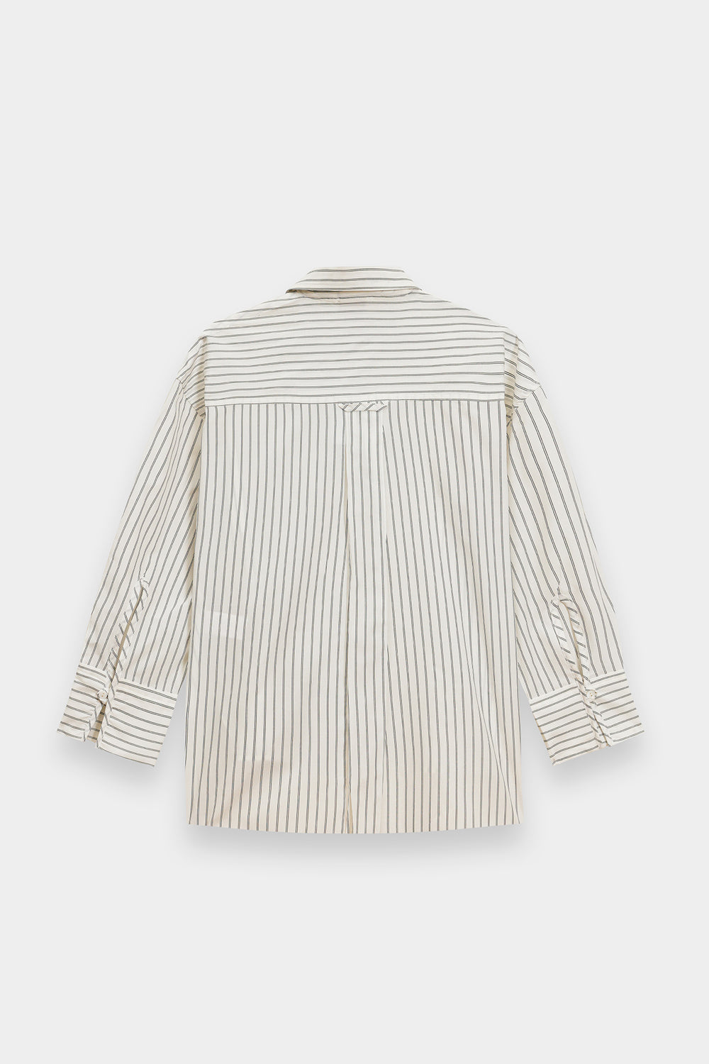 Exude effortless modernity in this crisp white button-down shirt, a masterclass in clean lines and contemporary tailoring. This straight fit silhouette features vertical pinstripes and a sharp pointed collar, creating a refined aesthetic that balances professional polish with relaxed comfort. The design is elevated by structured, wide-cuff sleeves, making it a versatile essential for a sophisticated, minimalist wardrobe.