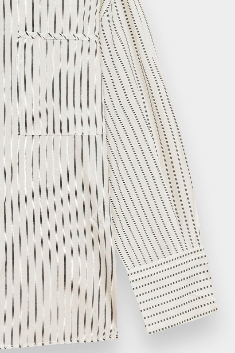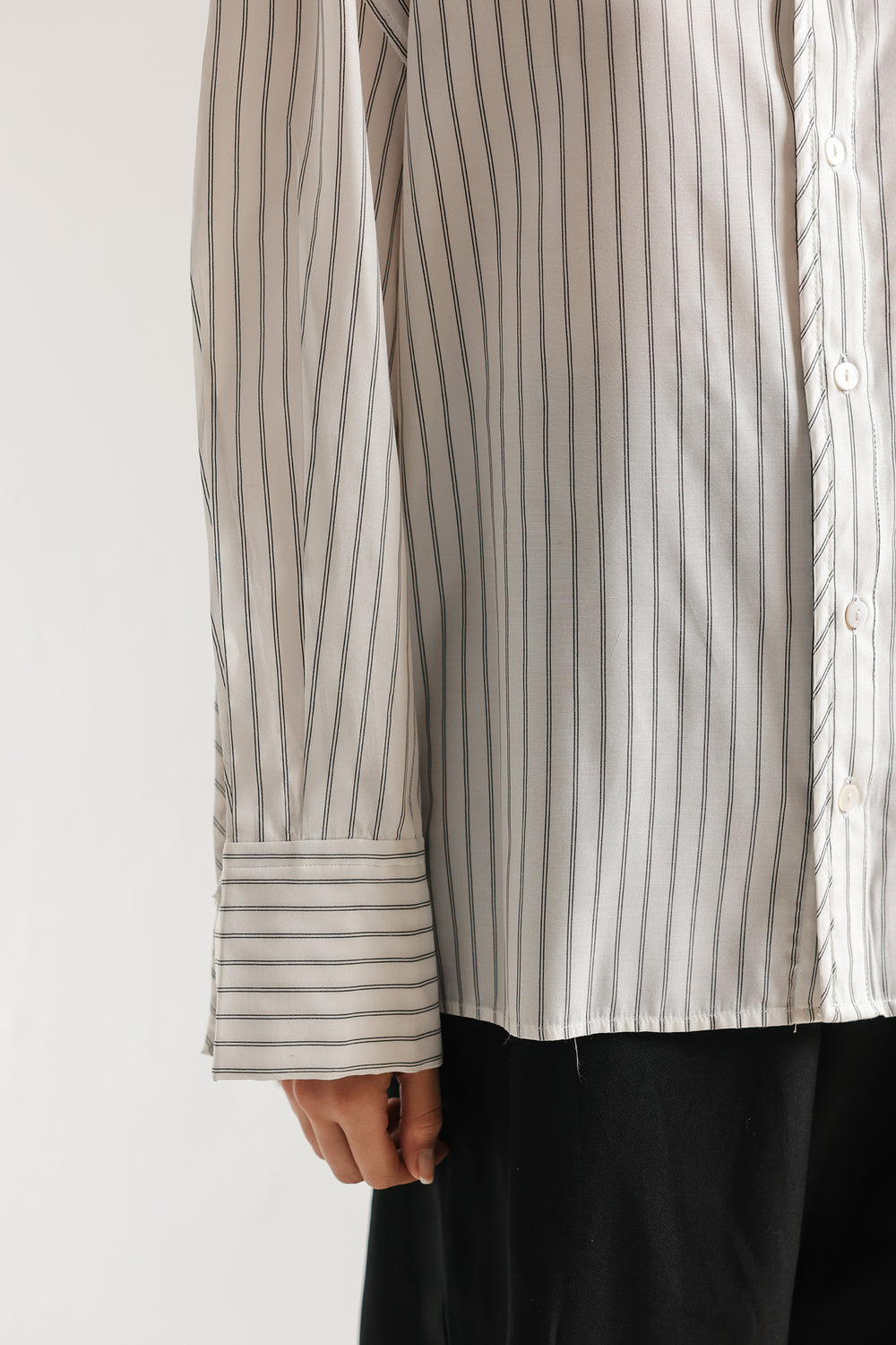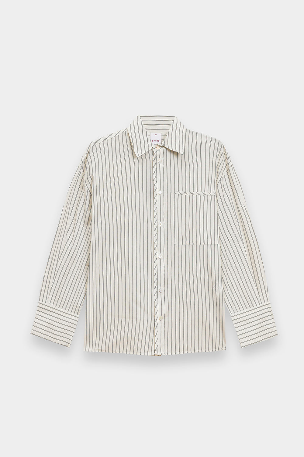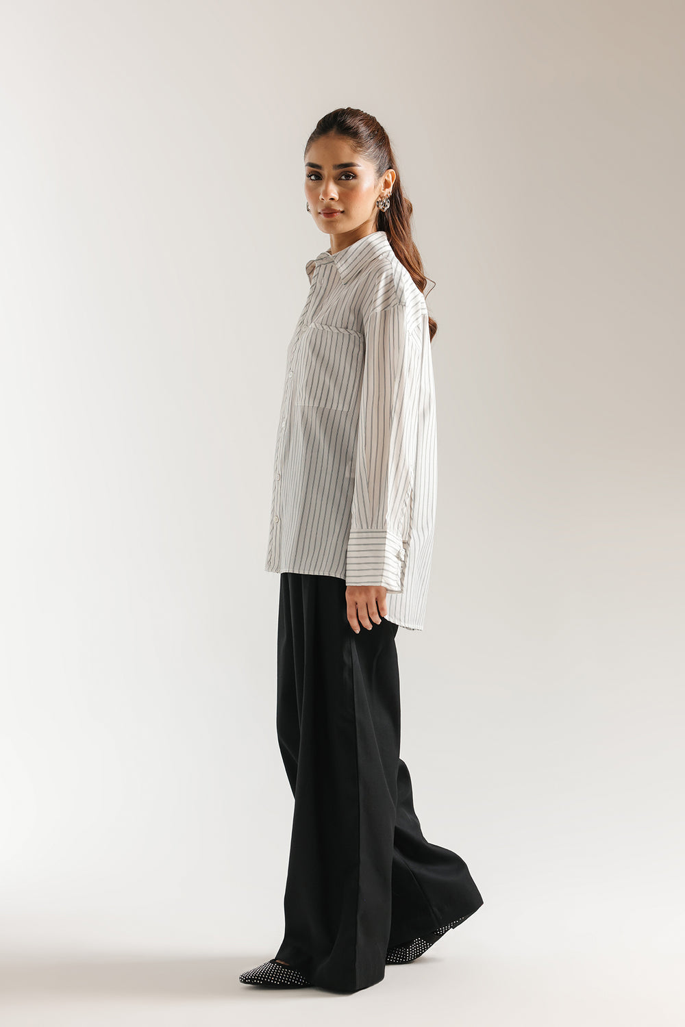 Exude effortless modernity in this crisp white button-down shirt, a masterclass in clean lines and contemporary tailoring. This straight fit silhouette features vertical pinstripes and a sharp pointed collar, creating a refined aesthetic that balances professional polish with relaxed comfort. The design is elevated by structured, wide-cuff sleeves, making it a versatile essential for a sophisticated, minimalist wardrobe.