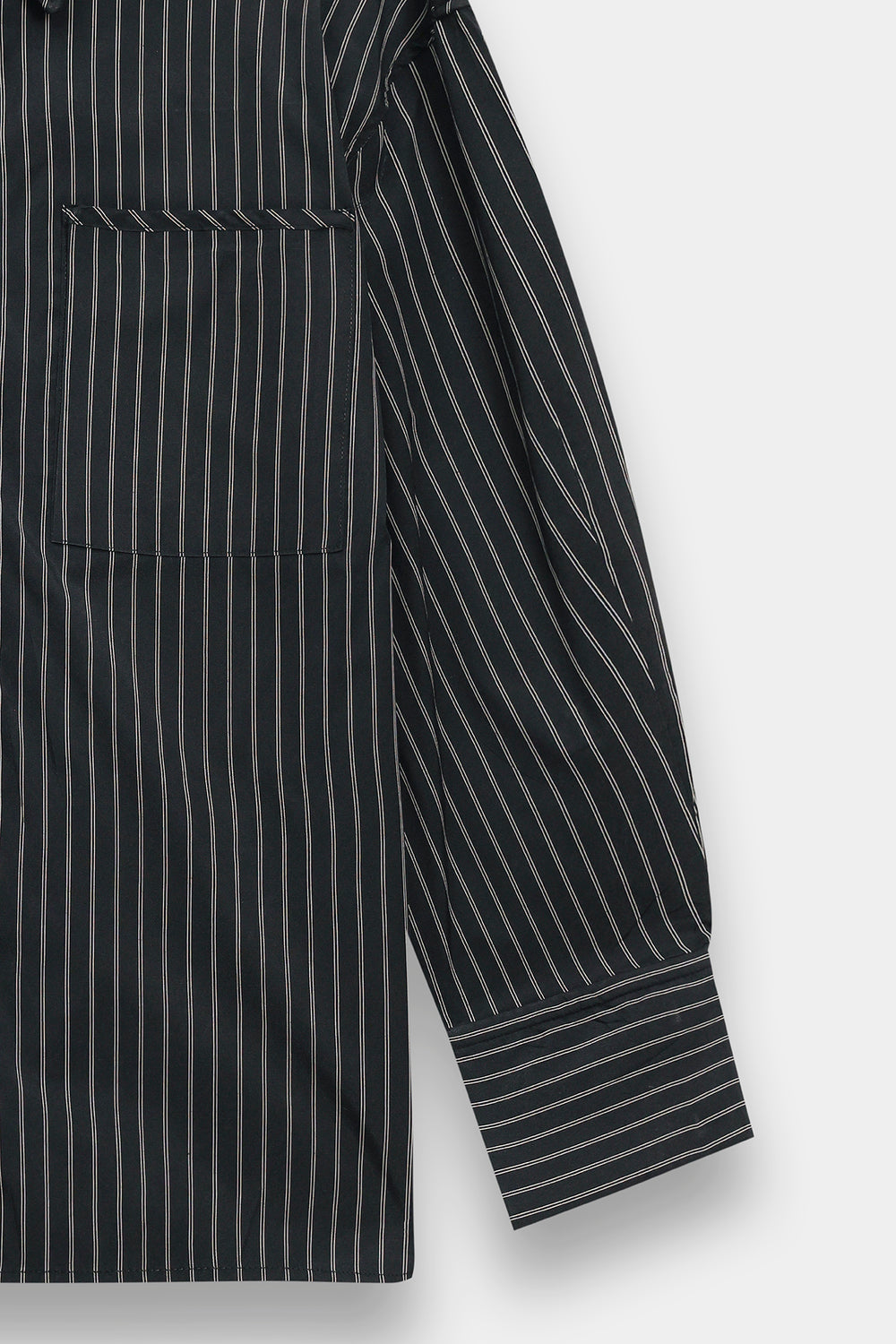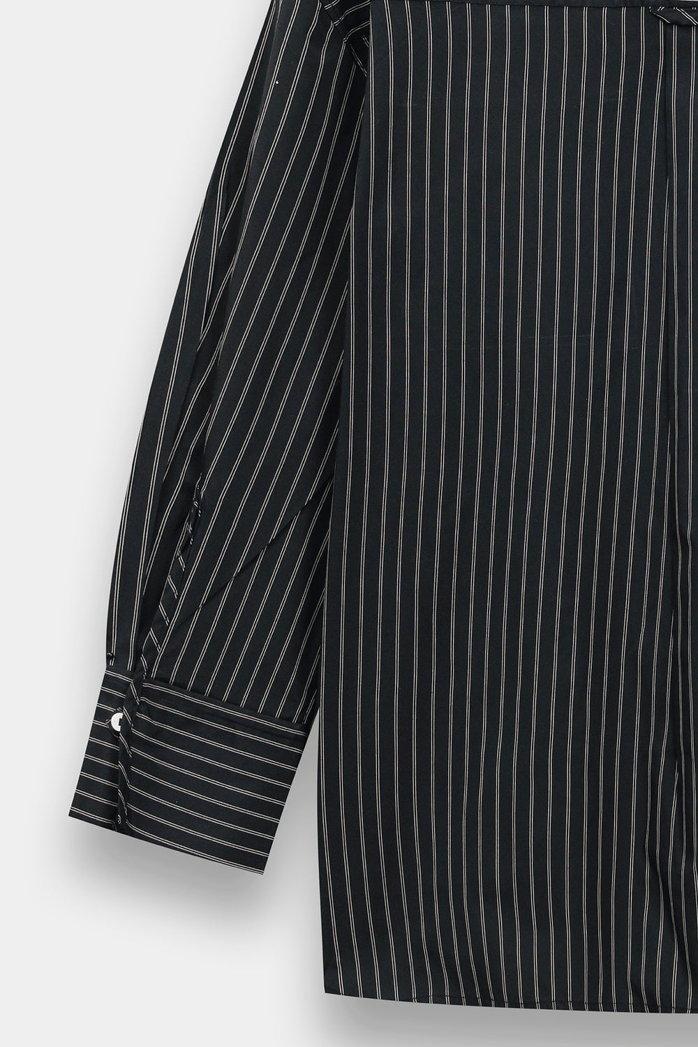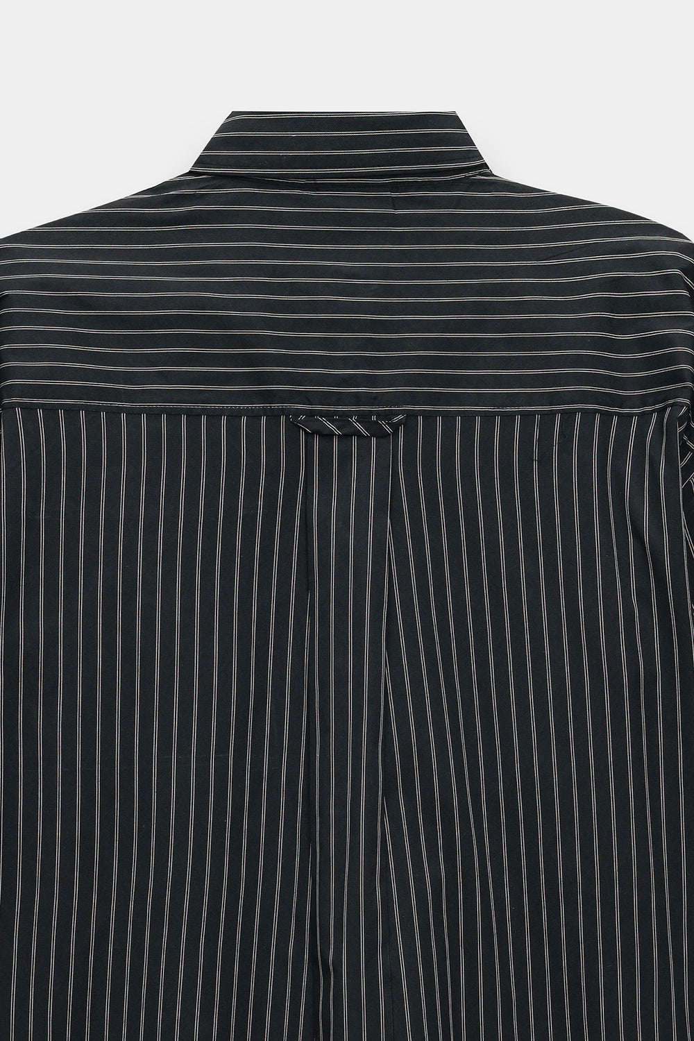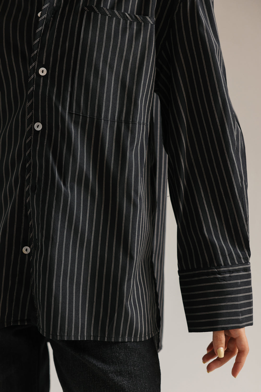 Exude effortless modernity in this crisp black button-down shirt, a masterclass in clean lines and contemporary tailoring. This straight fit silhouette features vertical pinstripes and a sharp pointed collar, creating a refined aesthetic that balances professional polish with relaxed comfort. The design is elevated by structured, wide-cuff sleeves, making it a versatile essential for a sophisticated, minimalist wardrobe.