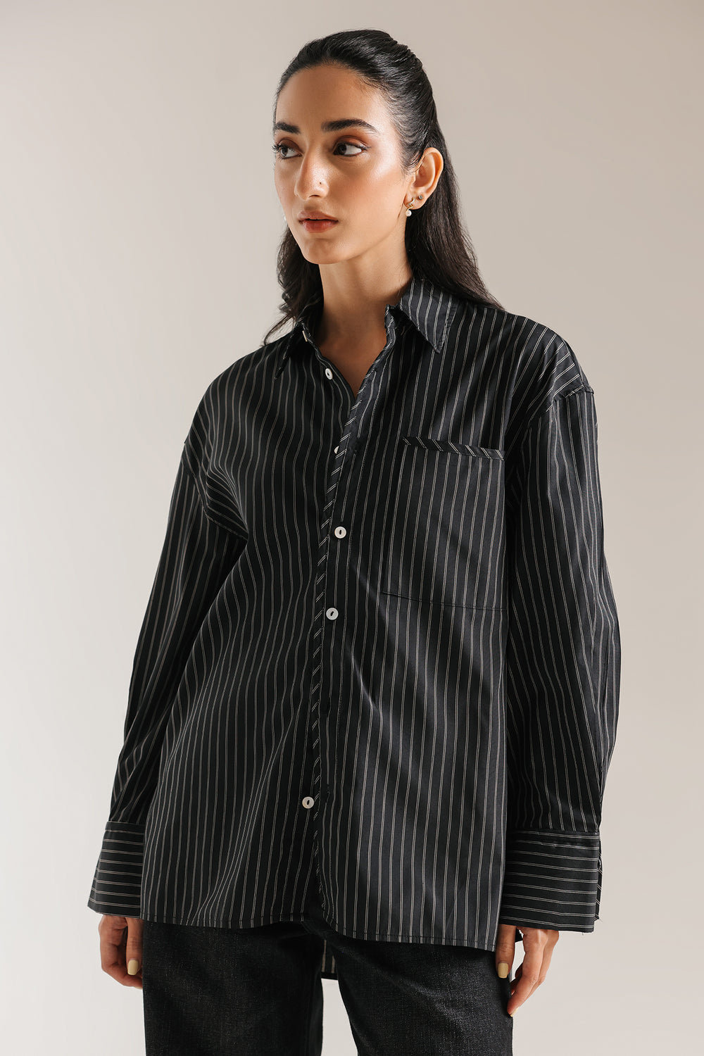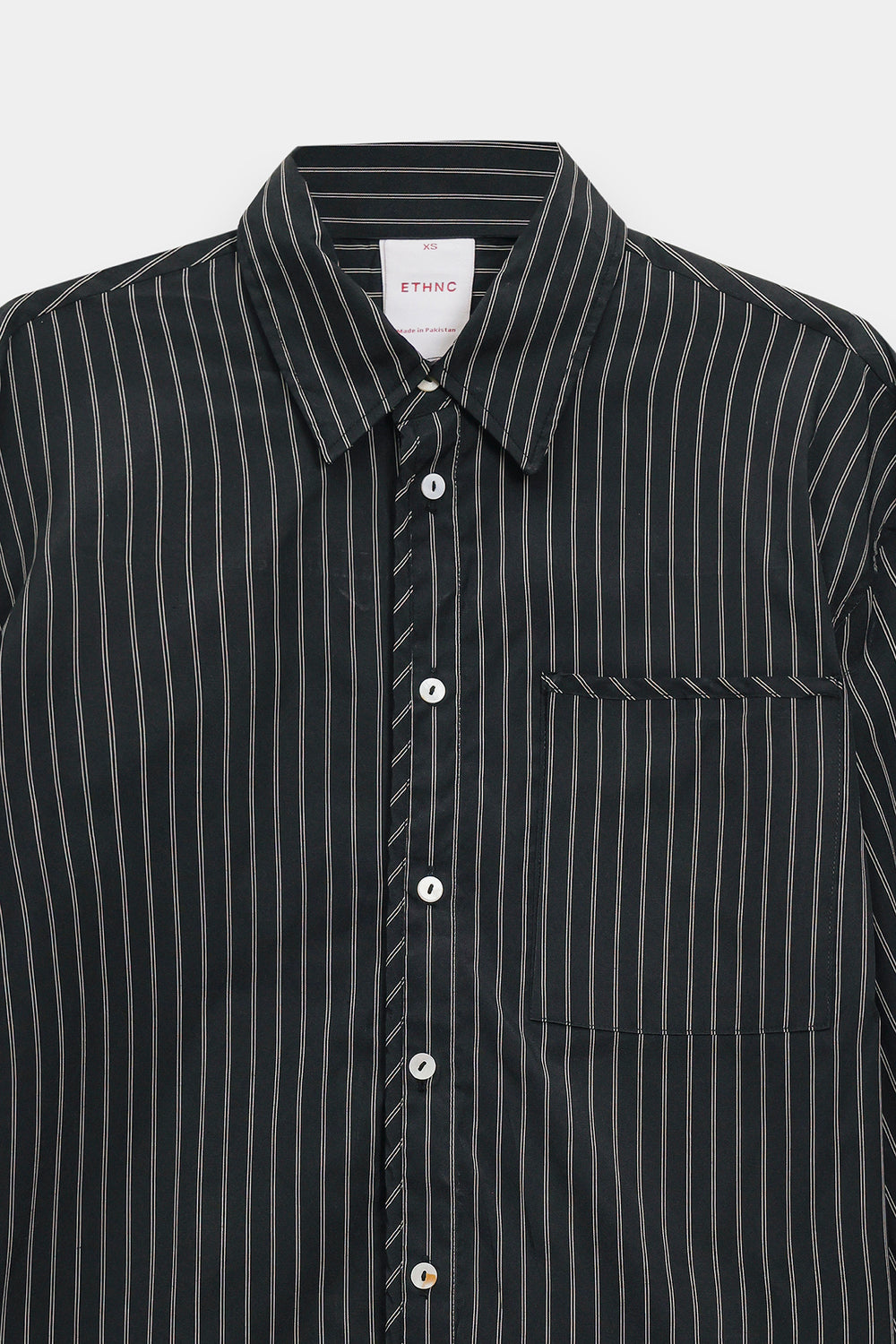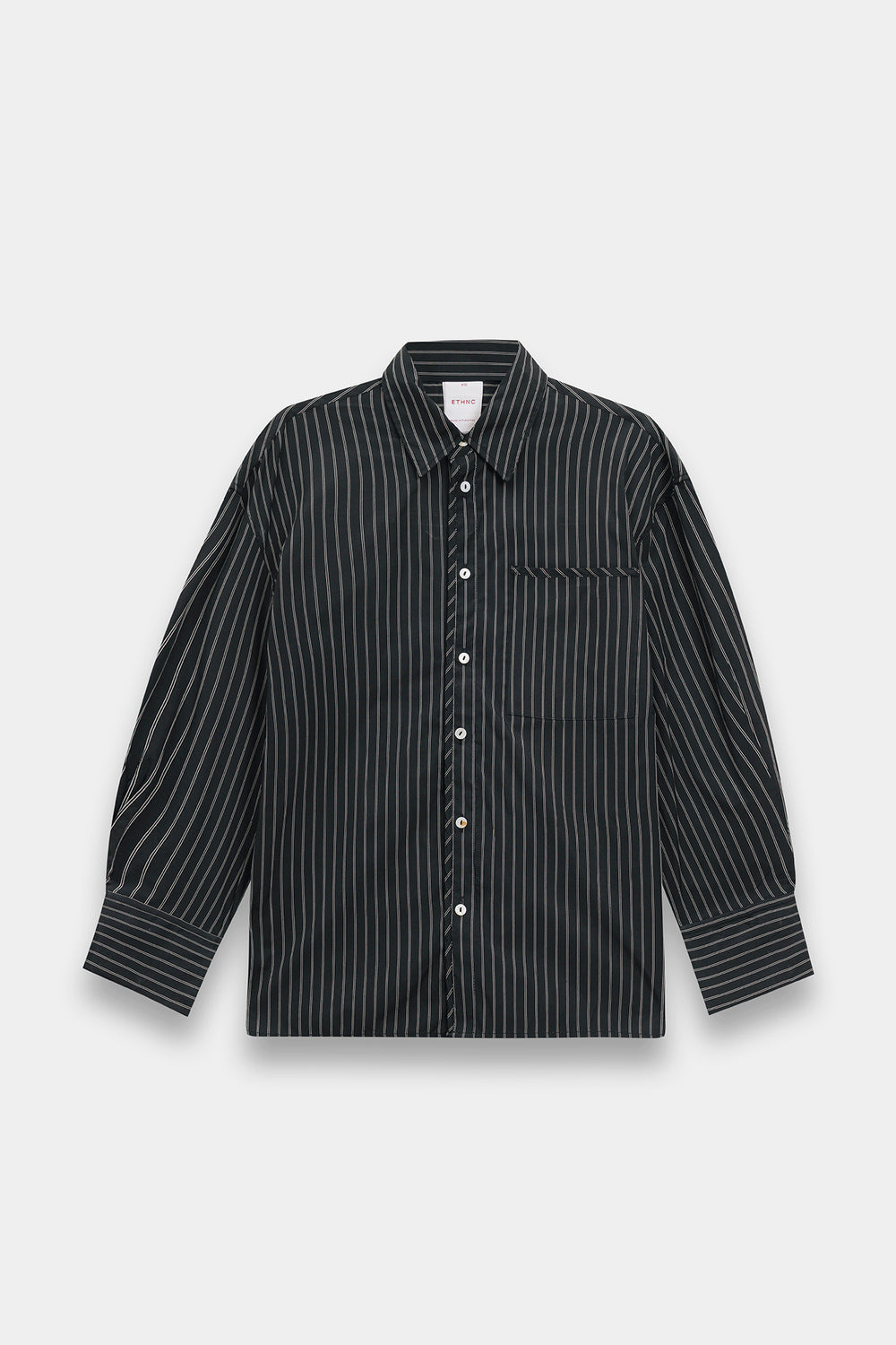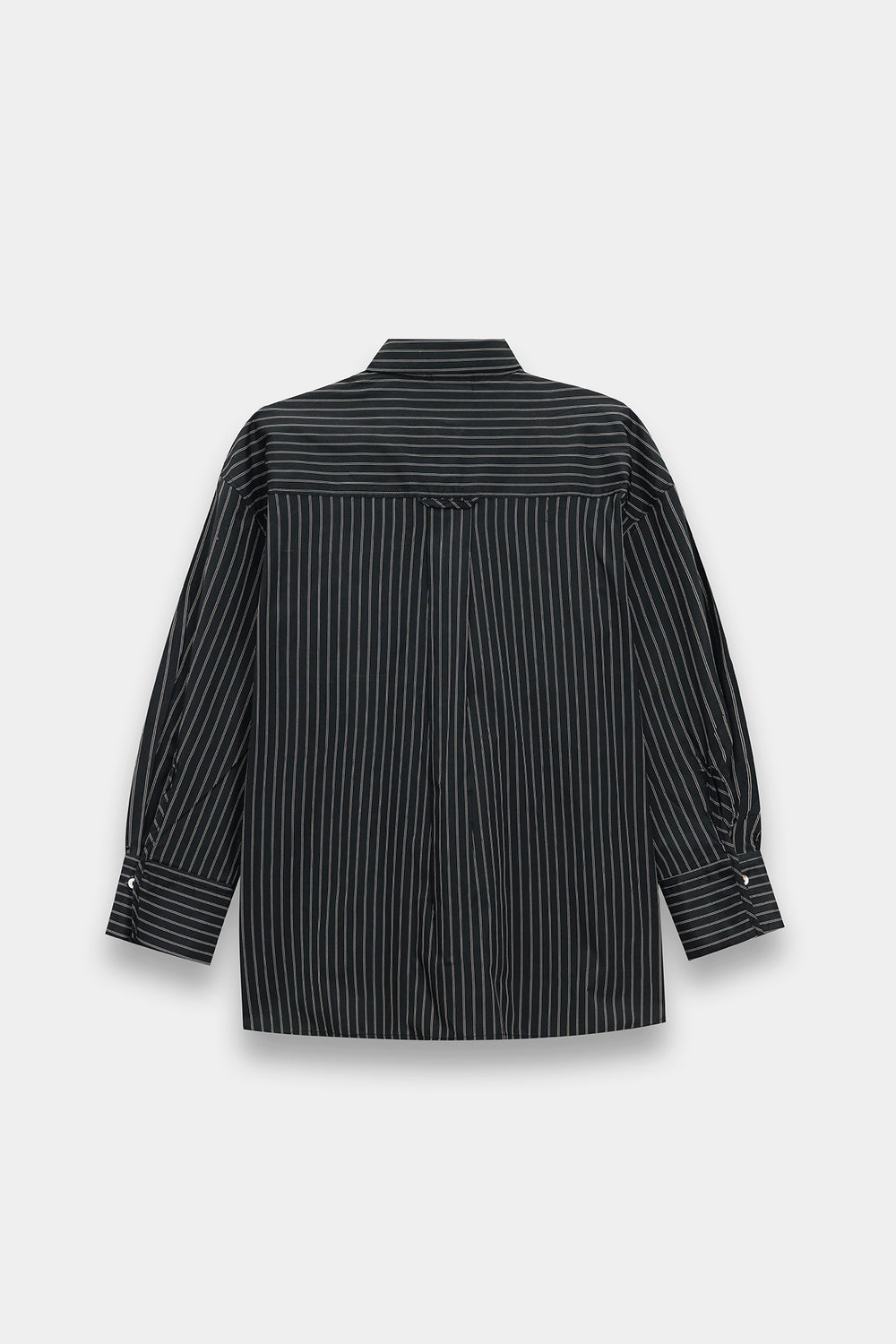 Exude effortless modernity in this crisp black button-down shirt, a masterclass in clean lines and contemporary tailoring. This straight fit silhouette features vertical pinstripes and a sharp pointed collar, creating a refined aesthetic that balances professional polish with relaxed comfort. The design is elevated by structured, wide-cuff sleeves, making it a versatile essential for a sophisticated, minimalist wardrobe.