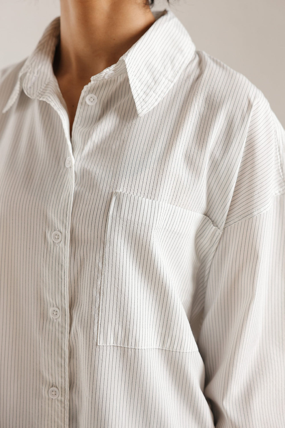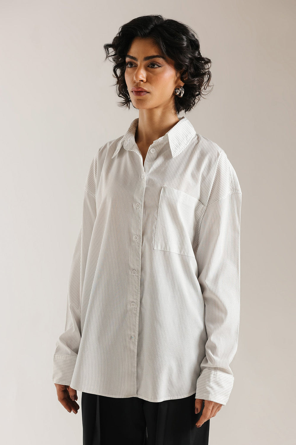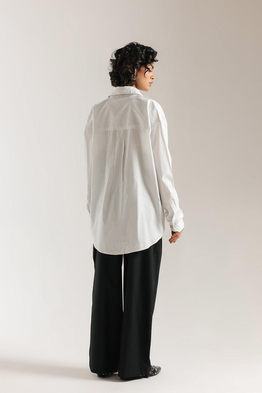 This classic button-down shirt is rendered in a crisp white fabric featuring subtle, fine vertical stripes for a touch of refined texture. Designed with a relaxed, oversized fit, it includes a sharp pointed collar, a functional front patch pocket, and dropped shoulders that flow into long sleeves with adjustable button cuffs. The lightweight, breathable material and clean silhouette make it a versatile staple for both polished professional looks and effortless casual styling.
