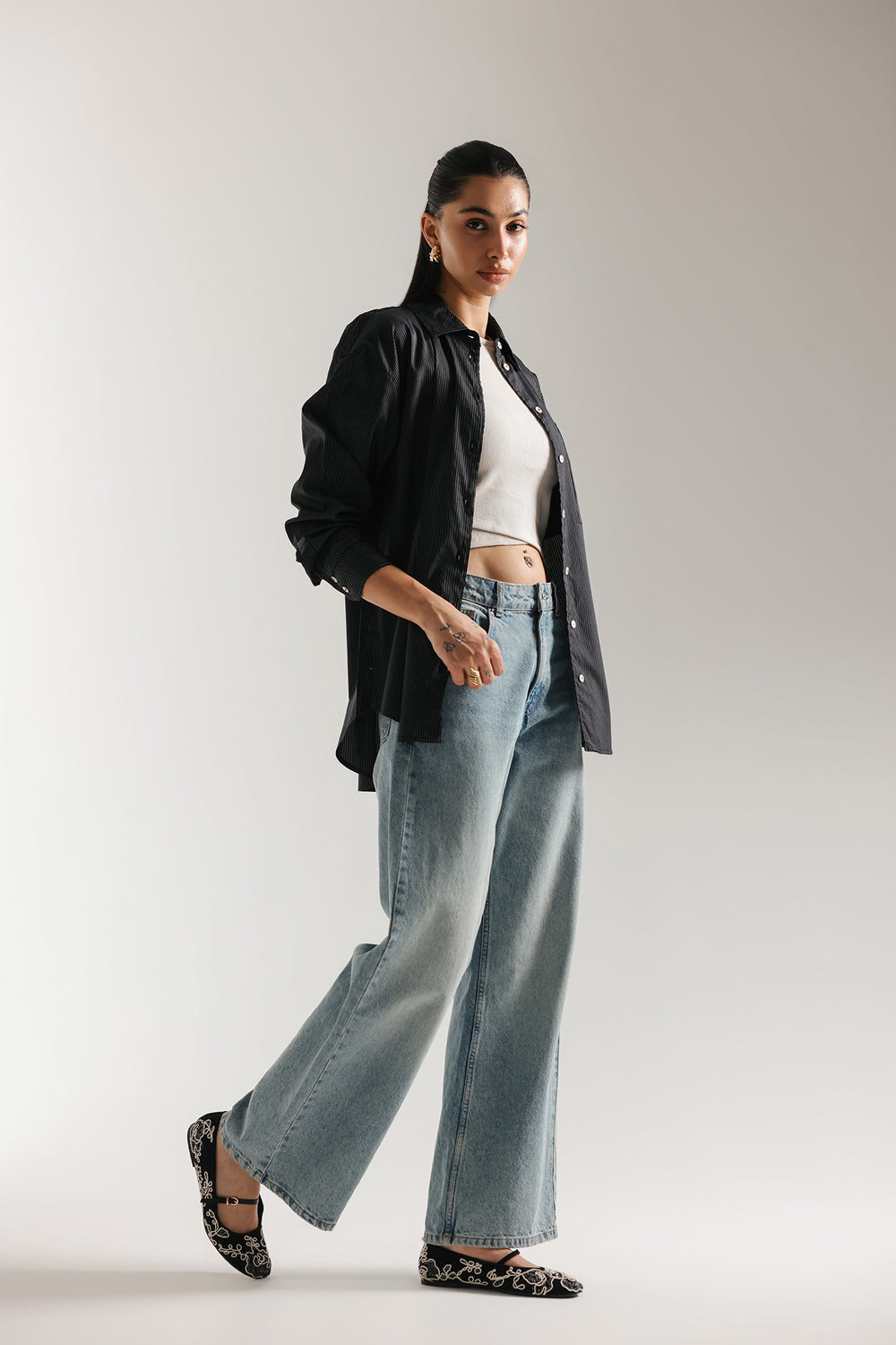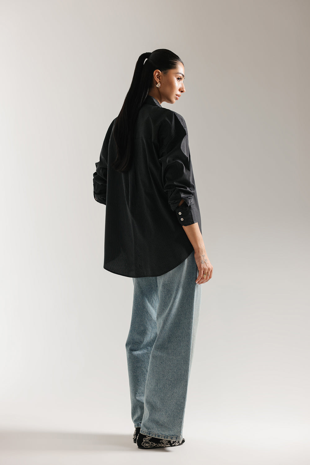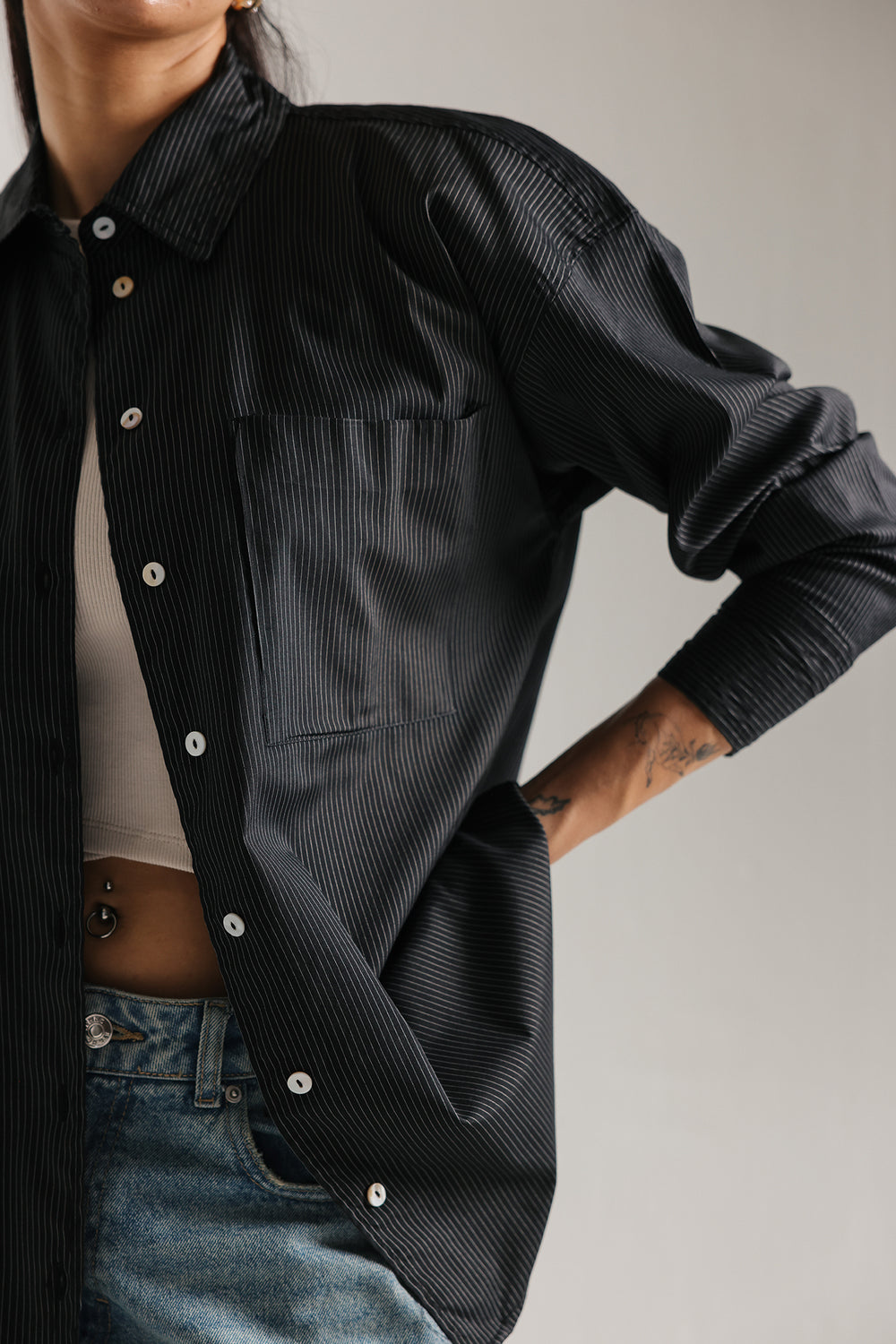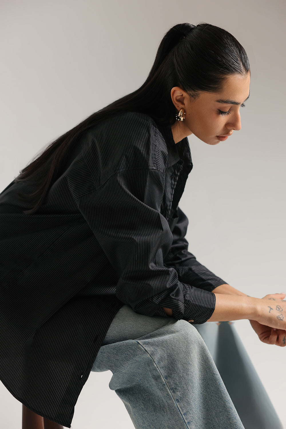 This classic button-down shirt is rendered in a crisp black fabric featuring subtle, fine vertical stripes for a touch of refined texture. Designed with a relaxed, oversized fit, it includes a sharp pointed collar, a functional front patch pocket, and dropped shoulders that flow into long sleeves with adjustable button cuffs. The lightweight, breathable material and clean silhouette make it a versatile staple for both polished professional looks and effortless casual styling.