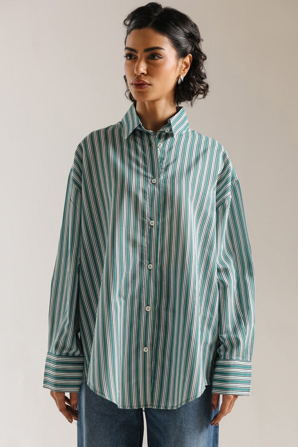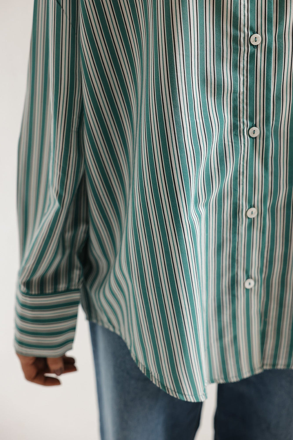 Embrace a fusion of contemporary tailoring and graphic artistry with this striking oversized shirt. Defined by a bold vertical stripe pattern in dark sea green palette, this piece offers a fresh take on modern neutrals. The unique, irregular lines create a dynamic visual texture that feels both organic and polished, making it a standout addition to any curated wardrobe.