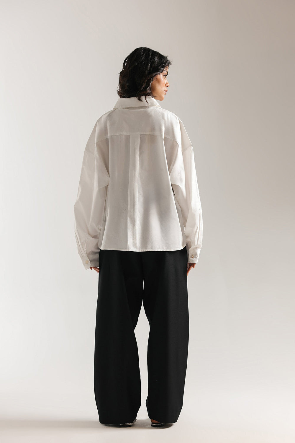 Make a clean and modern statement with this crisp white shirt, designed with a contemporary oversized fit. The design is elevated by a scattered arrangement of shimmering silver-toned studs and floral-inspired embellishments across the front and sleeves. It features a classic pointed collar and a functional button-down placket with ivory-toned buttons for a polished finish. With its drop-shoulder long sleeves and wide-tailored cuffs, this piece offers a relaxed yet sophisticated silhouette that effortlessly bridges the gap between casual and formal wear.