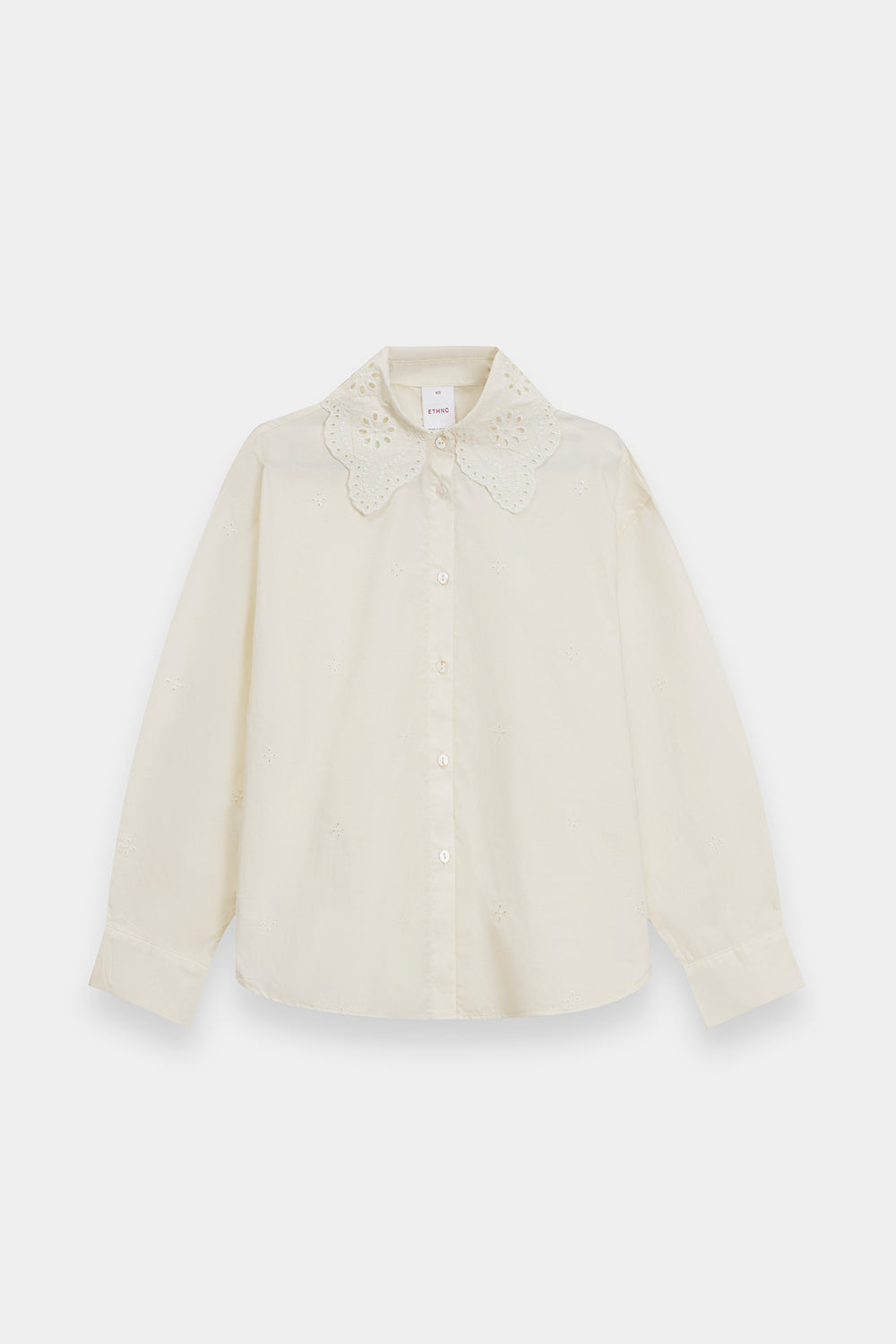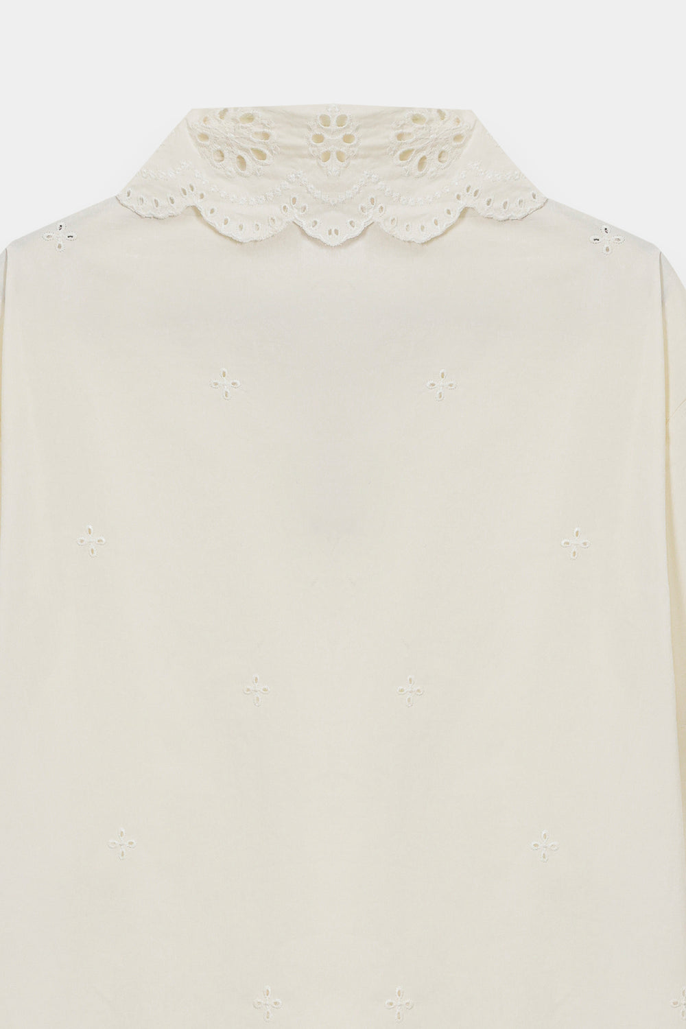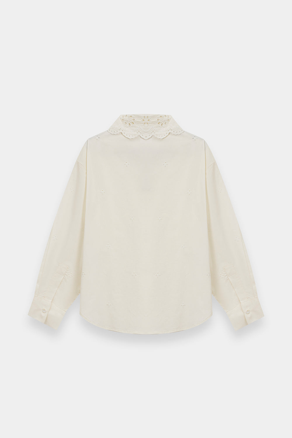 Elevate your casual wardrobe with this white cotton shirt, a charming blend of vintage inspiration and modern simplicity. The highlight is an oversized collar featuring intricate floral eyelet embroidery and a delicate scalloped edge. Scattered eyelet motifs across the bodice add subtle texture, while the classic button-down front and structured cuffs ensure a polished, clean-cut finish.