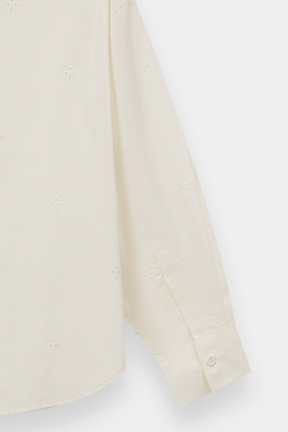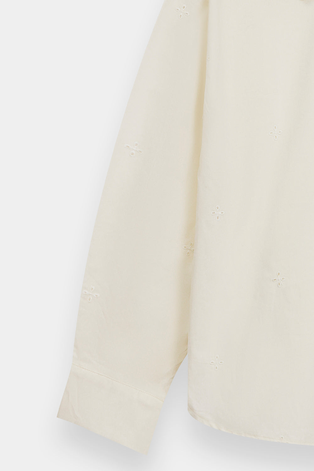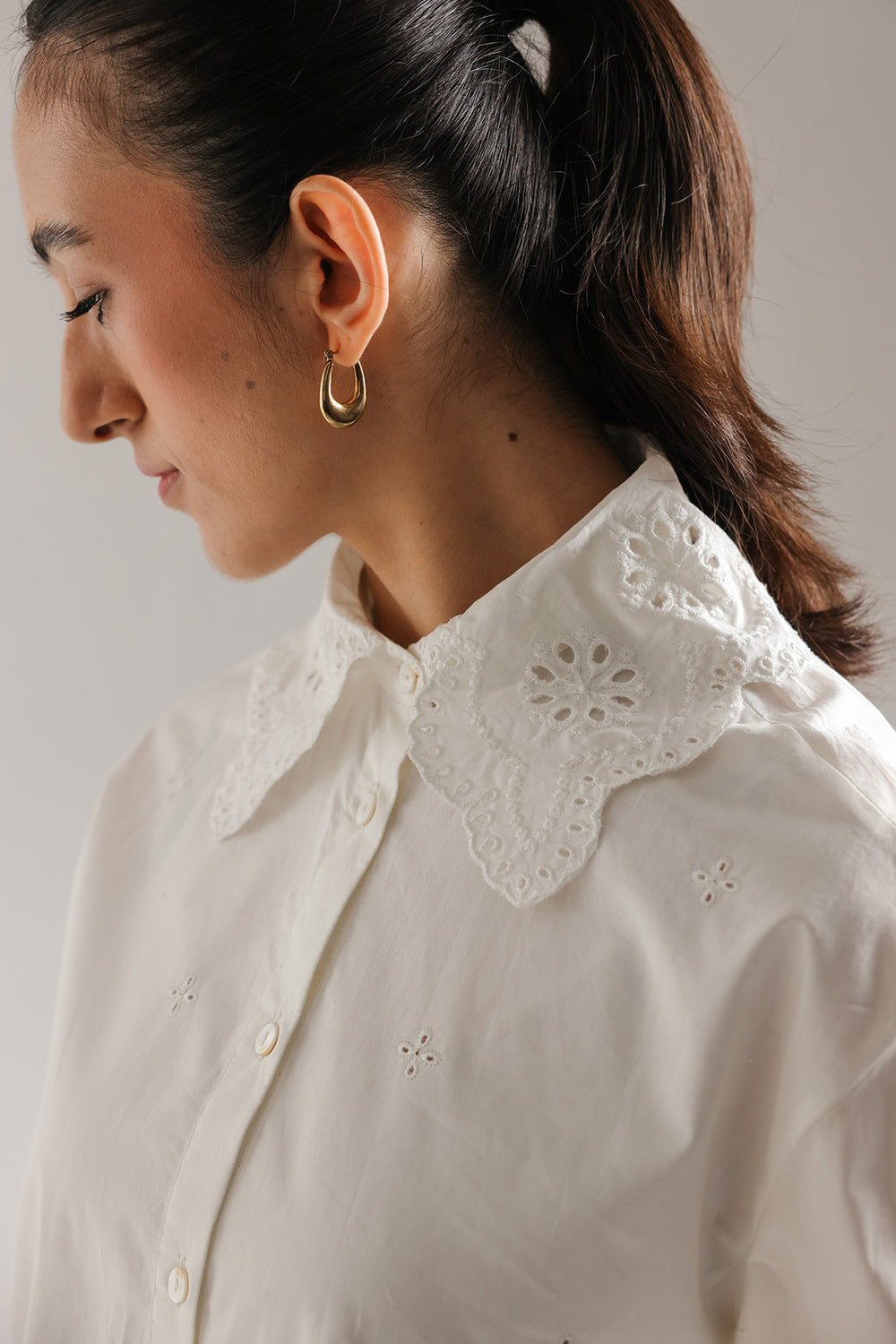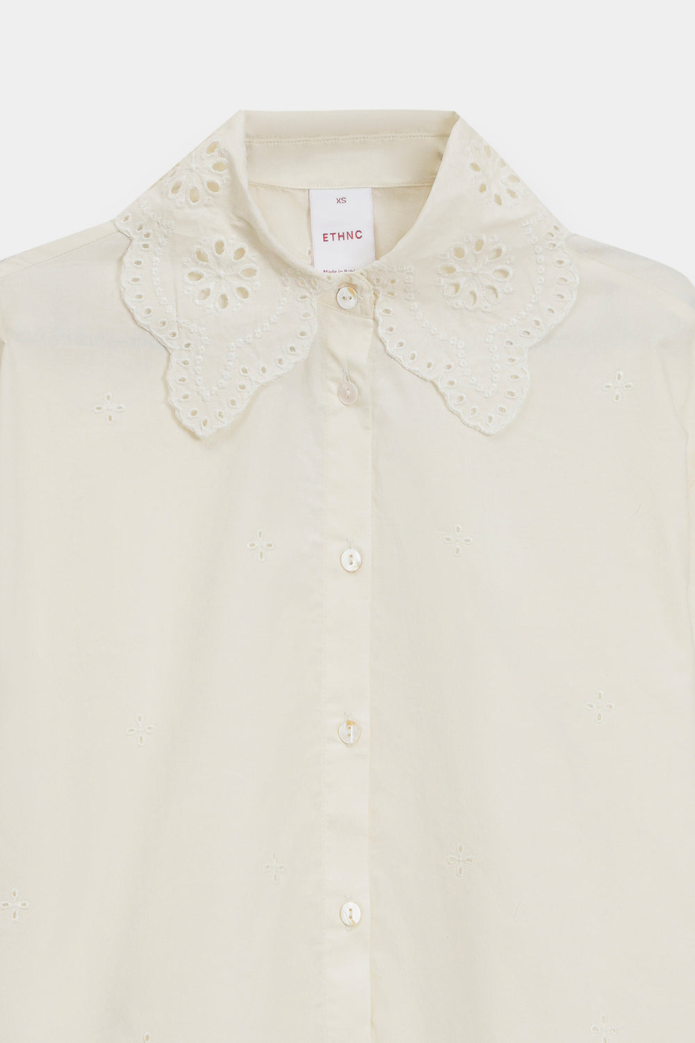 Elevate your casual wardrobe with this white cotton shirt, a charming blend of vintage inspiration and modern simplicity. The highlight is an oversized collar featuring intricate floral eyelet embroidery and a delicate scalloped edge. Scattered eyelet motifs across the bodice add subtle texture, while the classic button-down front and structured cuffs ensure a polished, clean-cut finish.