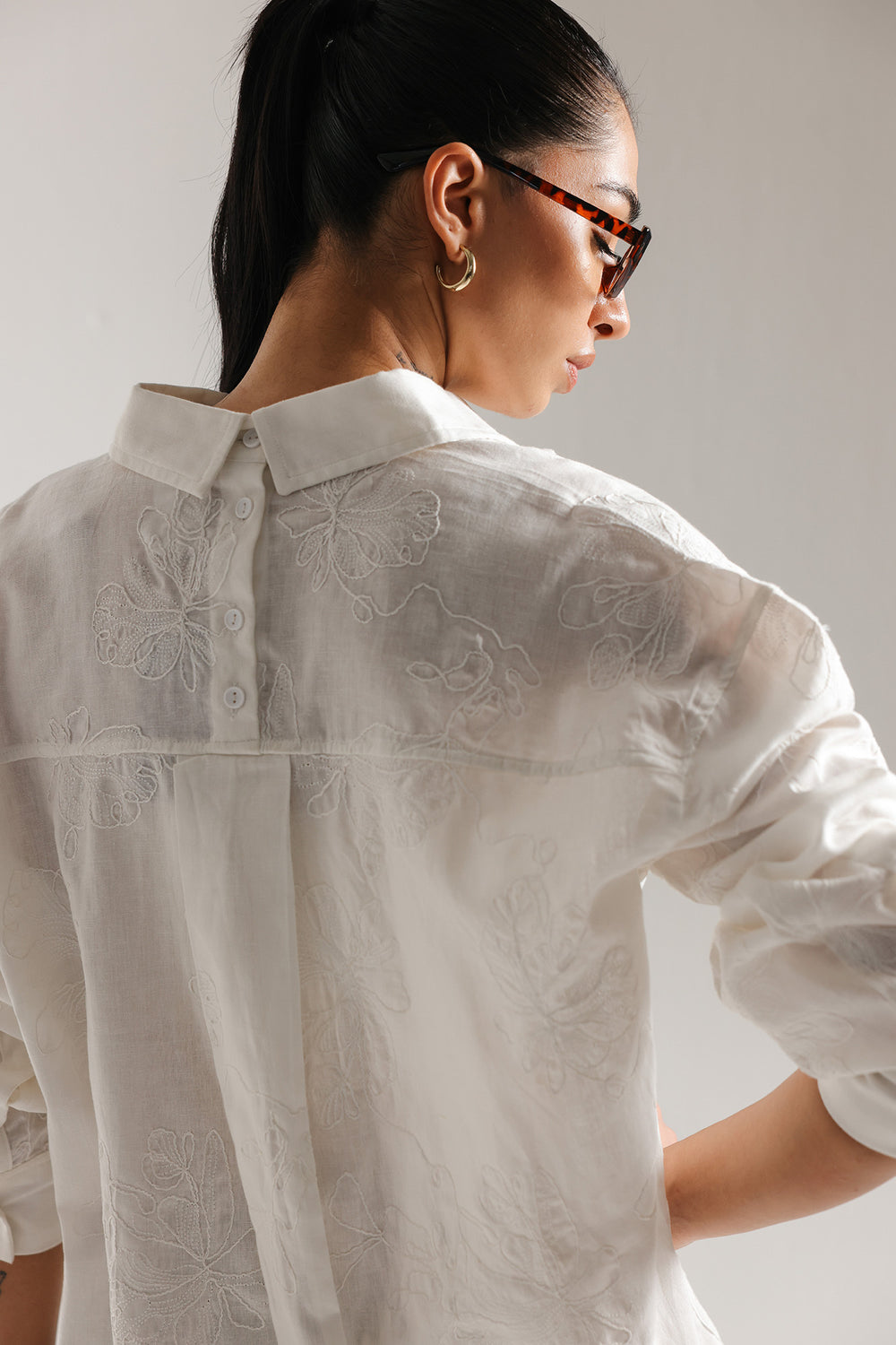 Step into a world of understated luxury with this white cotton shirt, a masterclass in delicate tonal artistry. The crisp white canvas is elevated by intricate white-on-white floral embroidery that dances across the bodice, offering a subtle yet sophisticated texture. With its relaxed, oversized fit, classic button-down front, and sharp collar, this piece effortlessly blends modern comfort with timeless feminine charm. It is the perfect versatile essential for a polished, ethereal daytime look.
