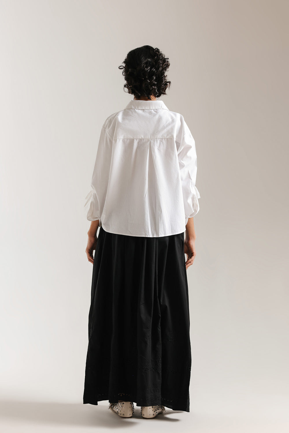 This classic black skirt is a masterpiece of ethereal grace and meticulous craftsmanship, designed for those who appreciate the beauty of understated luxury. The floor-sweeping silhouette is crafted from a lightweight fabric that offers a fluid, airy drape, ensuring elegance with every step. Its serene black canvas is elevated by intricate tone-on-tone embroidery and delicate eyelet detailing that adorns the lower panels, creating a rich, artisanal texture. Featuring a voluminous A-line cut that provides both comfort and a regal presence, this skirt serves as a versatile statement piece. Whether paired with a crisp button-down for a modern, monochromatic look or a more ornate top for a festive occasion, this skirt is a timeless addition to any sophisticated wardrobe.