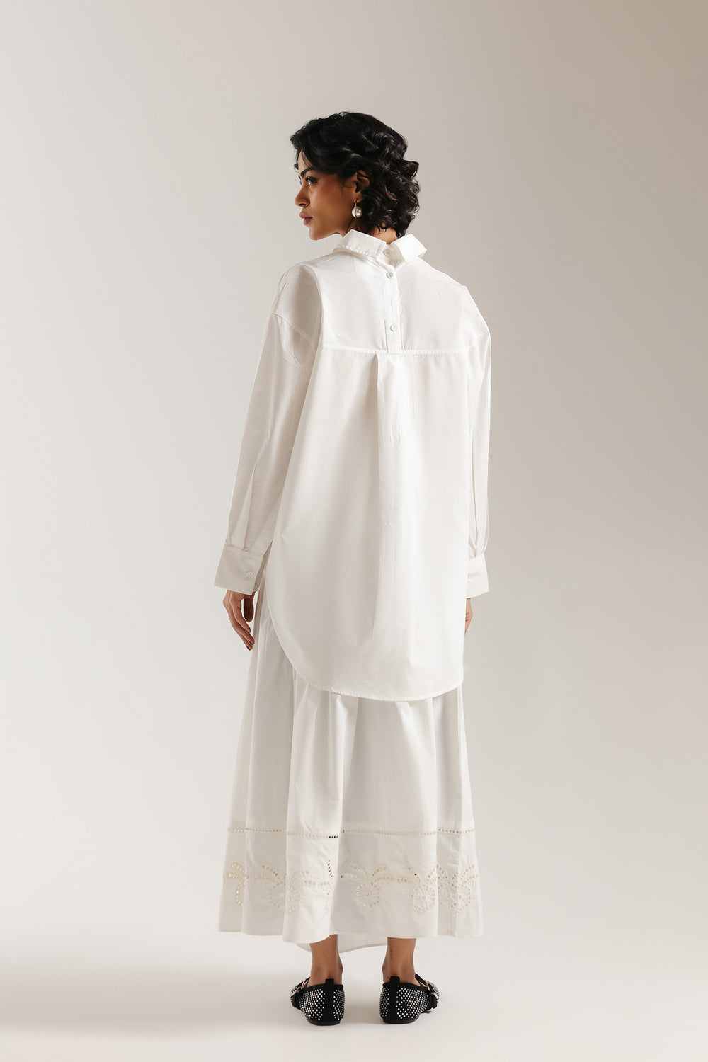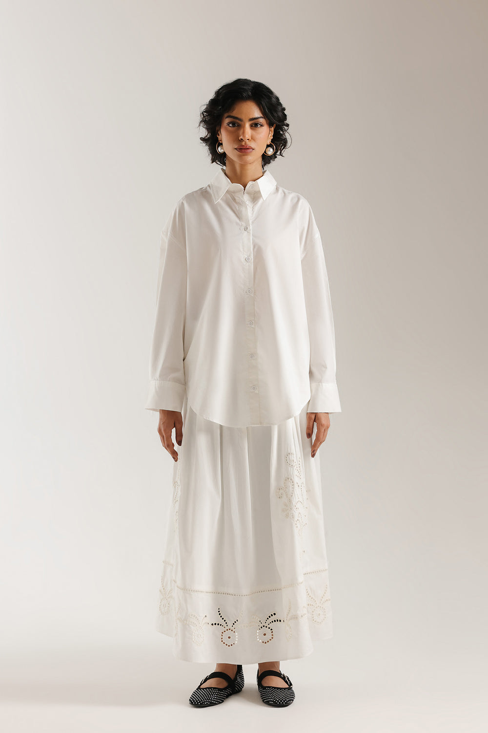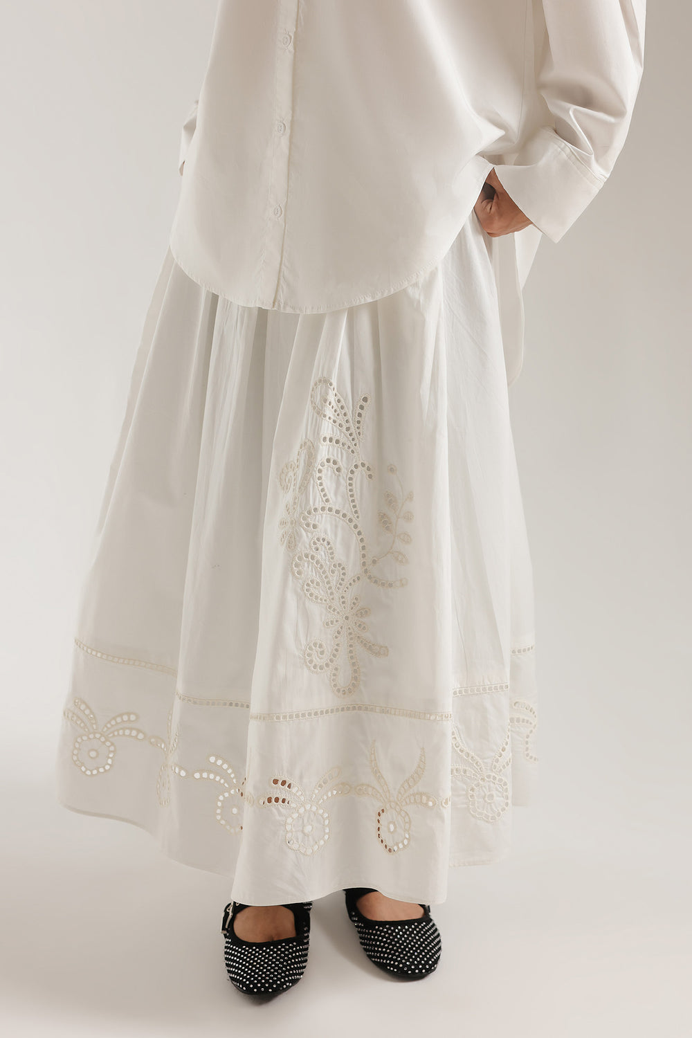 This ethereal white skirt is a masterpiece of timeless grace, blending a serene ivory canvas with intricate artisanal details for a truly elevated aesthetic. Crafted from a lightweight, breathable fabric, the floor-sweeping A-line silhouette offers a fluid and airy drape that ensures elegance with every movement. The design is enriched by a stunning display of tone-on-tone embroidery and delicate eyelet needlework that creates a rich, textured border along the lower panels. Featuring a comfortable waist and voluminous cut, this skirt serves as a versatile statement piece that transitions effortlessly from a polished daytime look to a sophisticated evening ensemble.