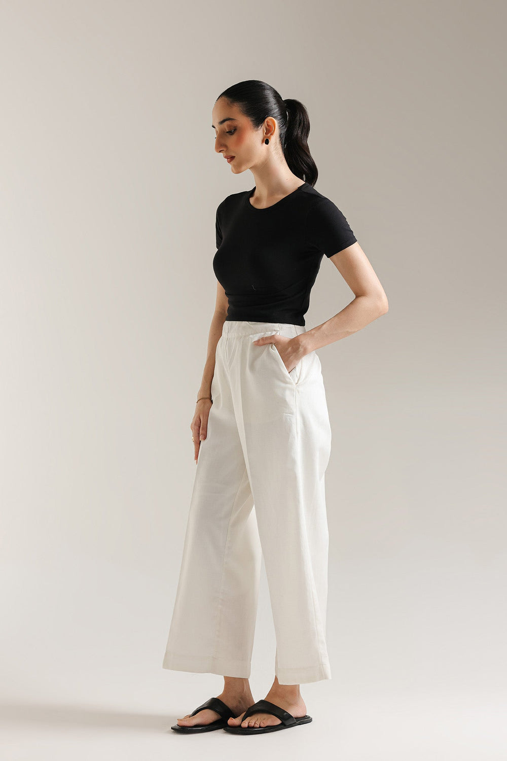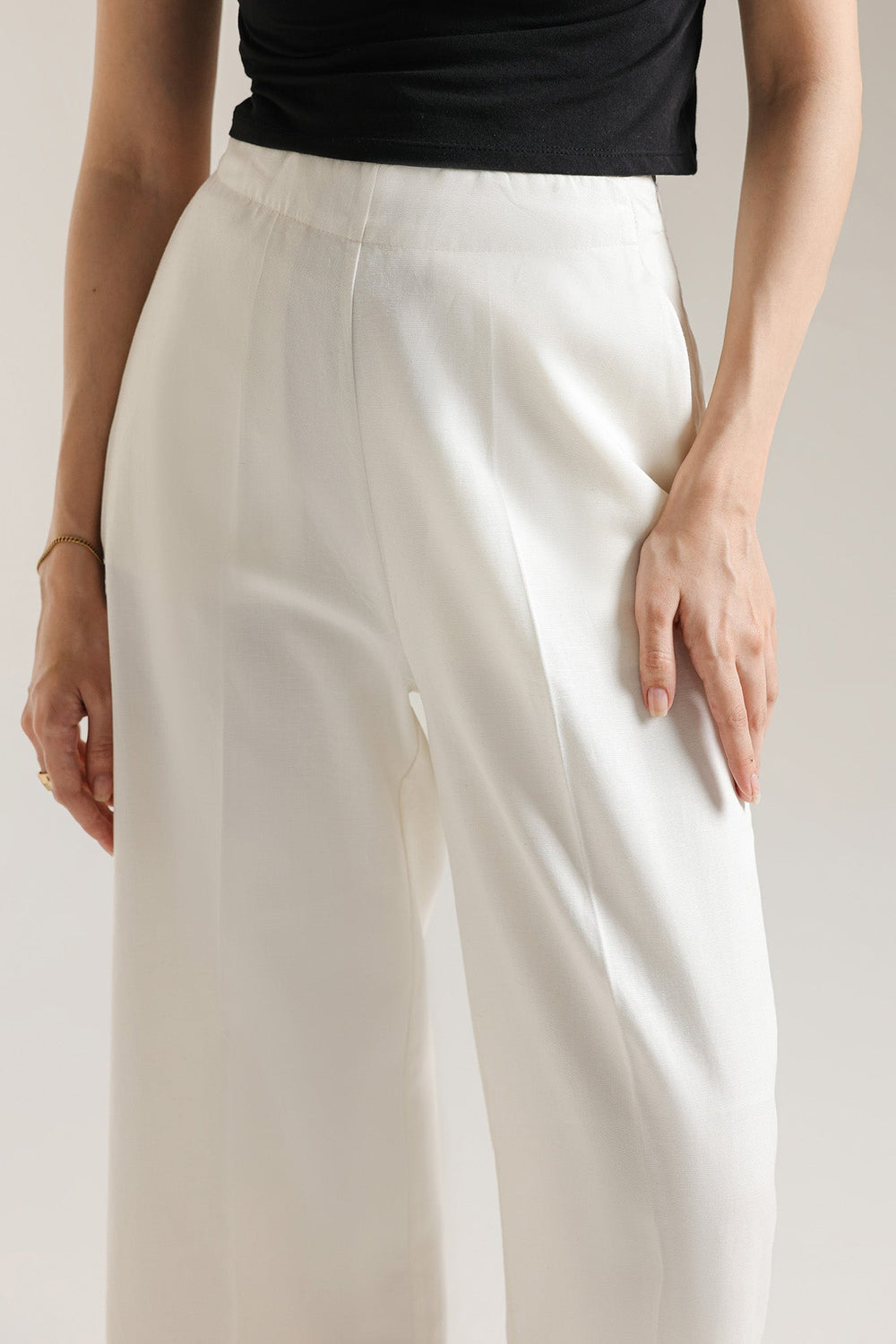 Elevate your everyday style with these effortlessly chic white trousers, designed for both comfort and a fresh, clean aesthetic. Featuring a flattering wide-leg silhouette and elegant pleating at the waist, they offer a relaxed yet refined drape. Crafted from a soft and versatile fabric, these trousers are perfect for pairing with a variety of tops, making them an essential addition to your wardrobe for any casual or smart-casual occasion.